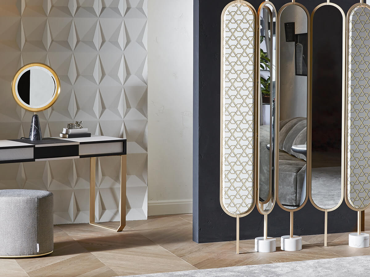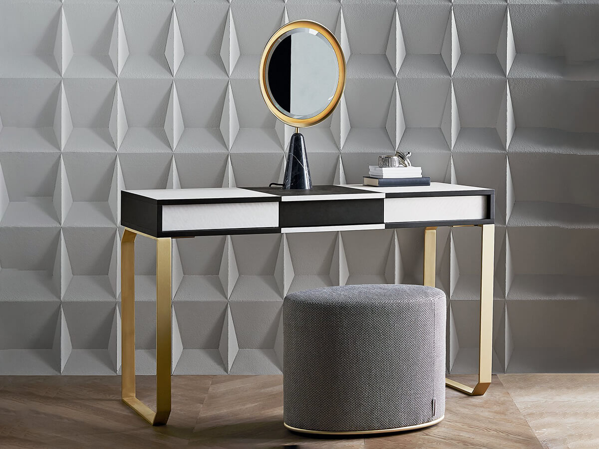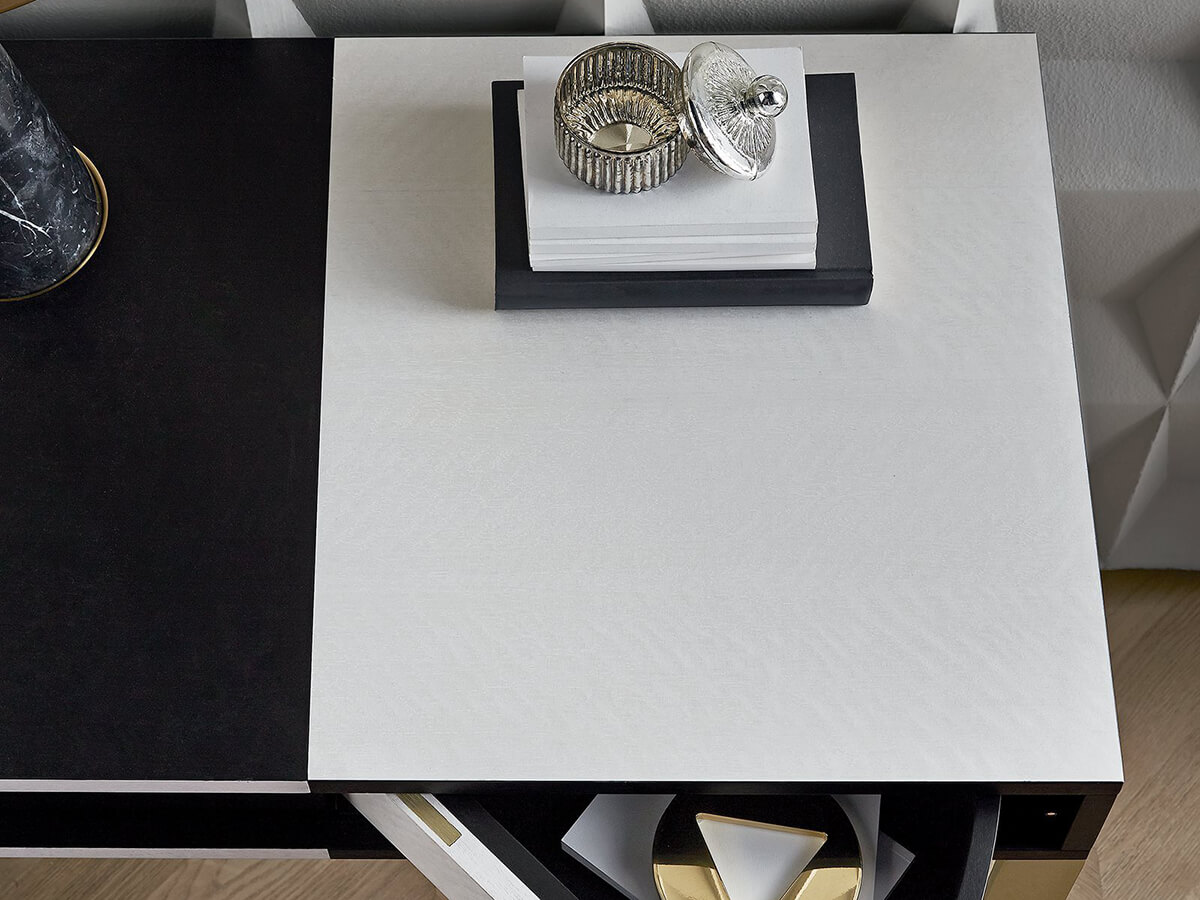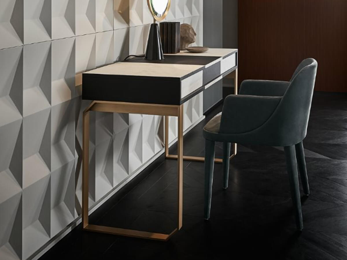 The Selene vanity desk bears the signature of a refined and surprising designer like Pietro Russo and recalls the traditional predilection for precious materials and chromatic games of black and white. With a veiled Art Déco inspiration, Selene rests on two scenographic bases in satin brass and sees a geometric alternation of white Taba Frisè wood and black Tanganyika in a suggestive alternating optical effect. The composition is dominated by the Selene mirror (which can also be purchased individually as a decorative object), with a precious black Marquinia marble base. Selene is proposed as an elegant addition to the sleeping area of the house to compose a makeup area that is both practical and luxurious.* Technical features: structure in white taba frisé and black tanganika, metal parts lacquered in satin brass and mirror with light