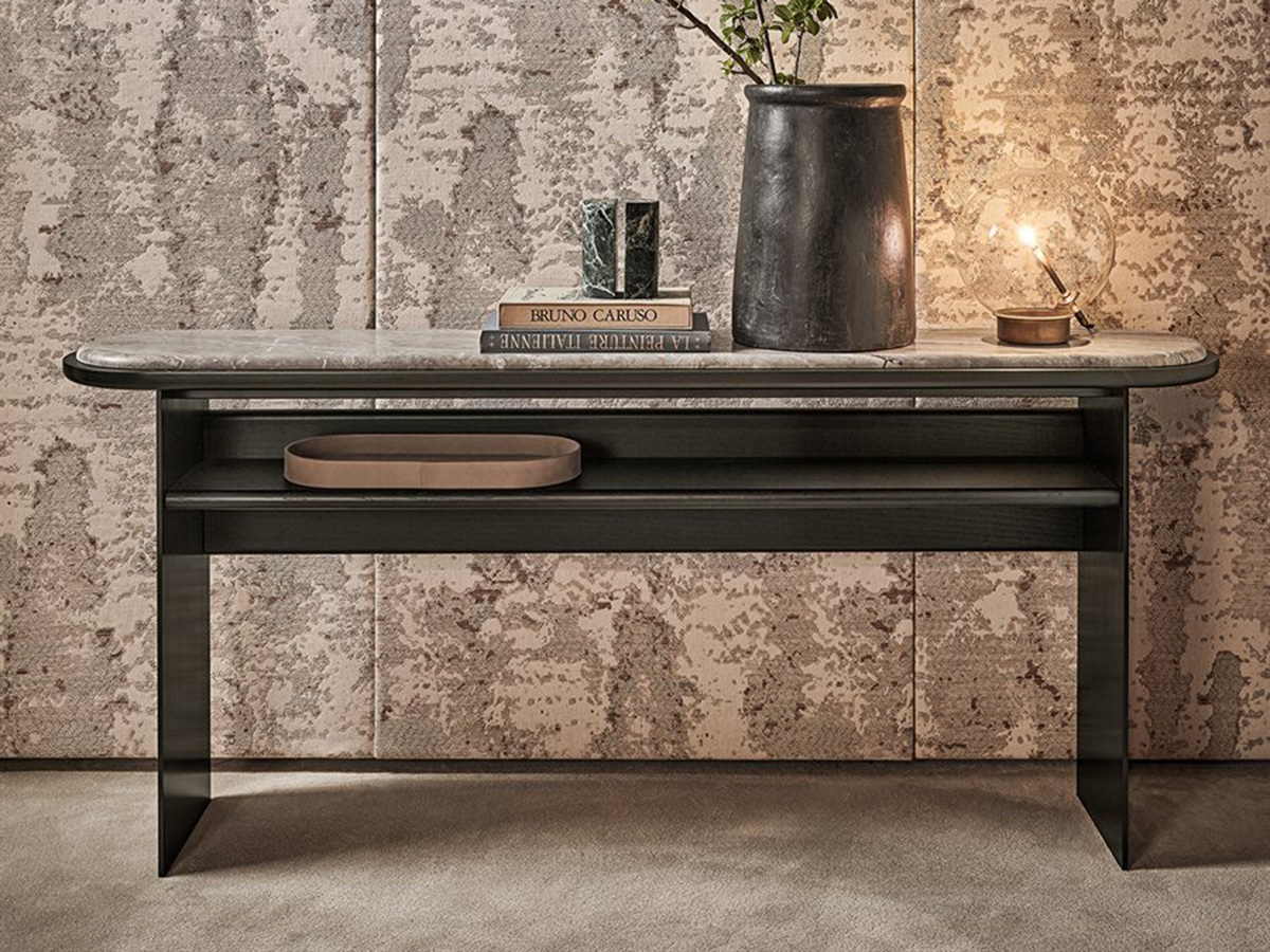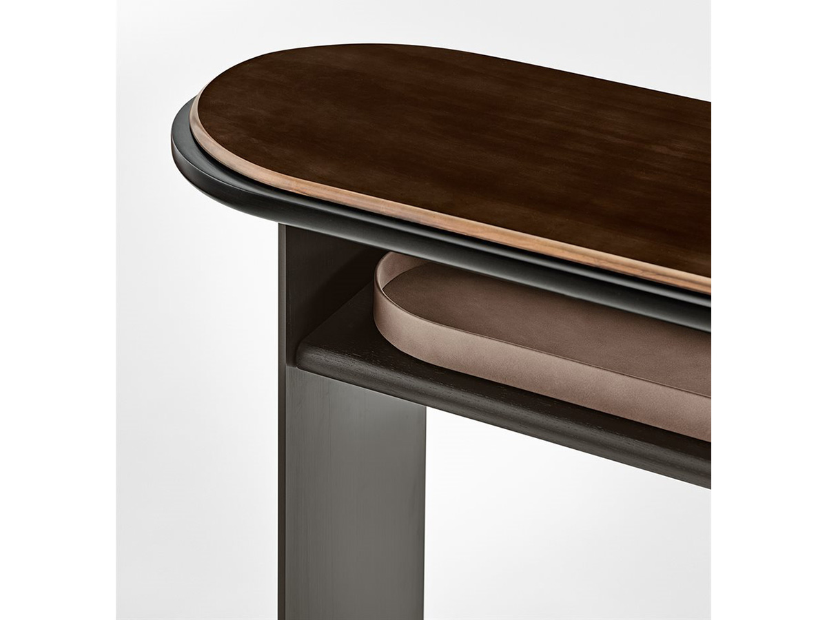 Elegant and harmonious, intriguing yet simple. The Sensei console expresses the best of high-end design applied to domestic spaces, a real conceptual challenge that takes Gallotti&Radice to the highest peaks of international furnishing design. Sensei's structure is metal with a "deep black" lacquered wooden top. The shelf and back are in open pore black stained ash to better express elegance and solidity. Gallotti&Radice has placed a cut glass top resting on the wooden top. The company makes it available in different sizes including lounge and with the addition of a metal storage tray covered in leather in the different colors offered in the catalogue. Sensei is a console that is well suited to different spaces including offices and receptions.