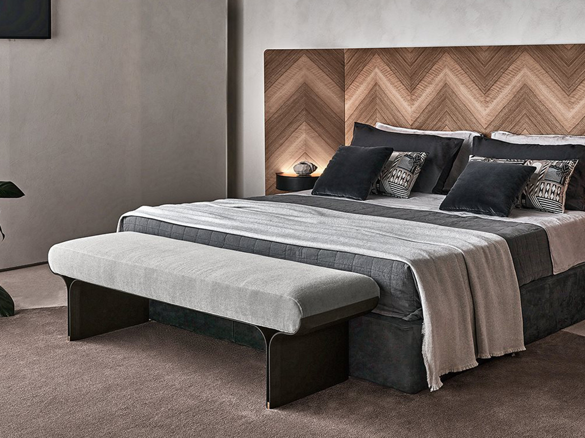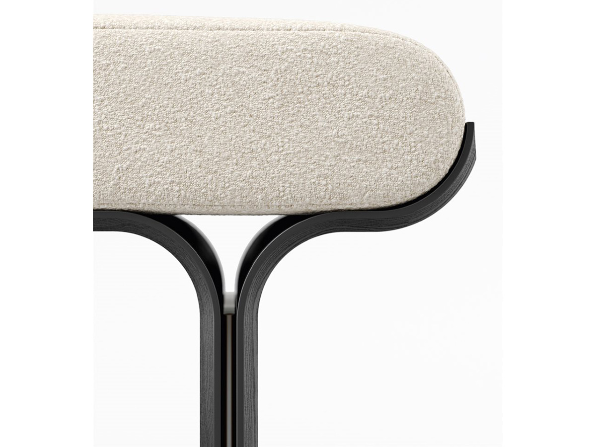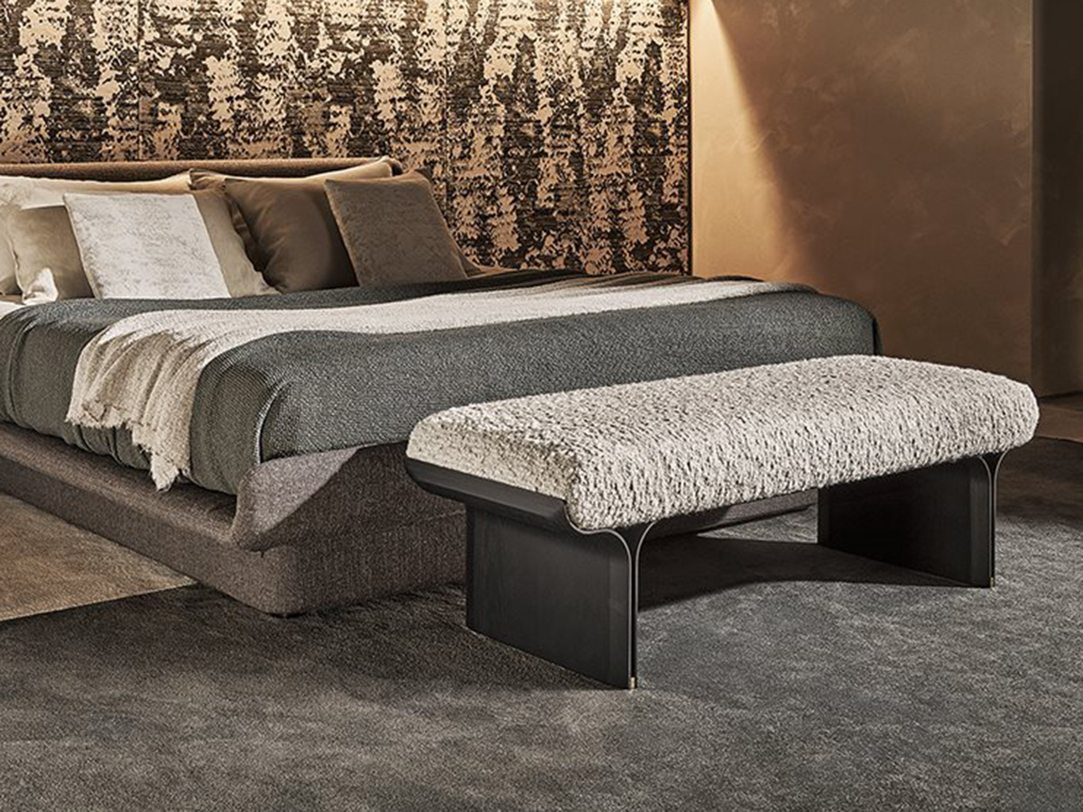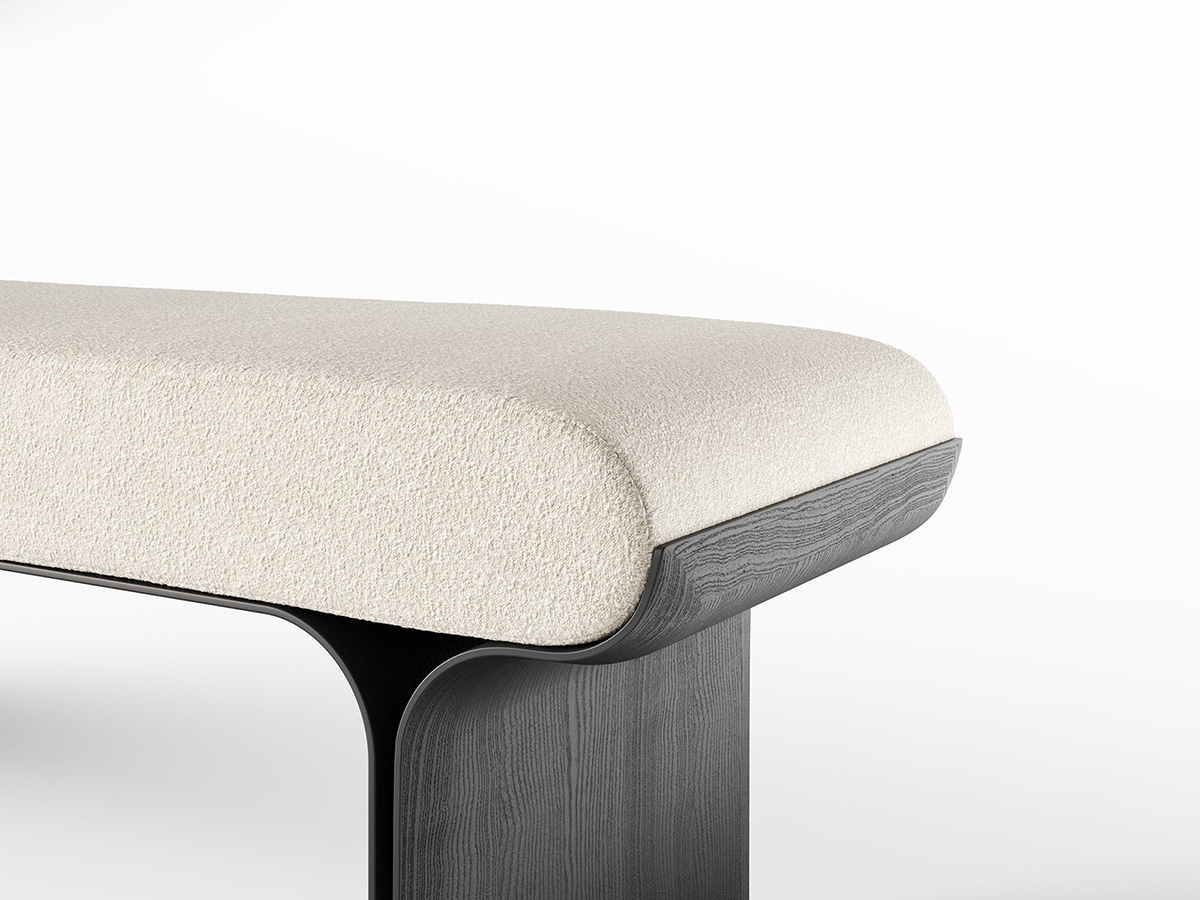 A bench with an innovative design which nevertheless seems to evoke more retro aesthetics and features. The Stami line was designed by Studiopepe with an open pore black stained curved ash base and polished brass details. Above the frame stands a cushion in expanded polyurethane covered in fabric or leather and available in the most diverse colors from the sample collection. The shaping of this element is gentle but rigorous, an interesting combination of different feelings and desires. The covering is removable to facilitate washing and prolong its life over time. In the case of leather upholstery, the Stami bench has additional stitching compared to the elements with fabric upholstery. Overall, Stami lends itself perfectly to various home contexts but not only that, it also stands out equally in contract environments and formal situations where there is a need to place a versatile and discreet seat.