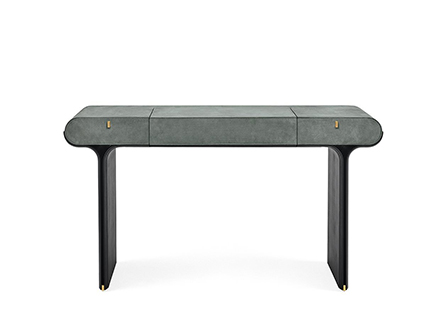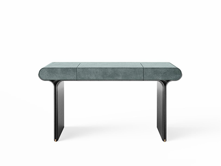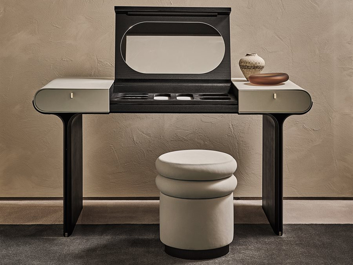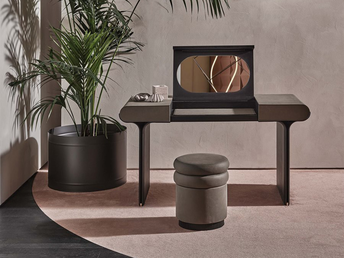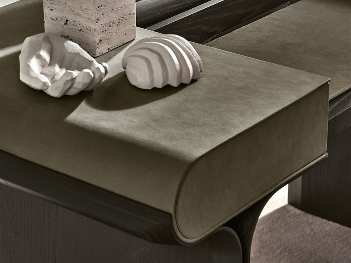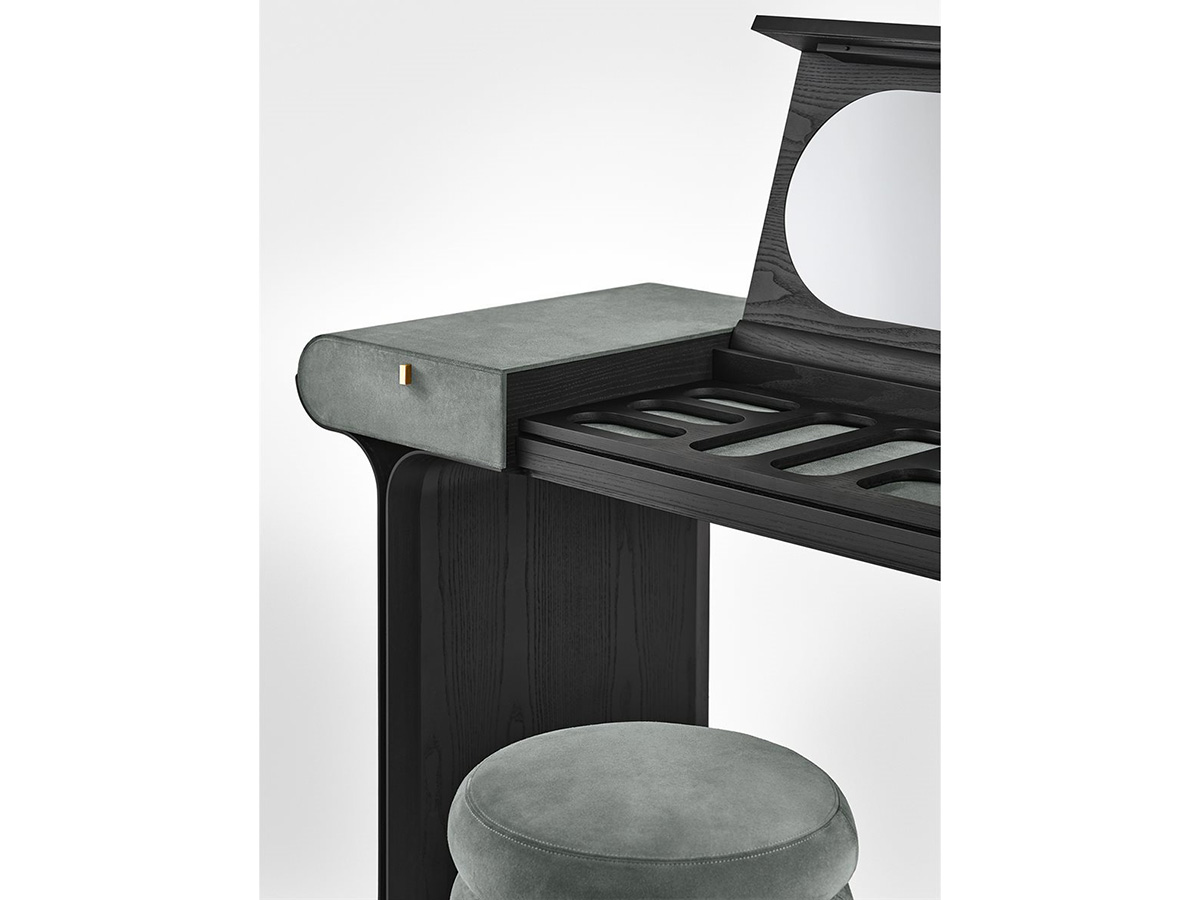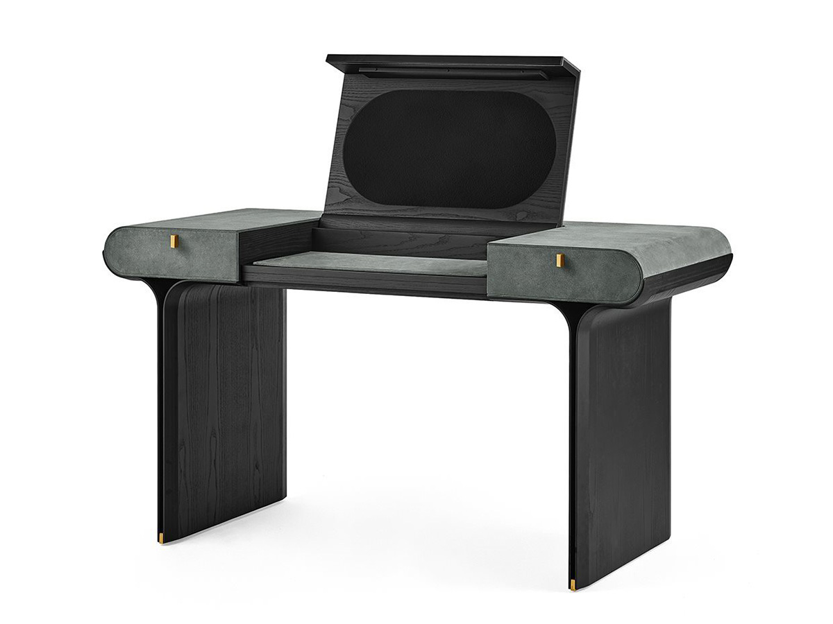 A transversal element, which is well suited to the different needs of the home. Stami adapts perfectly to home office contexts, as well as living spaces or convivial and passage places, creating an atmosphere of simple elegance and strong personality everywhere. The base is in open pore black stained curved ash with polished brass details. The structure is made of wood with leather or suede covering in the different colors offered by the Gallotti&Radice company. The top of Stami can be opened with a flap and is also made of open pore black stained wood with an internal compartment equipped with a leather or suede desk pad to match the external covering. The folding top can be equipped with a magnetic board or mirror, transforming itself into a real vanity for the bedroom. It is also available in a version with side drawers.
