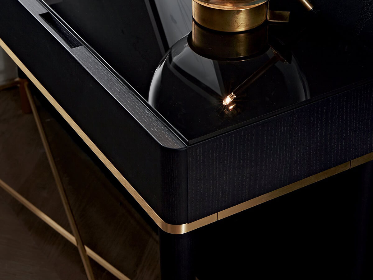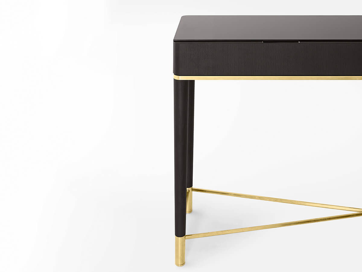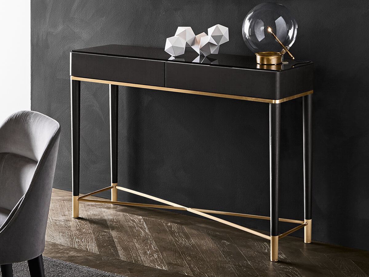 In the Tama console by Gallotti & Radice the refined sign of Carlo Colombo design finds one of its best expressions, giving life to a product in which formal delicacy and great compositional balance blend to create a chic and elegant luxury. Brass becomes a true protagonist of the composition, with the four tips present at the top of the four thin legs that are connected to each other by an X-shaped support crosspiece, an element that combines structural and decorative functions. Also in brass is the thin band underneath the capacious undertop drawers, with elegant open pore black stained ash fronts. The top is in bright back-painted tempered glass in Liquorice color.* Technical features: structure in black-stained ash with metal parts in satin brass; bright licorice back-painted crystal top