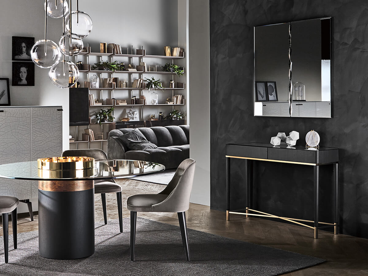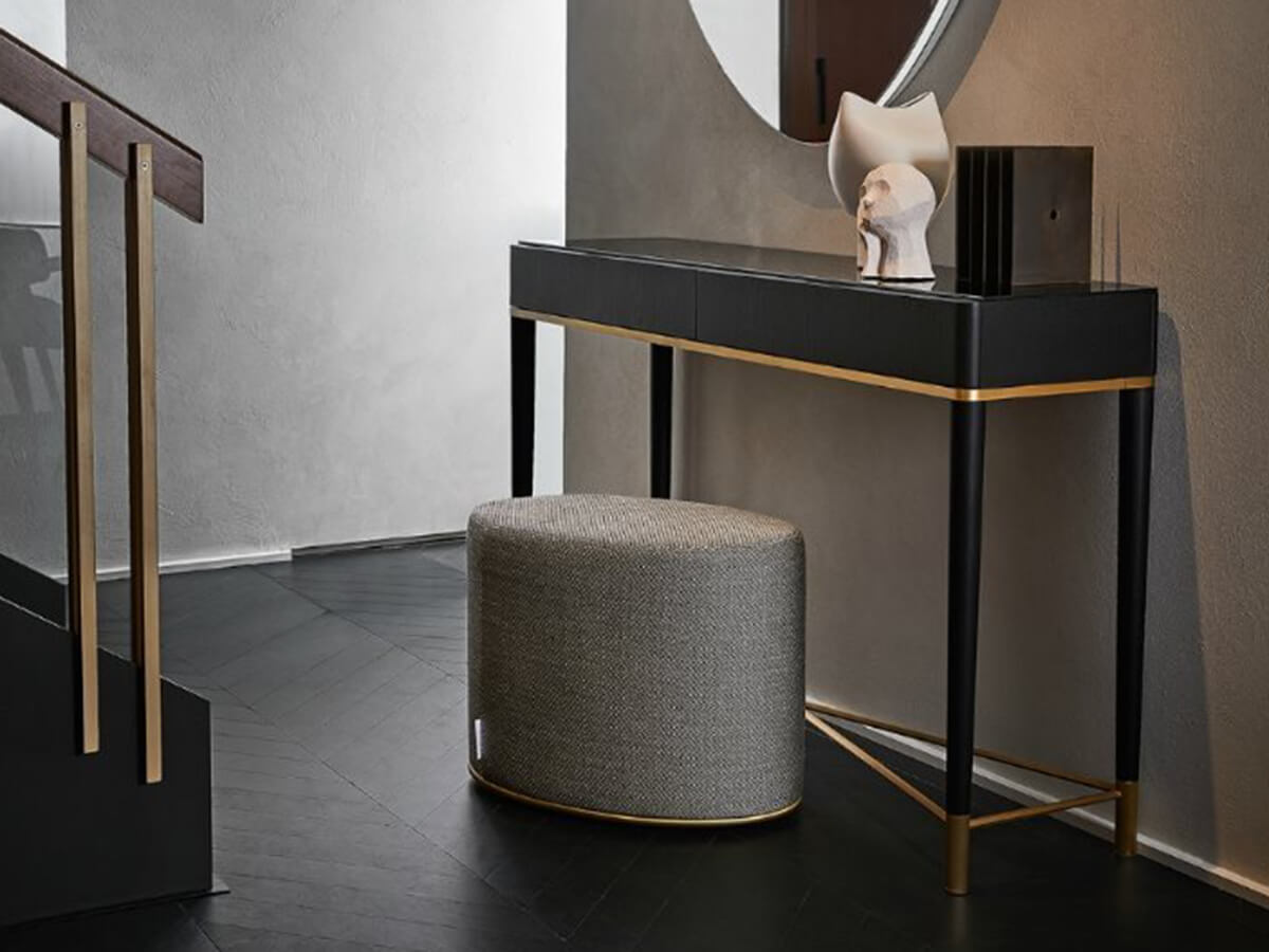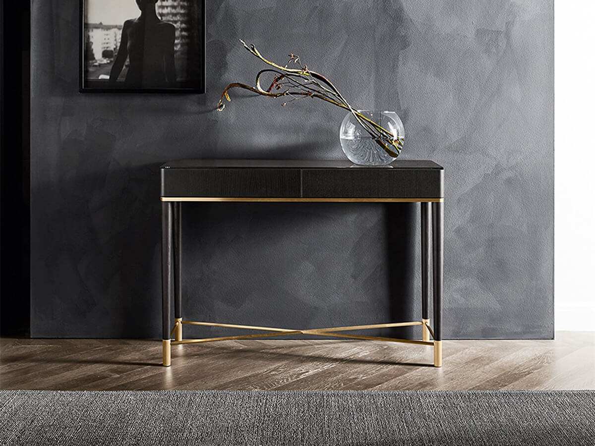 In the Tama console by Gallotti & Radice the refined sign of Carlo Colombo design finds one of its best expressions, giving life to a product in which formal delicacy and great compositional balance blend to create a chic and elegant luxury. Brass becomes a true protagonist of the composition, with the four tips present at the top of the four thin legs that are connected to each other by an X-shaped support crosspiece, an element that combines structural and decorative functions. Also in brass is the thin band underneath the capacious undertop drawers, with elegant open pore black stained ash fronts. The top is in bright back-painted tempered glass in Liquorice color.* Technical features: structure in black-stained ash with metal parts in satin brass; bright licorice back-painted crystal top