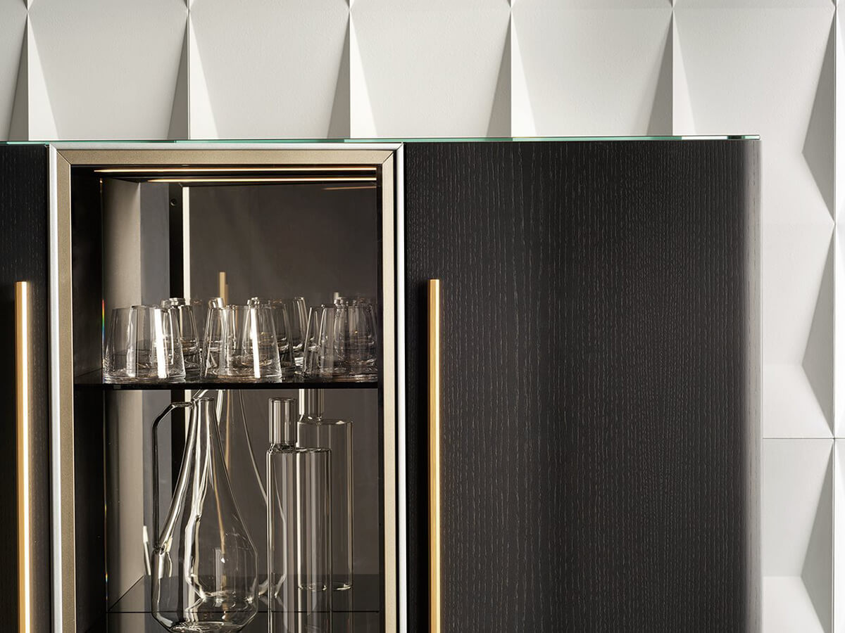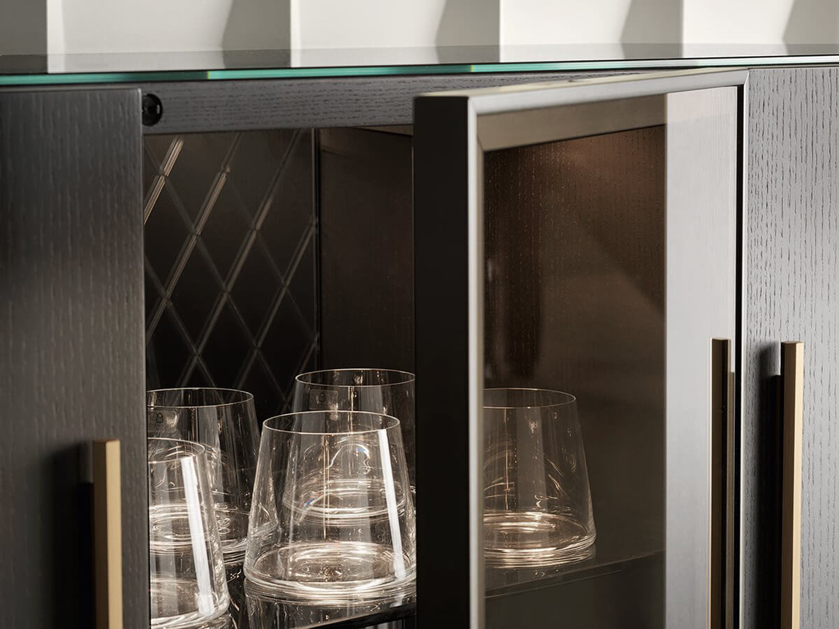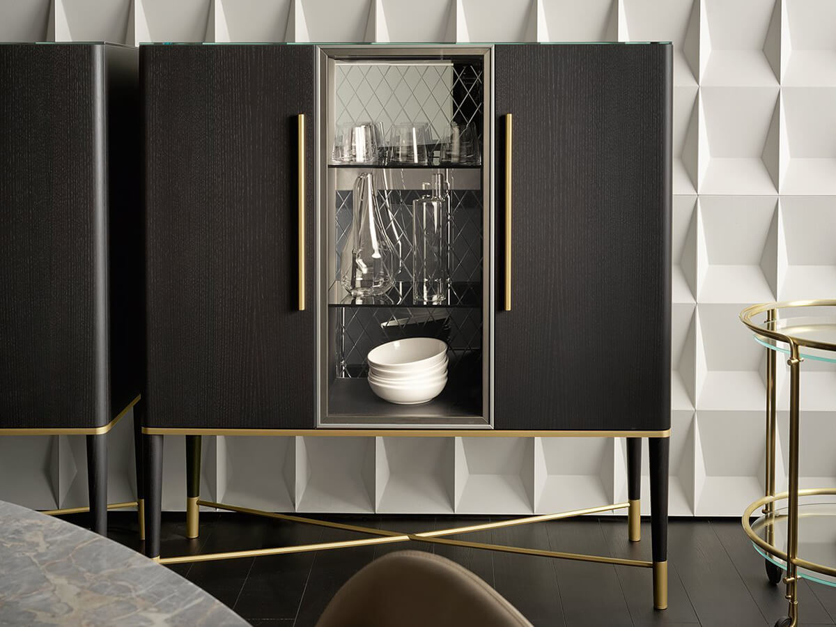 In the series of Tama sideboards by Gallotti & Radice, designed by Carlo Colombo, the luxurious refinement of the brass details gives the piece of furniture a precious and slightly retro charm, capable of giving tone and character to an entire environment with its presentation alone. It is available in various versions: Tama Crédence, low and capacious, Tam mobile bar, higher and richly equipped inside, and Tama Vitrine, in which the central door in bronzed glass reveals the internal contents.* Technical features: structure in black-stained ash, metal parts in satin brass. Equipped with internal lightingBar cabinet version: interior in Grigio Italia mirrorCrédence version: top and internal back in bright liquorice painted glassVitrine version: top and internal back in bright liquorice painted glass and central glass door