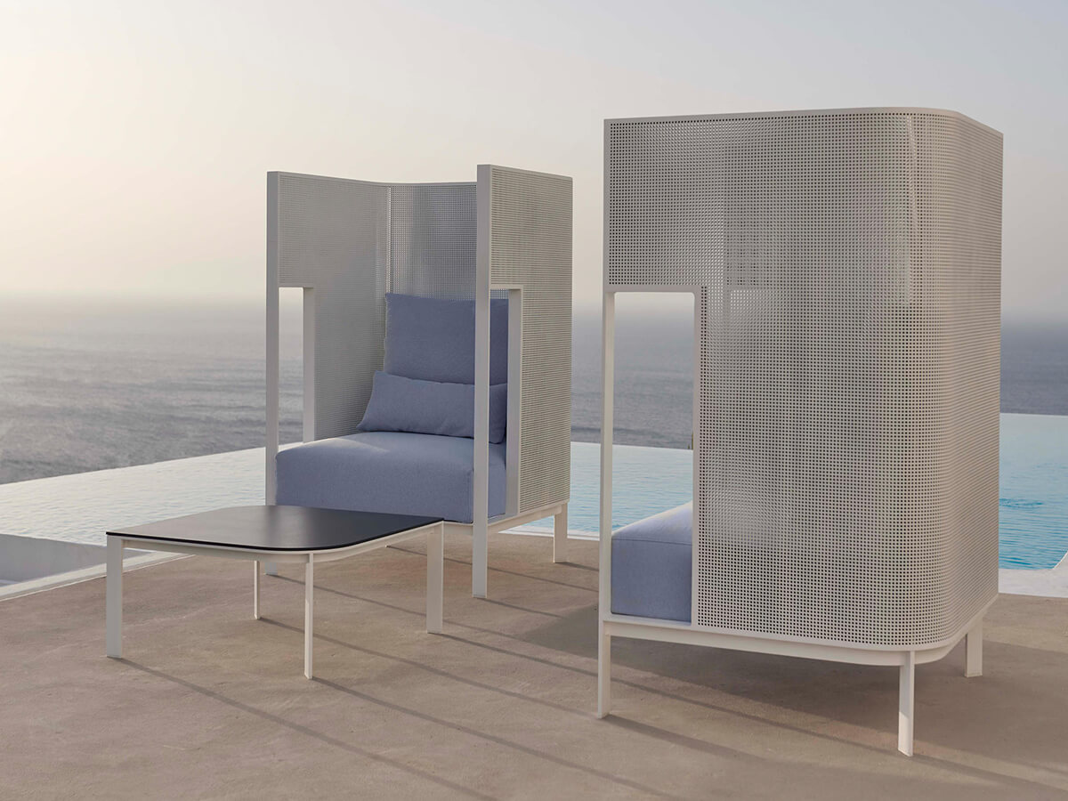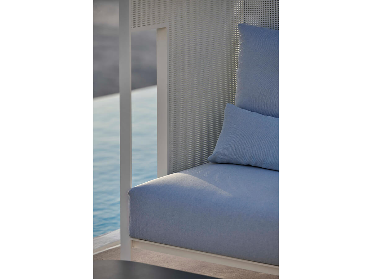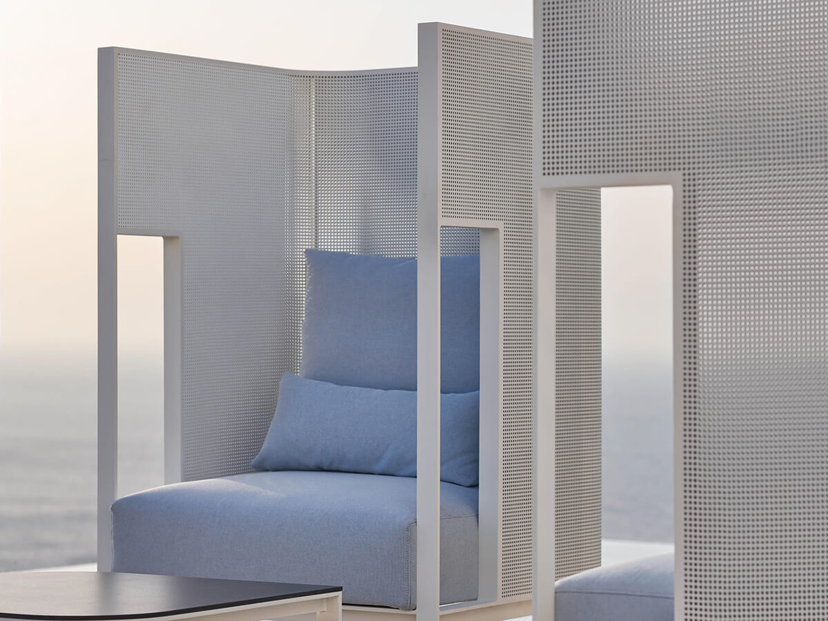 Solanas is a collection by Gandiablasco where a strong sensitivity towards aesthetics, beauty and functionality is perceived. The homage to Solanas, a beach located in Uruguay known for its endless sunsets and beaches is perceived in its generous, welcoming forms, capable of suggesting moments spent alone or with special friends. The structure is made of thermo-lacquered aluminum profile and dekton. The seat and back are in polyurethane foam covered in different types of fireproof fabrics that guarantee durability and resistance to use. Particularly valuable is the range of colors and finishes available, from the softest to the strongest, ideal for adapting to particularly different contexts.