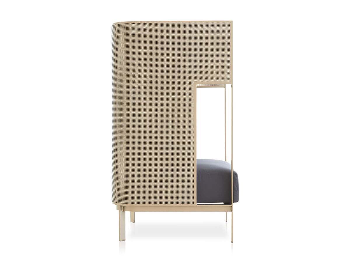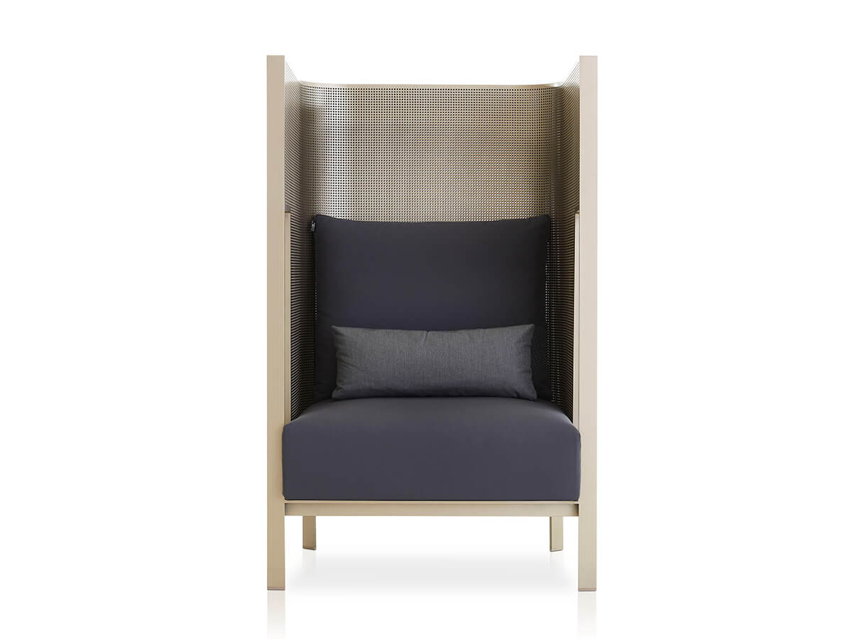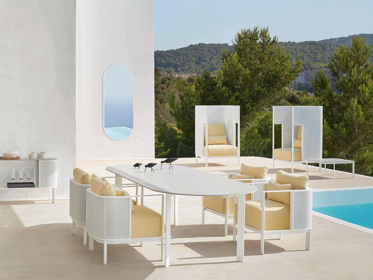 Solanas is a collection by Gandiablasco where a strong sensitivity towards aesthetics, beauty and functionality is perceived. The homage to Solanas, a beach located in Uruguay known for its endless sunsets and beaches is perceived in its generous, welcoming forms, capable of suggesting moments spent alone or with special friends. The structure is made of thermo-lacquered aluminum profile and dekton. The seat and back are in polyurethane foam covered in different types of fireproof fabrics that guarantee durability and resistance to use. Particularly valuable is the range of colors and finishes available, from the softest to the strongest, ideal for adapting to particularly different contexts.