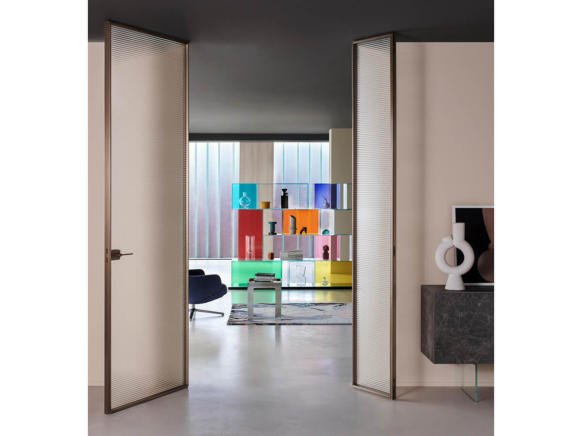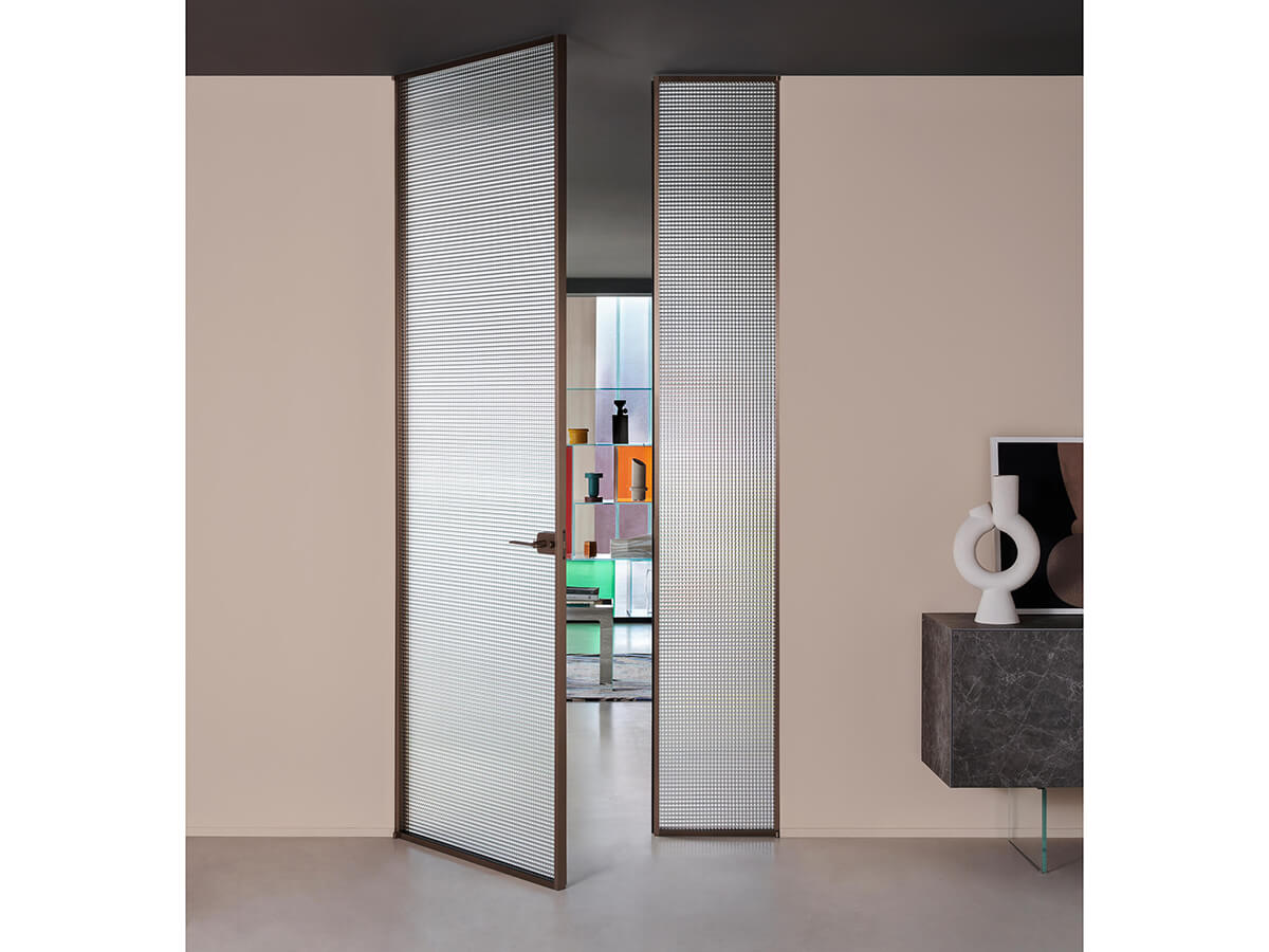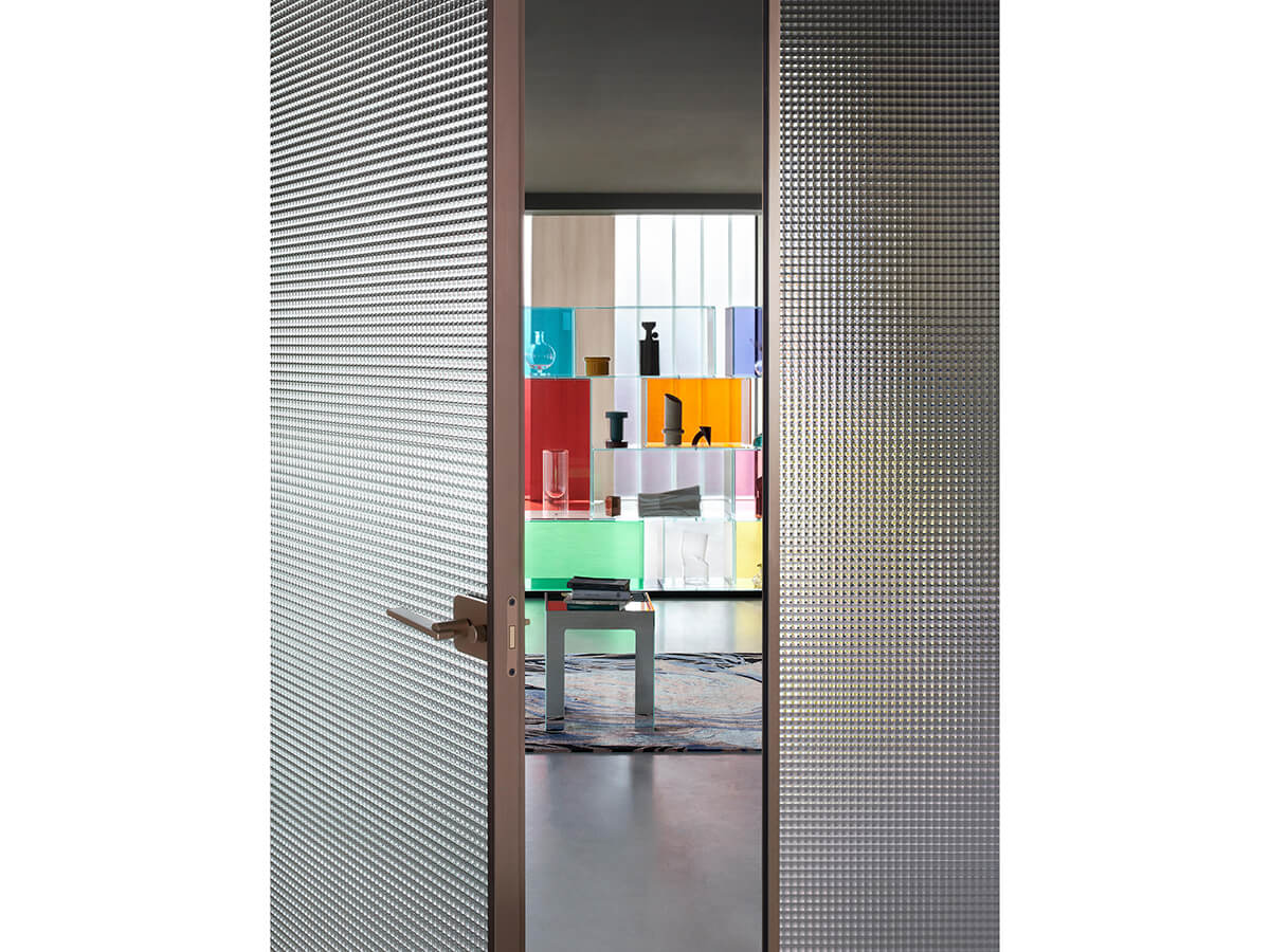 Designed by Piero Lissoni, the glass swing door Sherazade Swing Plain by Glas Italia is characterized by its extreme formal cleanliness and great attention to detail. The door consists of 6 mm monolithic tempered glass or 3 + 3 mm laminated glass, fixed to an aluminum frame available in five different finishes. On the other hand, the choice of finishes for the glass is very wide, being able to count on all the expertise of Glas Italia, which for over fifty years has mastered this material in its most varied forms. The strength of a brand like Glas Italia can also be seen on the safety side: the glasses are in fact certified according to all the most advanced regulations.