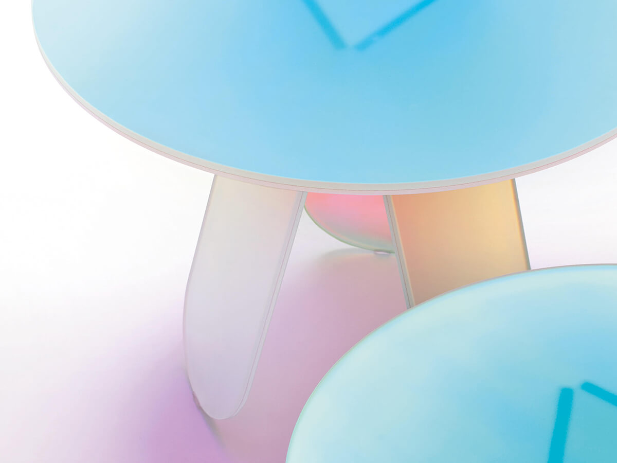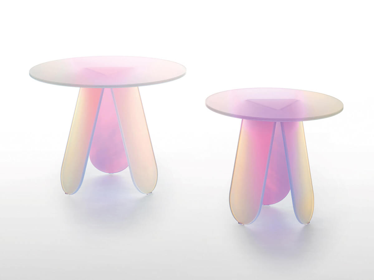 Shimmer represents a collection of consoles, high and low tables born from the creative genius of Patricia Urquiola, with an innovative design where glass is of utmost importance and its enhancement through precious plays of light. The Shimmer material is layered and glued crystal, worked with a special iridescent multi-color finish whose color varies according to the angle of incidence of light and the observer's point of view. The result is a magical, elusive effect, constantly capable of giving new emotions. In the high and low tables the bases are removable and are fixed to the tops by metal plates, concealed by circular decorations with a covering finish.
