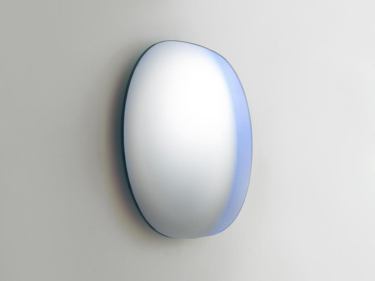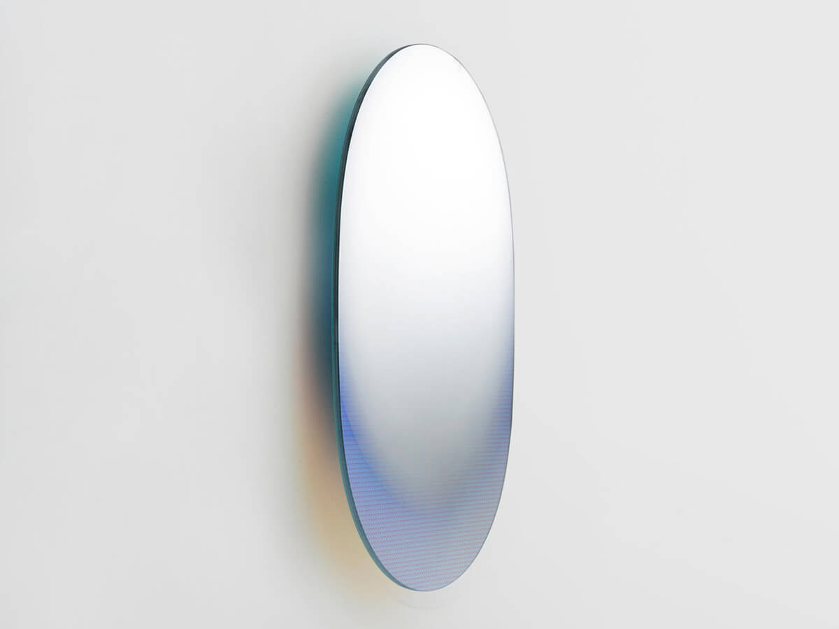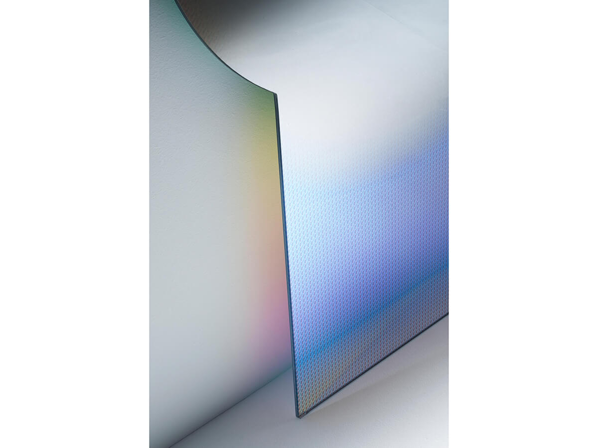 The Shimmer mirror collection was born from the genius of Glas Italia and the international designer Patricia Urquiola who imagines its different declinations and possibilities in a totally modern key and in step with the times. The Shimmer series is made of extralight crystal which, thanks to sophisticated manufacturing techniques, blends into a degrading nuanced mirroring, a delicate bichromatic geometric decoration with a wonderful iridescent multi-chrome finish. The result is a mirror that is different from the standard, unexpected and absolutely innovative, ideal for those who want to furnish with something different from the usual and particularly distinctive. Shimmer is available in different versions and colours, according to taste.