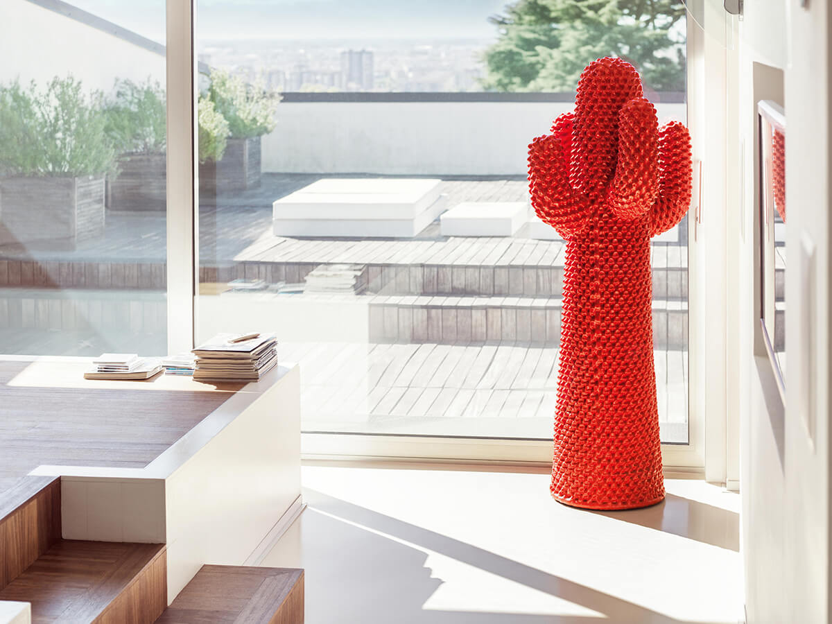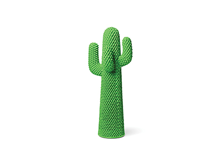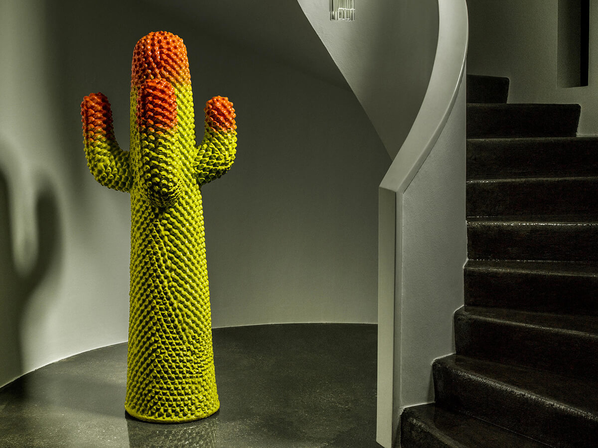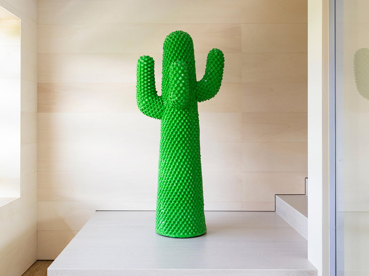 A cult piece of the radical design, born in 1972 and which has remained to this day a symbol of out-of-the-box, shocking furniture, capable of creating unexpected visual effects. An ironic object that in addition to being a sculpture is also a coat hanger, made of polyurethane foam and treated with washable black or red Guflac paint. Originally green, Cactus is now presented in numerous chromatic variations including white, red, black and more; there are also numerous limited editions, aimed at better embodying temporary trends with particular colors and suggestions. There is no perfect place to place Cactus, and at the same time, everywhere is just fine, being a stand alone object, which is self-locating without the need for help.