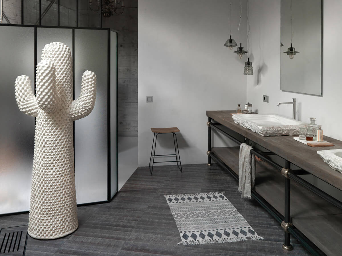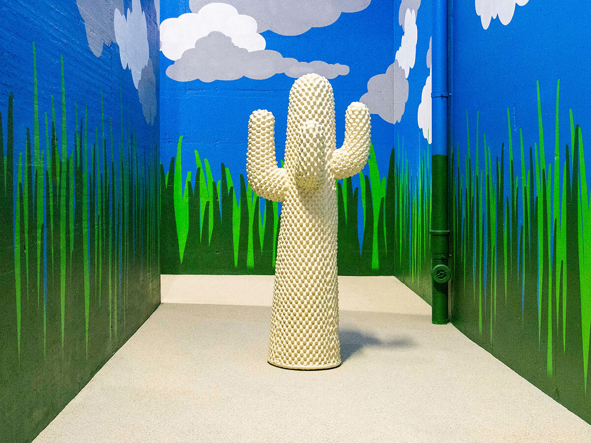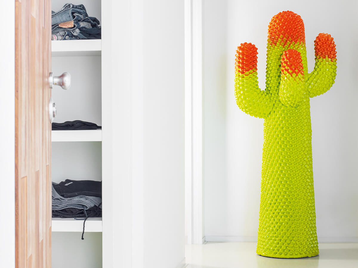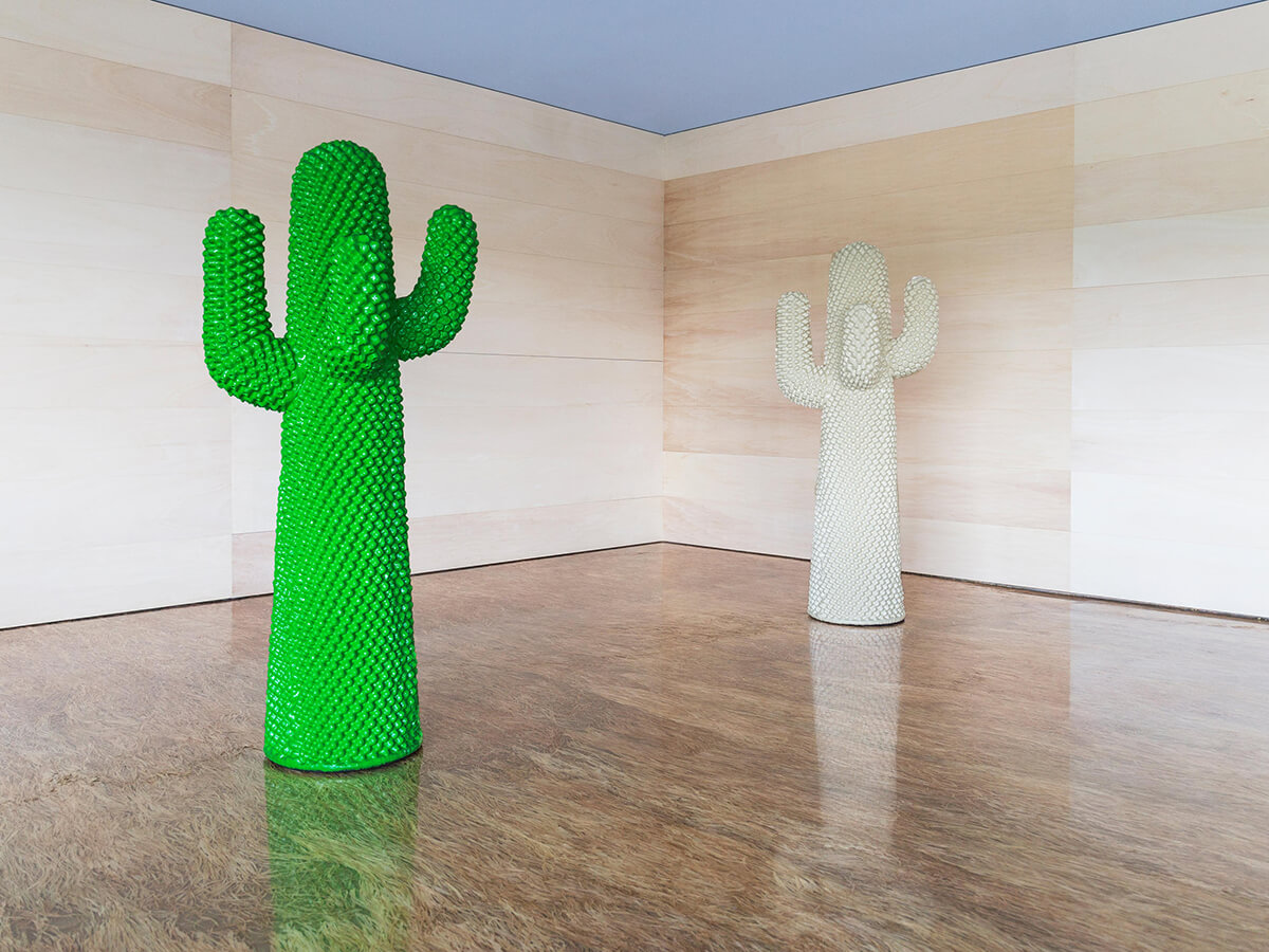 A cult piece of the radical design, born in 1972 and which has remained to this day a symbol of out-of-the-box, shocking furniture, capable of creating unexpected visual effects. An ironic object that in addition to being a sculpture is also a coat hanger, made of polyurethane foam and treated with washable black or red Guflac paint. Originally green, Cactus is now presented in numerous chromatic variations including white, red, black and more; there are also numerous limited editions, aimed at better embodying temporary trends with particular colors and suggestions. There is no perfect place to place Cactus, and at the same time, everywhere is just fine, being a stand alone object, which is self-locating without the need for help.