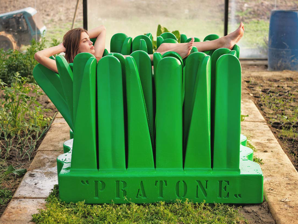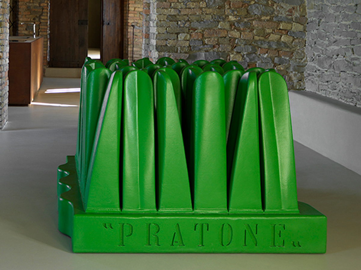 A unique seat of its kind, which has always been able to amaze and fascinate enthusiasts from all over the world. Pratone was born as an expression of radical design and has since its creation become an icon of excellence. It is an unconventional object, capable of retaining its artisan soul since each of its components is worked by hand as well as the inscription "Pratone" engraved on the base of each module. The bright green and the softness of the stems are obtained thanks to the painting with Gufalic, a special finish patented by Gufram which allows the polyurethane to be made into a skin while maintaining its flexibility and softness.