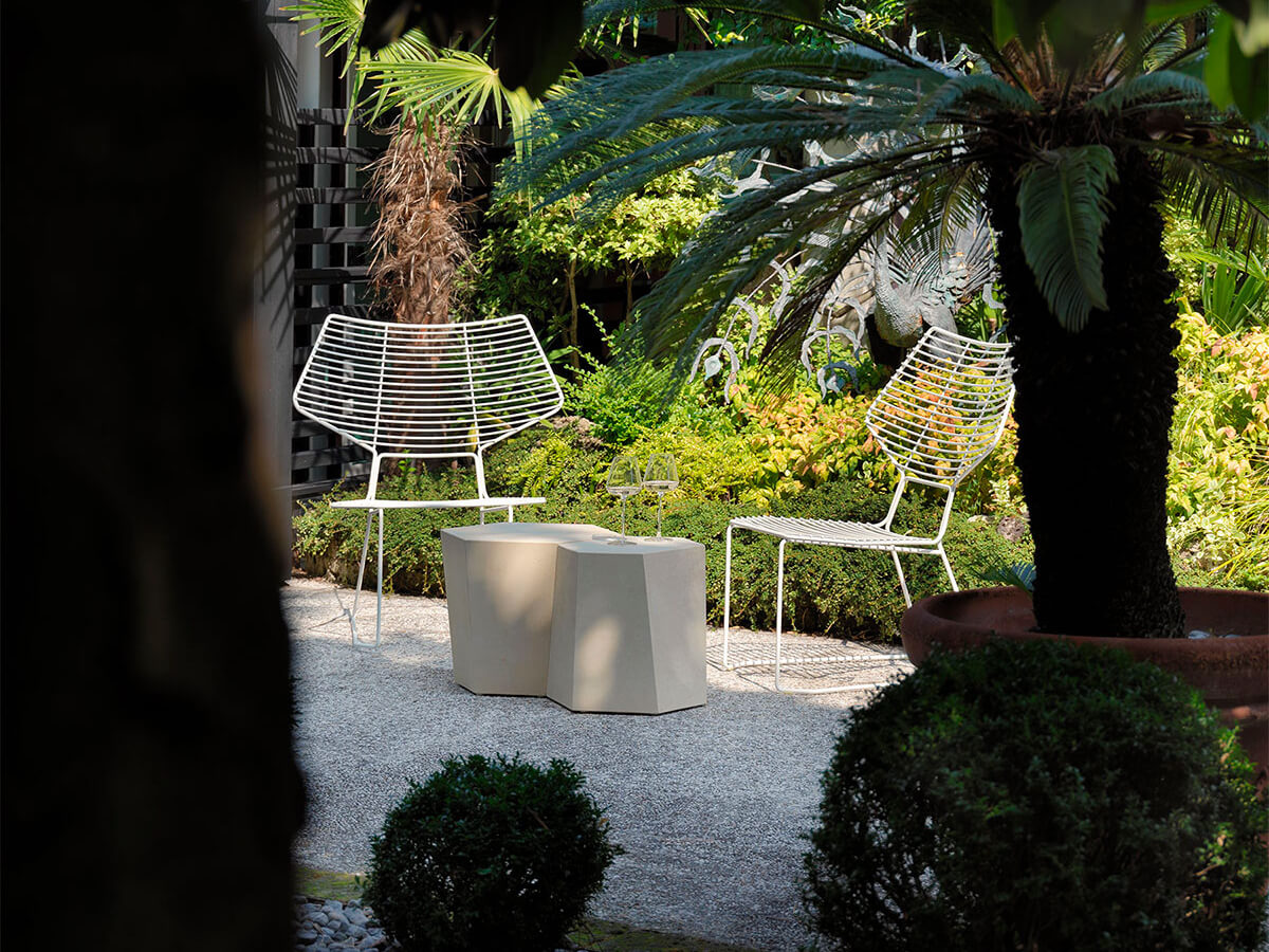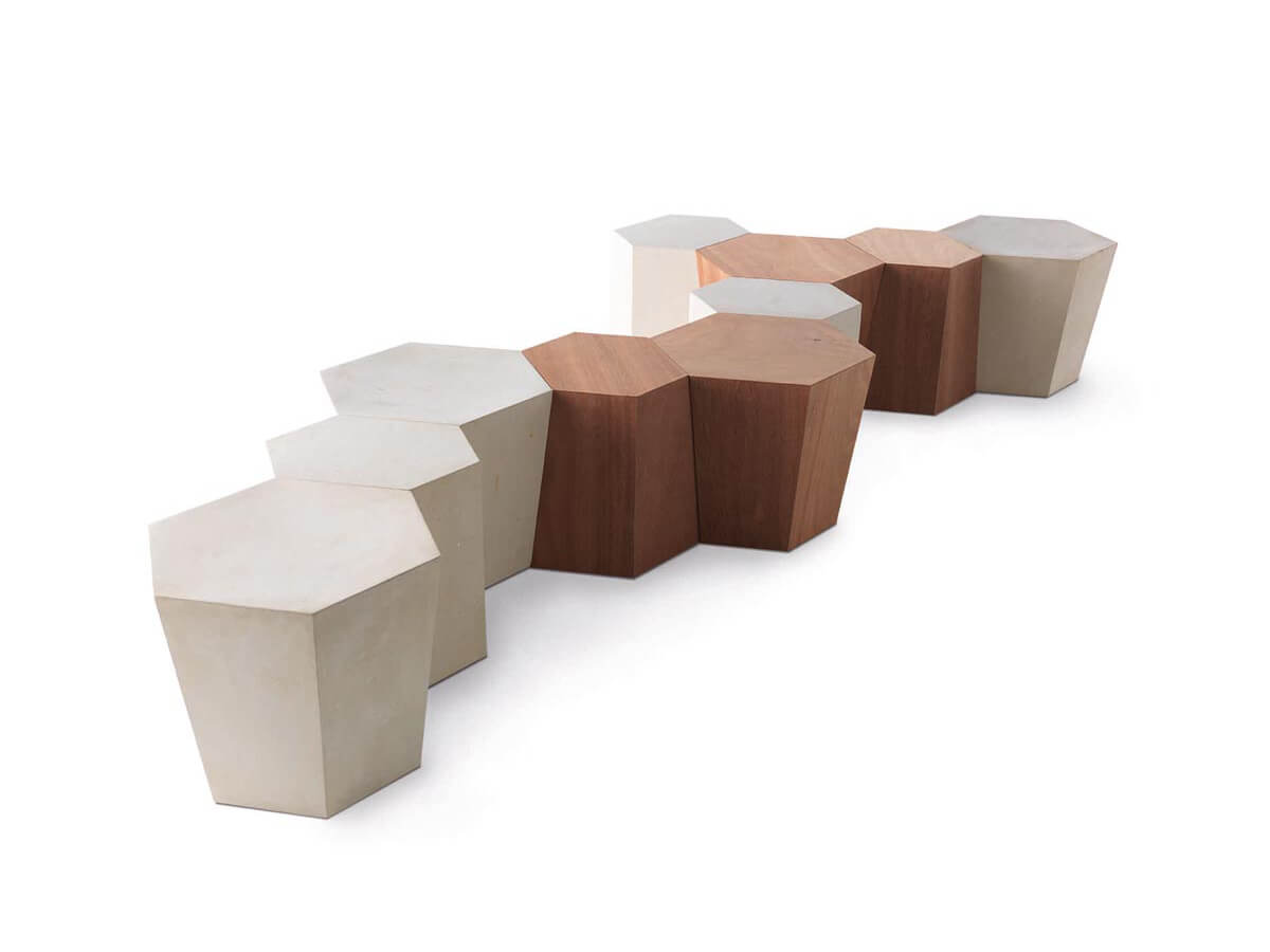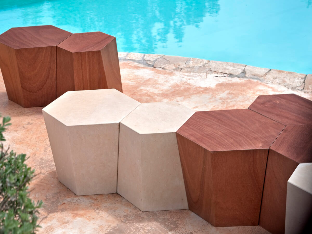 A modular system that makes composition its strong point, a founding element that finds space in any room of the house, crossing the boundaries of the obvious to result in unique and strongly characterized compositions. The beauty of Hexagon lies in the structure of the irregular hexagon table which, when placed alongside others from the same collection, creates almost infinite compositions. The nature of this furnishing element places it well in any environment, both indoors and outdoors, as it is made of Lecce stone. The material, typical of the Salento region, effectively withstands adverse climatic conditions, lending itself to prolonged use. If you prefer a more discreet material, Hexagon is also available in okumé wood.