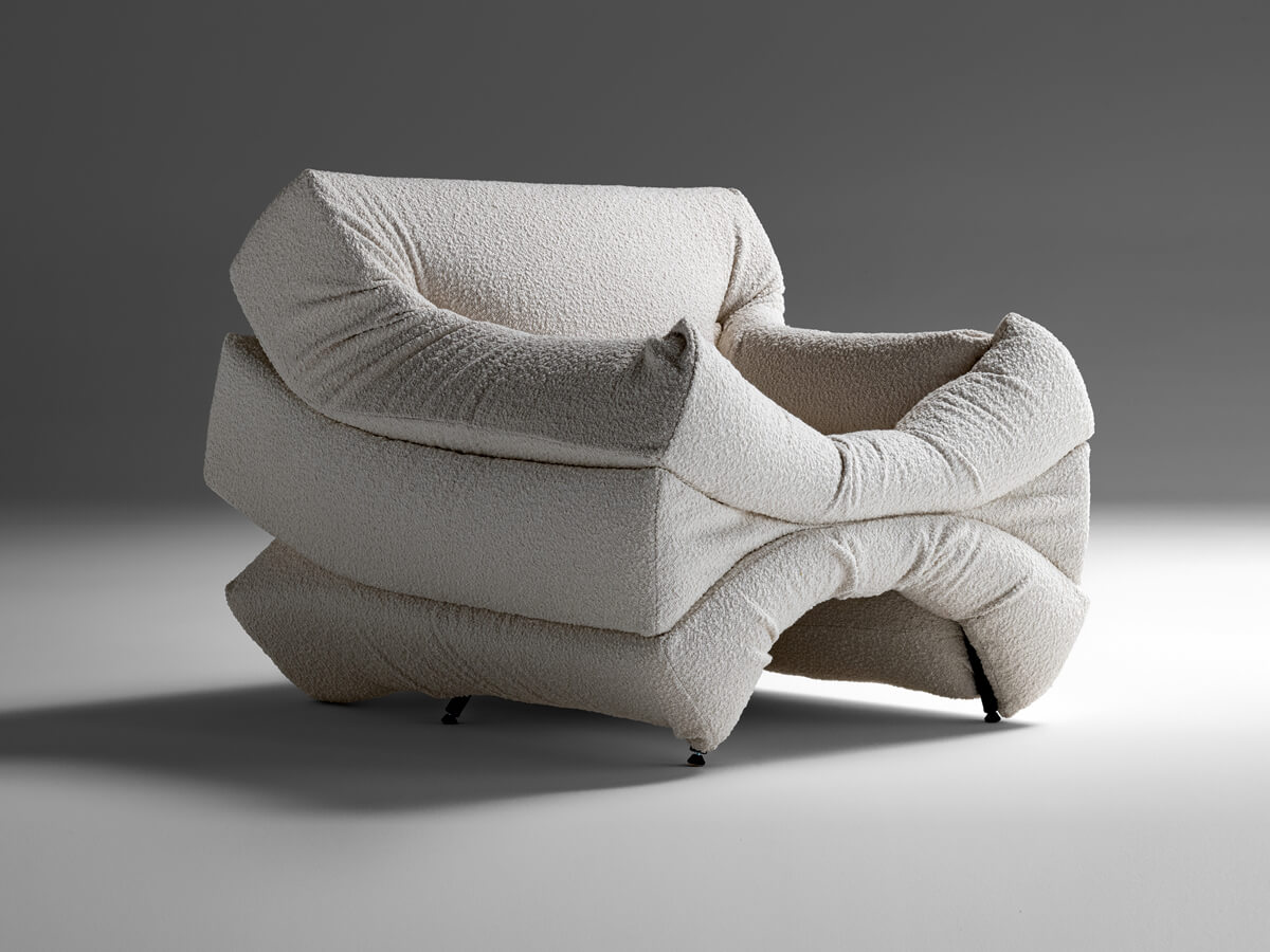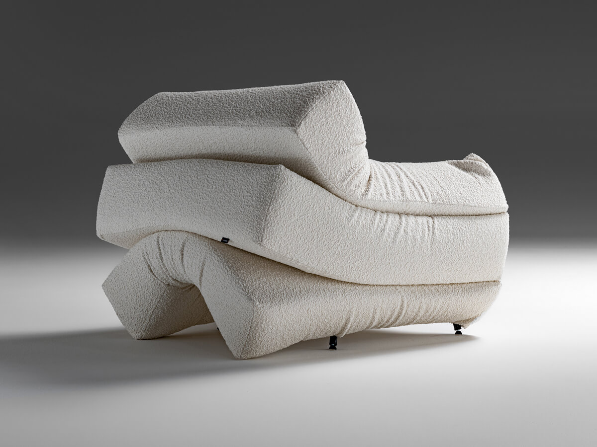 A sophisticated furnishing element that does not neglect a pinch of irony and improvisation. The Mass Pressure armchair by Horm Casamania seems to be the result of a compression applied to a normal armchair, with the result of modifying its appearance and distorting its meaning until obtaining a completely new object, one of a kind. The foam rubber used here takes on a totally new look, creating a comfortable yet unthinkable seat, with innovative and captivating lines. The structure is made of metal tubing, composed of two separate elements that compress a foam rubber monobloc sectioned into three elements. The bouclé covering is available in five variations to better match the tasteful needs of any environment.