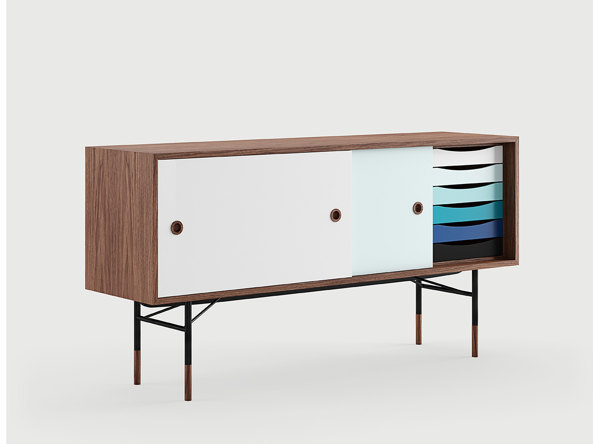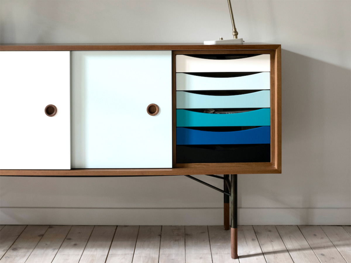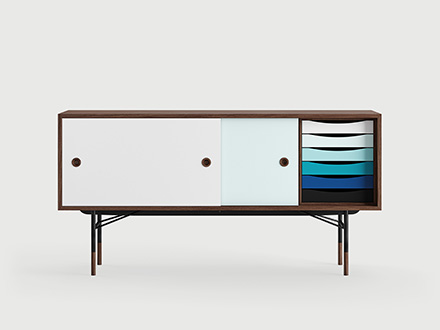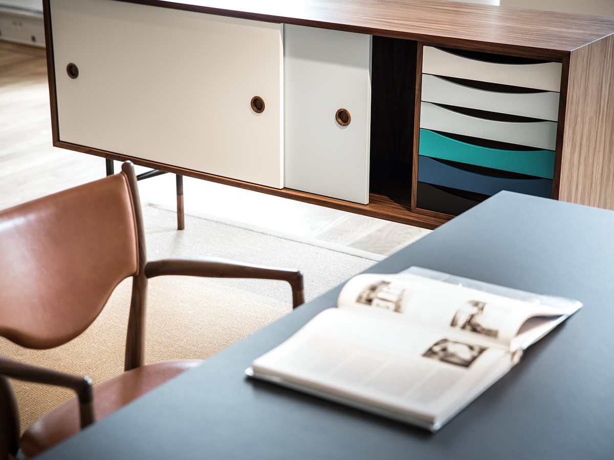 “The Sideboard”, or simply “La Madia”: this is the name of the most famous cabinet designed by Finn Juhl, still very current and a great bestseller of Scandinavian design. Finn Juhl's great intuition for this piece was to associate some parts in traditional veneered wood with other more intense primary colors, which give it a lively and playful look. This trait is most emphasized in the internal drawers, which give their best when presented in color gradations. The doors, simple and traditional, slide sideways and can be used through two large eyelets on the sides. Designed in 1955, the sideboard "The Sideboard" belongs to an already mature phase of Finn Juhl's style, in which the influence of American design prompted him to partially abandon his passion for organic shapes in favor of more severe lines and squared, more oriented towards functionality and rationality.