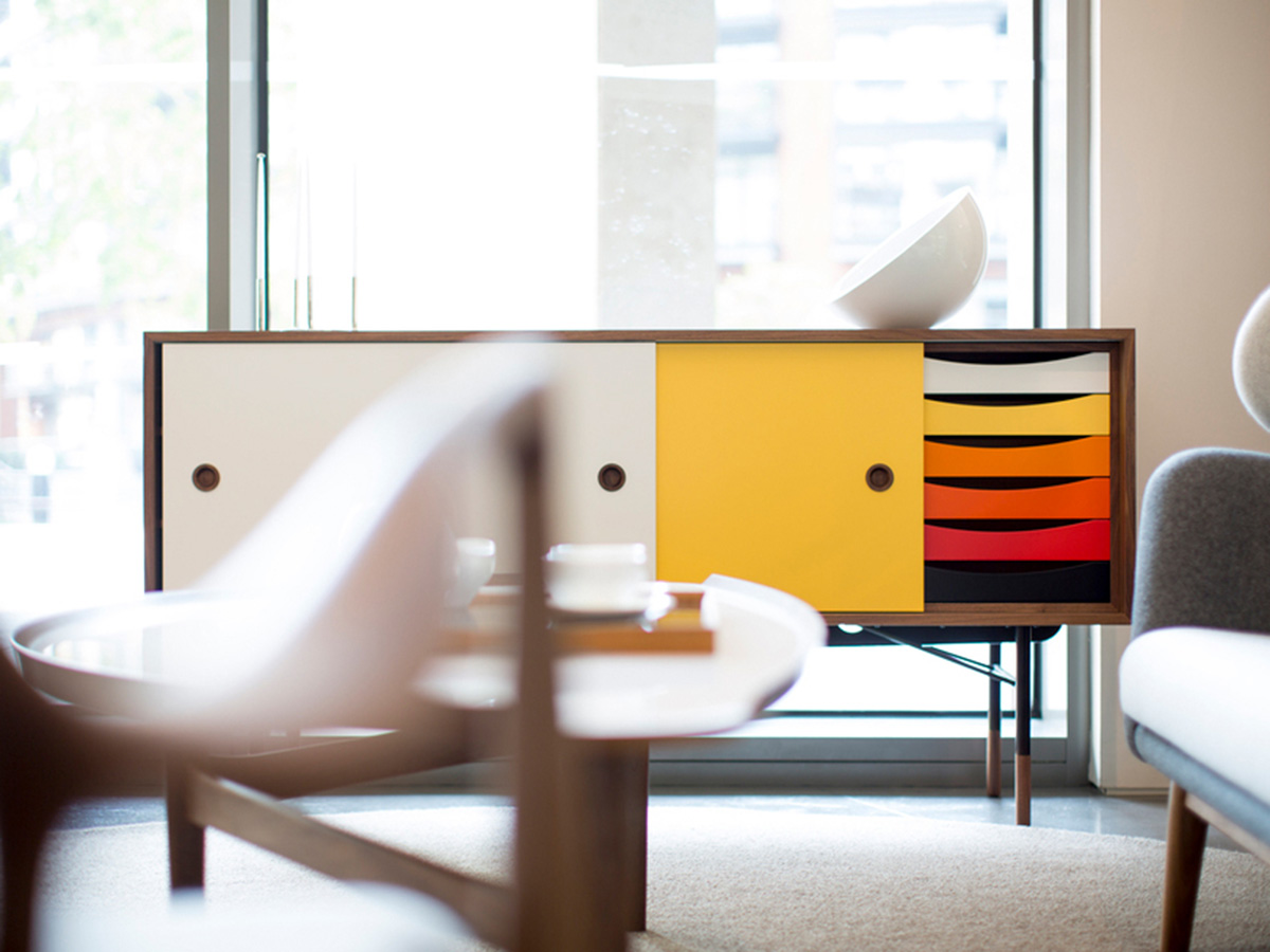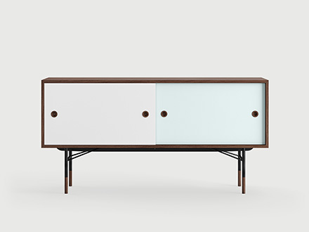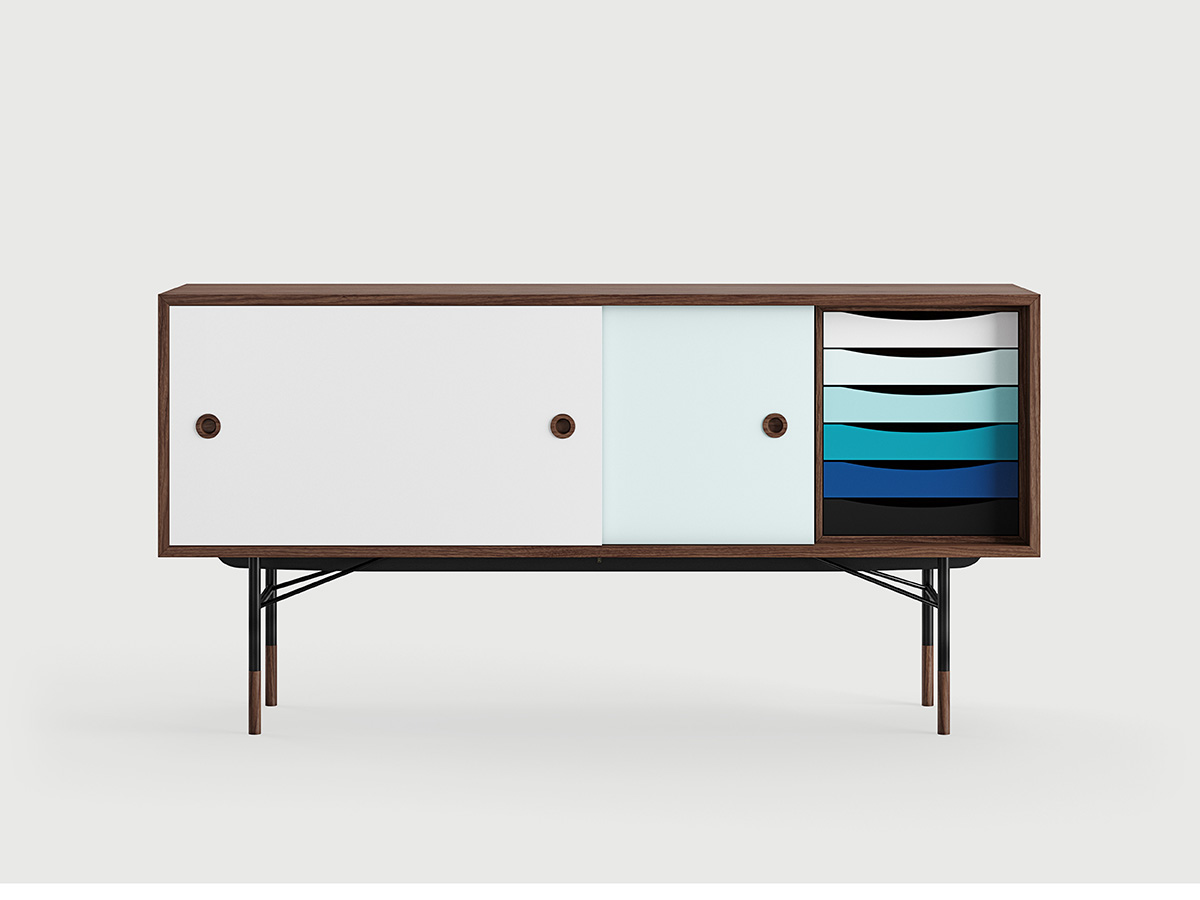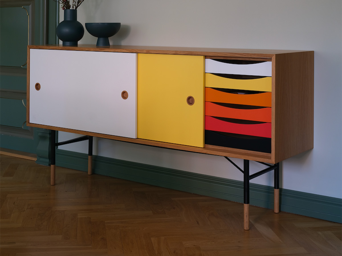 “The Sideboard”, or simply “La Madia”: this is the name of the most famous cabinet designed by Finn Juhl, still very current and a great bestseller of Scandinavian design. Finn Juhl's great intuition for this piece was to associate some parts in traditional veneered wood with other more intense primary colors, which give it a lively and playful look. This trait is most emphasized in the internal drawers, which give their best when presented in color gradations. The doors, simple and traditional, slide sideways and can be used through two large eyelets on the sides. Designed in 1955, the sideboard "The Sideboard" belongs to an already mature phase of Finn Juhl's style, in which the influence of American design prompted him to partially abandon his passion for organic shapes in favor of more severe lines and squared, more oriented towards functionality and rationality.