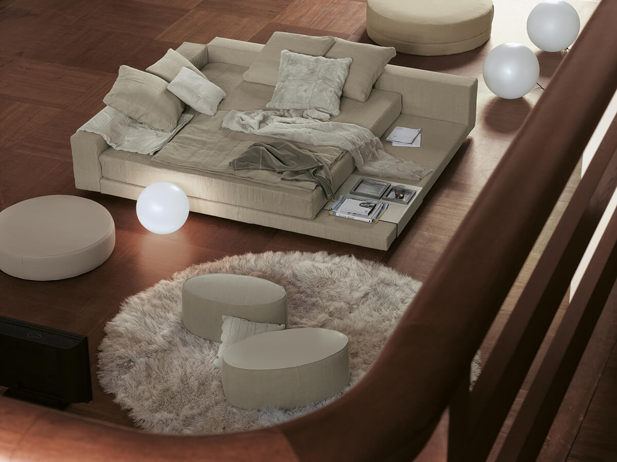 The You and Me bed was born from Ennio Arosio’s design, an example of elegance and beauty fused into a whole full of suggestion. You and Me is available in different versions including island, corner and canopy, to better suit different tastes and uses. No less interesting are the variations in size, ideal for integrating with the needs of our times. This bed by Ivano Redaelli stands out for its references to oriental atmospheres as well as an exquisitely minimal style, where shapes are reduced to the essentials to give way to the quality of the fabrics, to the comfort of design that welcomes the body, offering precious hours of relaxation. The Isola version allows you to combine the Elle coffee table, available in two metal sizes.