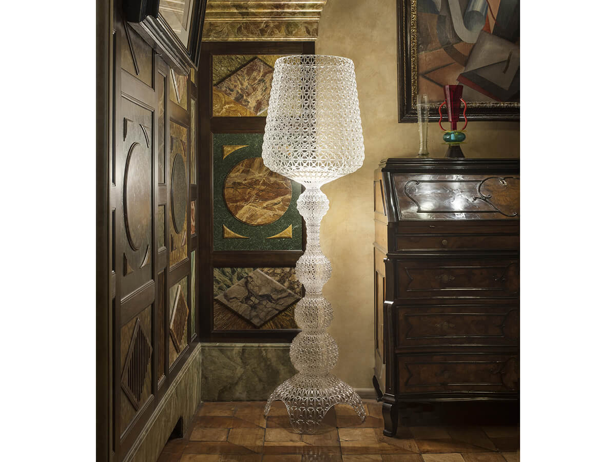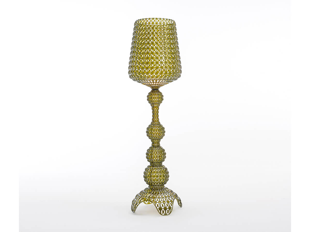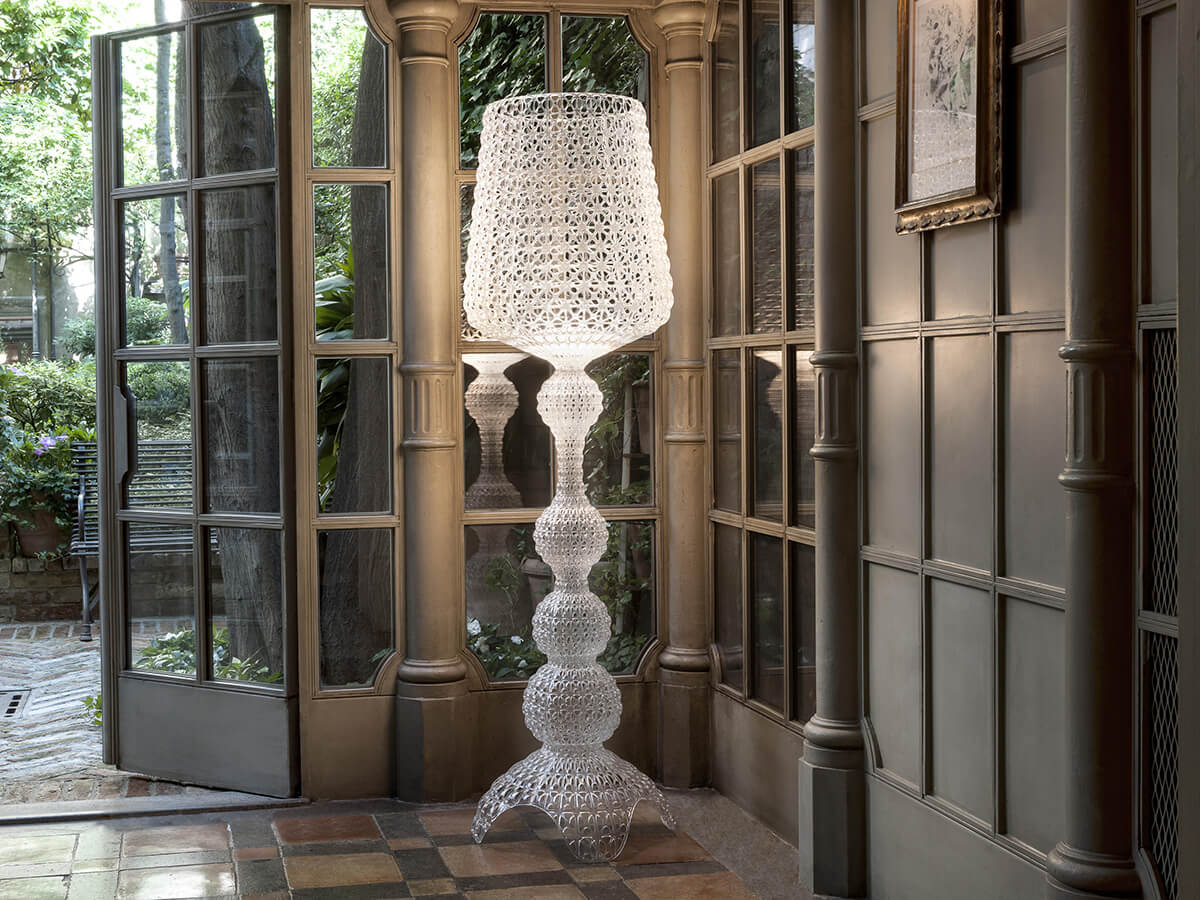Seductive and unexpected, the Kabuki lamp has that touch of sensuality capable of attracting the eye, forcing it to stop for a long time on the design that outlines it. Kabuki is covered with a lace from head to the base, capable of highlighting the elaborate and sophisticated shapes that play with transparencies and lights so as to give each point of view a unique, unrepeatable touch. Despite the massive lines, the silhouette of Kabuki is ethereal, light and extremely delicate, ideal to be placed in any environment at the expense of its function. Kartell makes it available in numerous materials and colors, to better reflect the individual's taste.