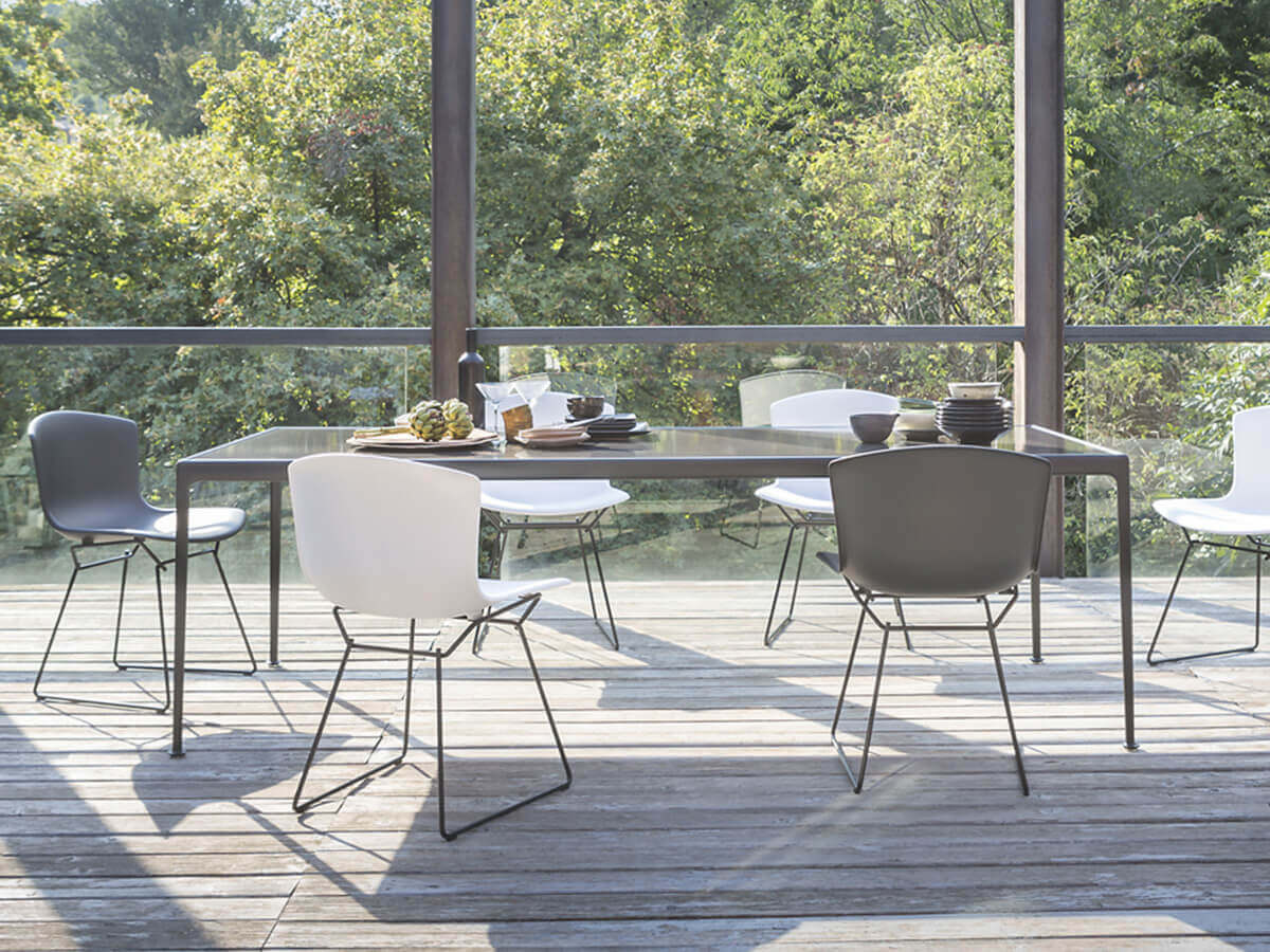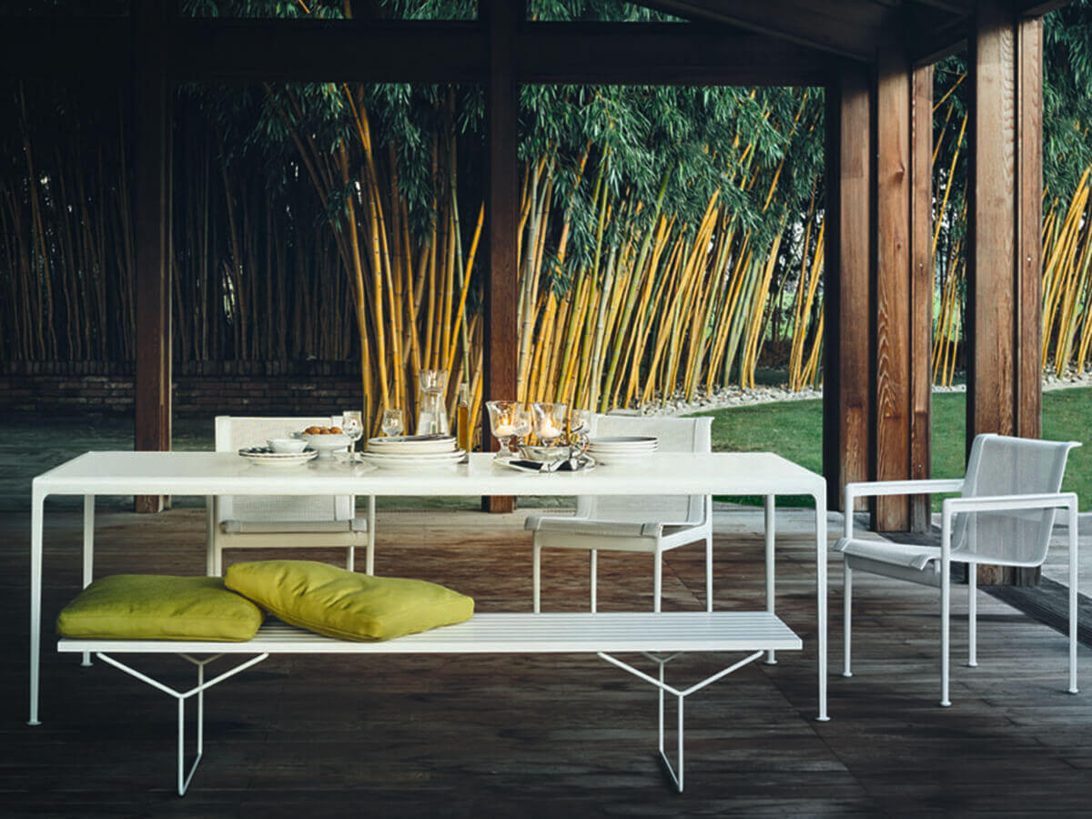 From the hand of Richard Schultz Knoll has inherited a vast assortment of outdoor furniture, designed and built with the firmness of a solid, simple and functional design. The author designs each piece of the collection at the request of Florence Knoll, with the specific request that each element be able to withstand bad weather and atmospheric agents, in particular the brackish air of Florida. The result was an incredible variety of tables, coffee tables, chairs and armchairs that still stand out for their aesthetic taste. This rectangular model, made of aluminum and polyester, is not afraid of harsh climates as much as warmer ones, making it perfect in all conditions.