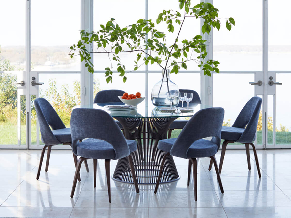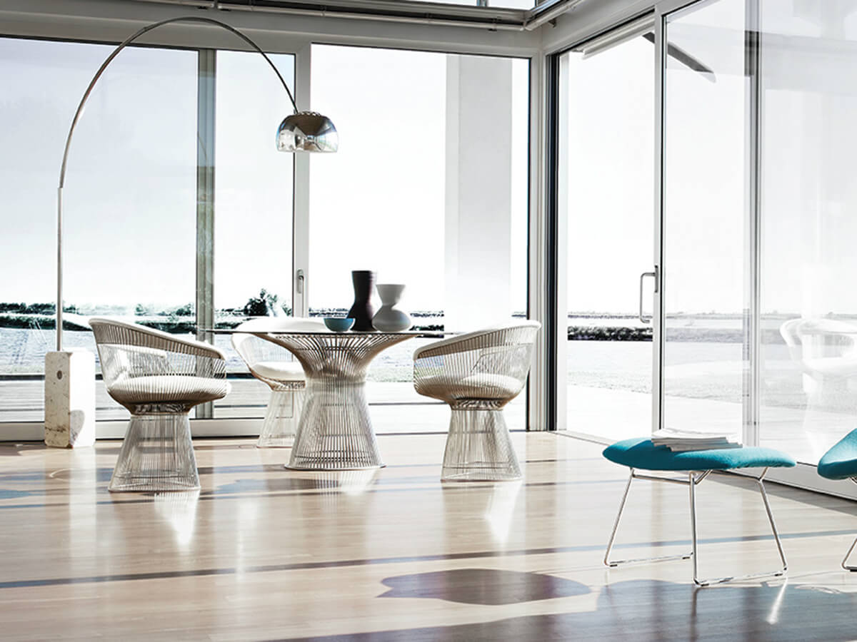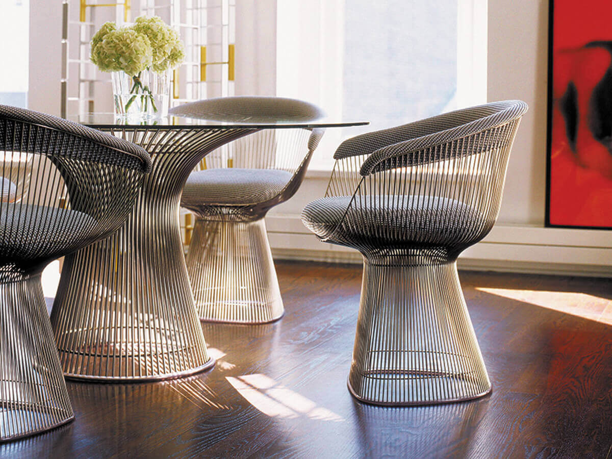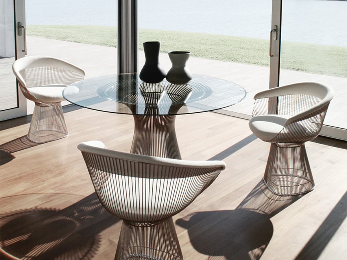 Perfect for both domestic living environments and contract areas, the Platner table by Knoll represents an elegant example of contemporary design, capable of adapting to any context without difficulty. Born from the ingenuity of the designer Warren Platner, it consists of vertically and horizontally shaped metal rods that give life to a characteristic open band at the top where the top is placed. Available in the most diverse finishes, it is distinguished by the one in transparent crystal, perfect for giving greater relief to the overall shape. Like the other works of the same collection, the Platner table has been present in the Knoll catalog since 1962.