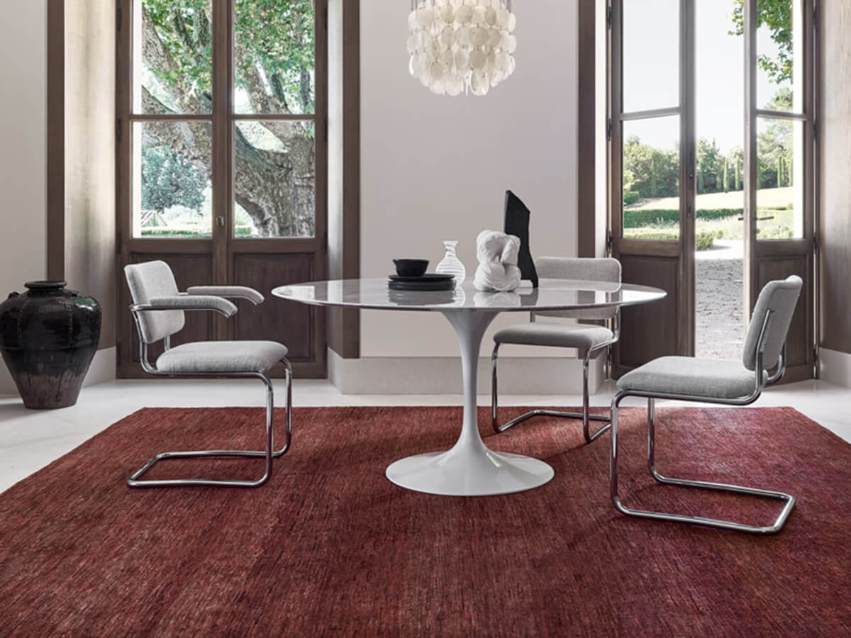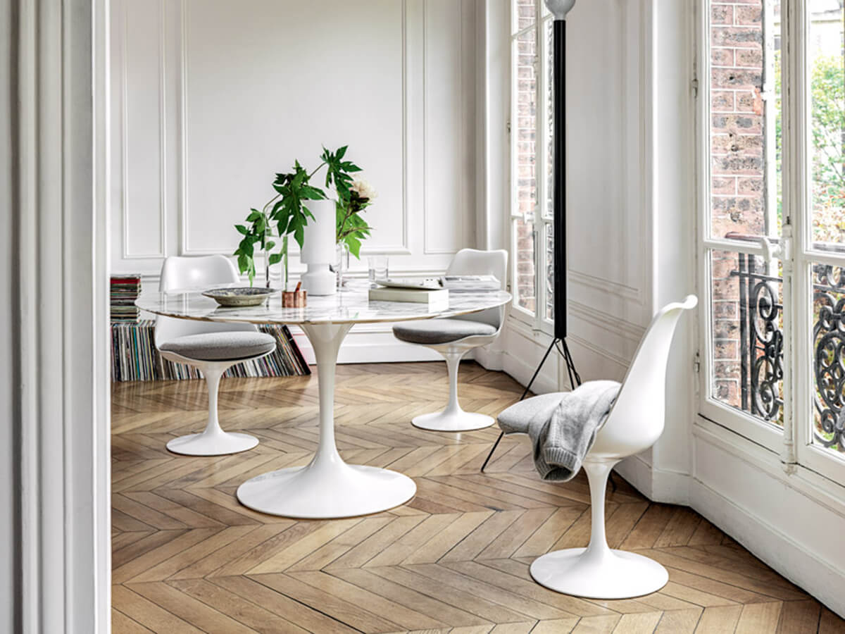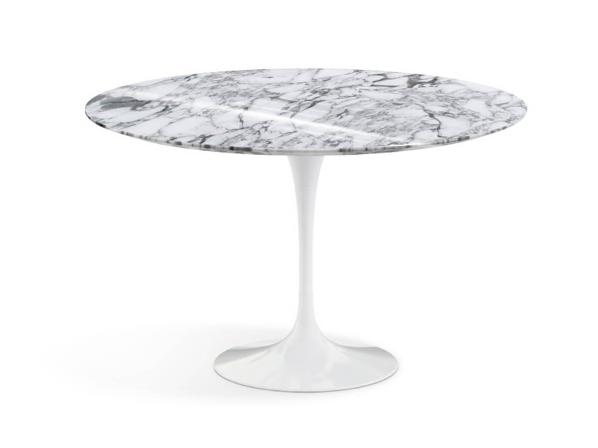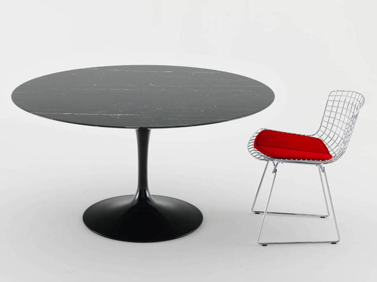 Since its creation, the Saarinen table represents one of the purest and most sought-after works of contemporary design, capable of fascinating for the simplicity of the shapes combined with the supreme aesthetic clarity of its creator, Eero Saarinen. The painted rilsan structure of the single leg present supports the top available in different finishes including marble, laminate and more. The exceptionality of the Saarinen table consists in having eliminated the now consolidated four-legged structure of domestic tables, revealing the possibility of entrusting the weight of the top to a single support. Immediately becoming a real cult of design, it continues today to be present in the living and dining rooms of the house, often associated with the equally admirable Tulip chairs by Knoll.