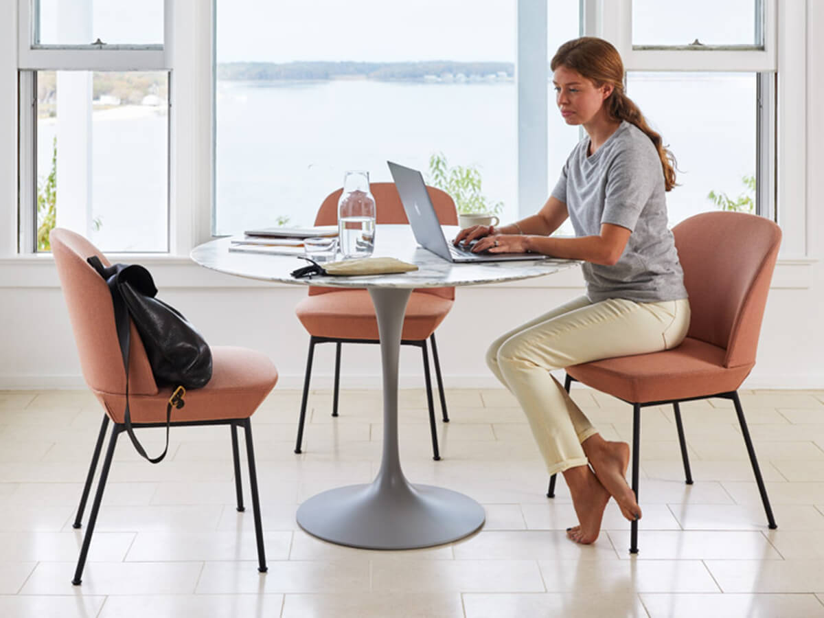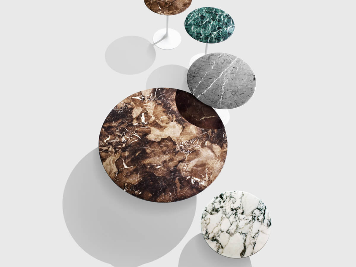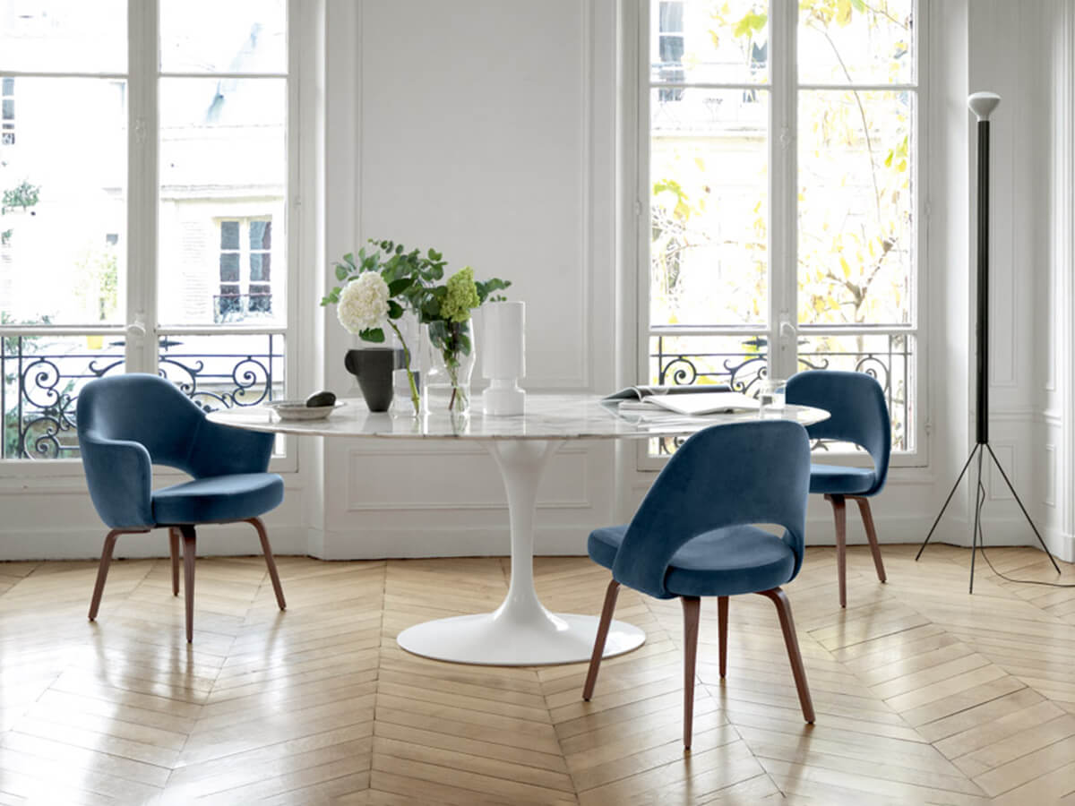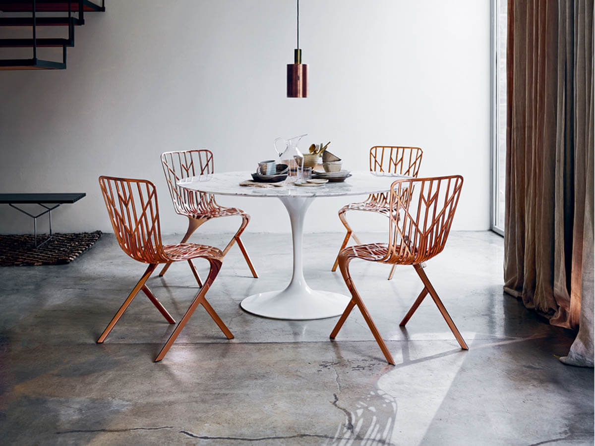 Since its creation, the Saarinen table represents one of the purest and most sought-after works of contemporary design, capable of fascinating for the simplicity of the shapes combined with the supreme aesthetic clarity of its creator, Eero Saarinen. The painted rilsan structure of the single leg present supports the top available in different finishes including marble, laminate and more. The exceptionality of the Saarinen table consists in having eliminated the now consolidated four-legged structure of domestic tables, revealing the possibility of entrusting the weight of the top to a single support. Immediately becoming a real cult of design, it continues today to be present in the living and dining rooms of the house, often associated with the equally admirable Tulip chairs by Knoll.