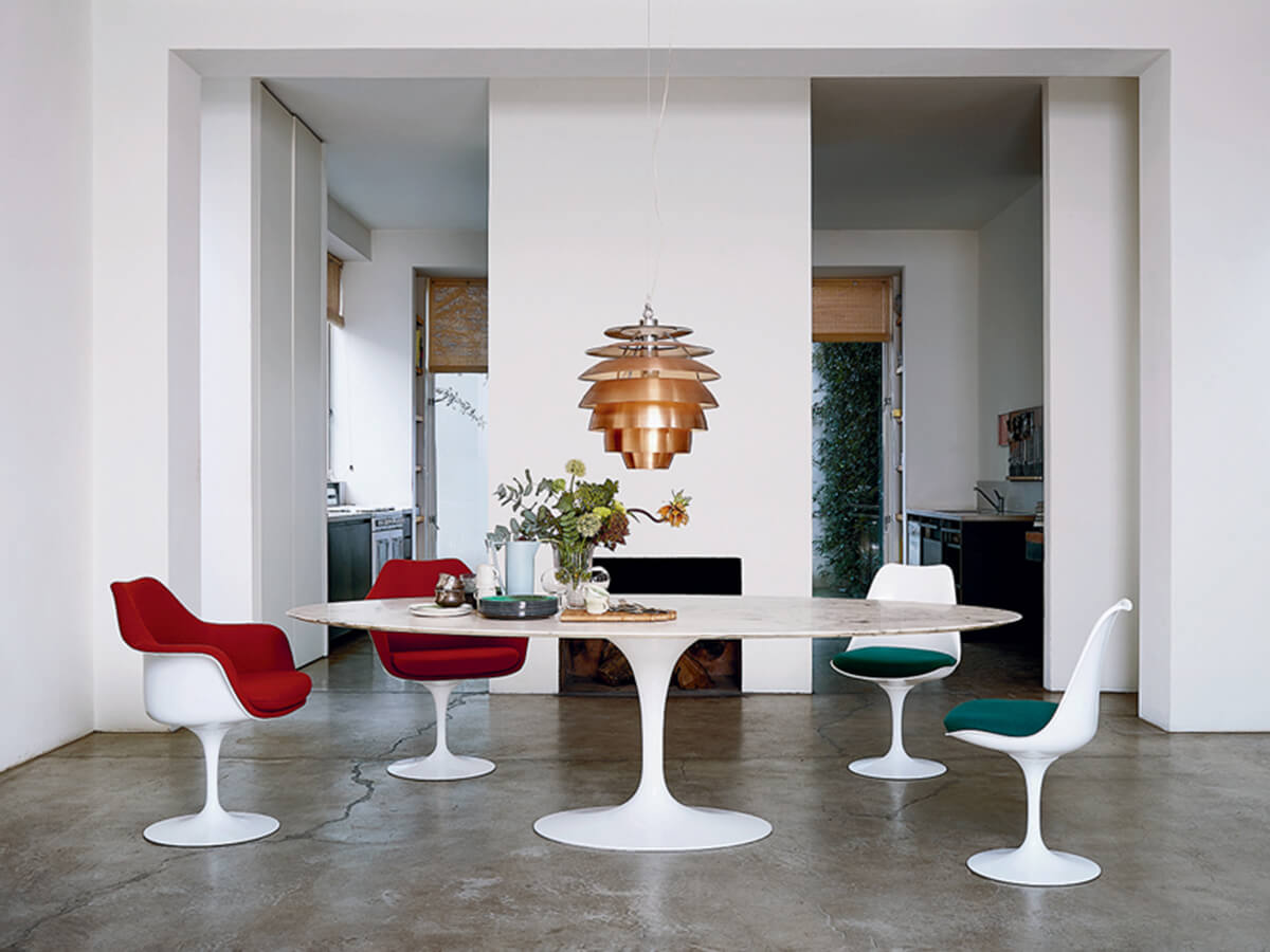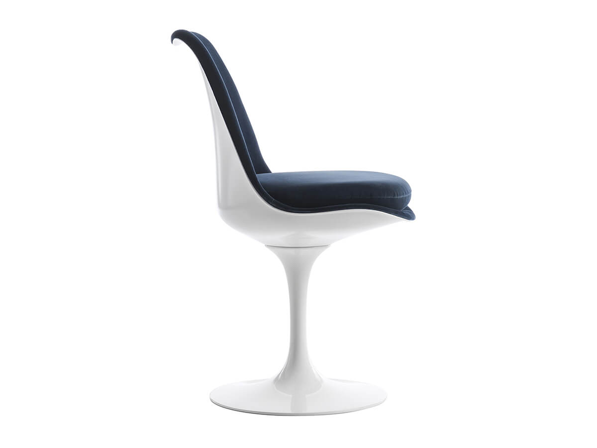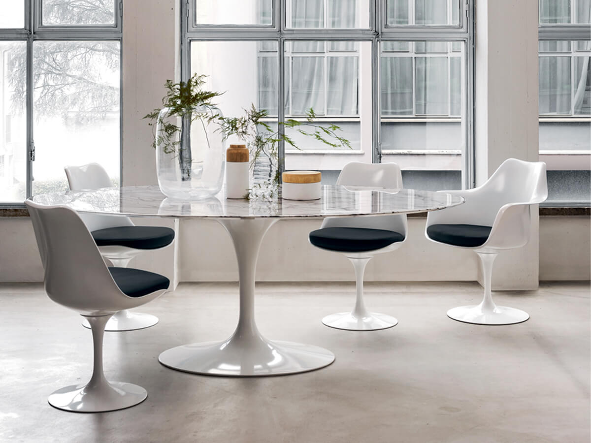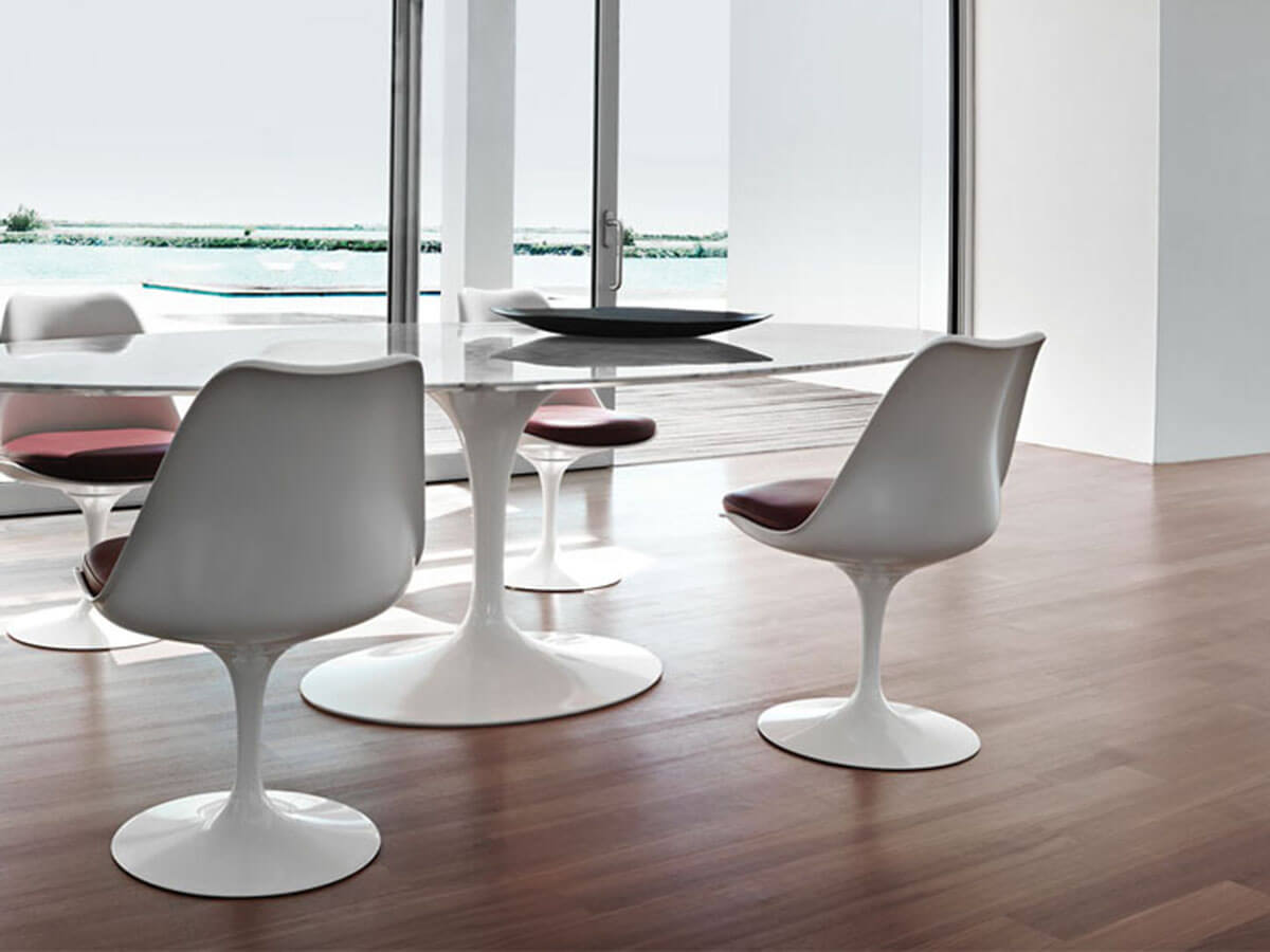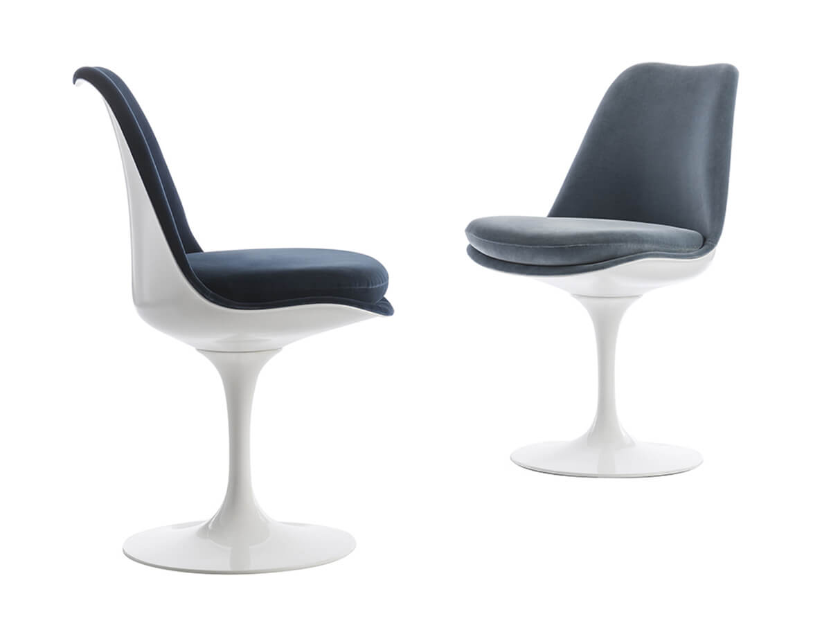 Since its creation in 1957, the Tulip chair by Knoll has become one of the most recognizable and well-known pieces of the company, a sort of backbone capable of defining many of its stylistic peculiarities in the common imagination. Originally designed by Eero Saarinen to solve the onerous problem of the four legs of tables and legs, the entire Saarinen collection rests on a single, beautifully modeled support whose elegance does not fear the passage of time. Available in numerous variants with or without armrests, as well as various conformations of the shell and cushion, Tulip is still today a versatile piece of furniture, which can be placed in the living room or in the most convivial area of the house. Among the numerous versions, Tulip also offers the possibility to choose between fixed and swivel.