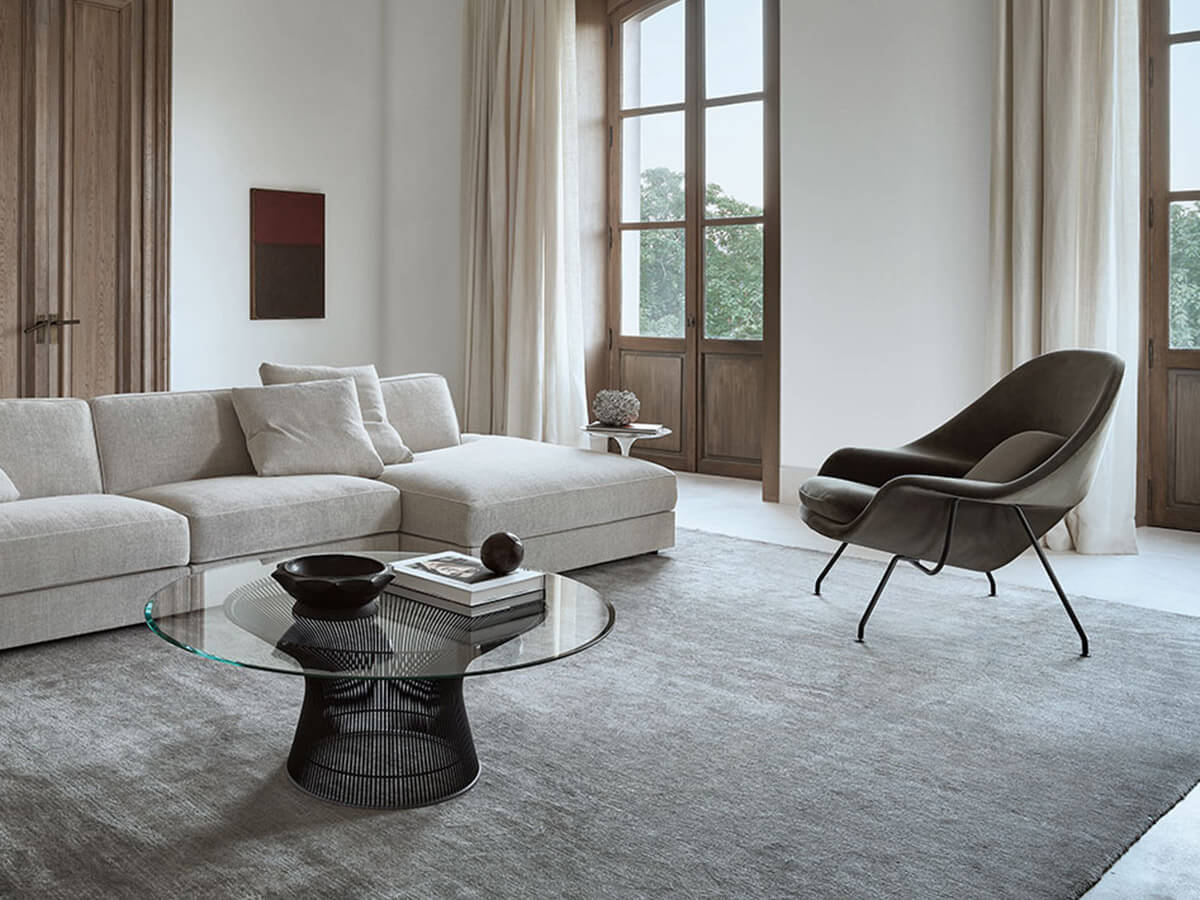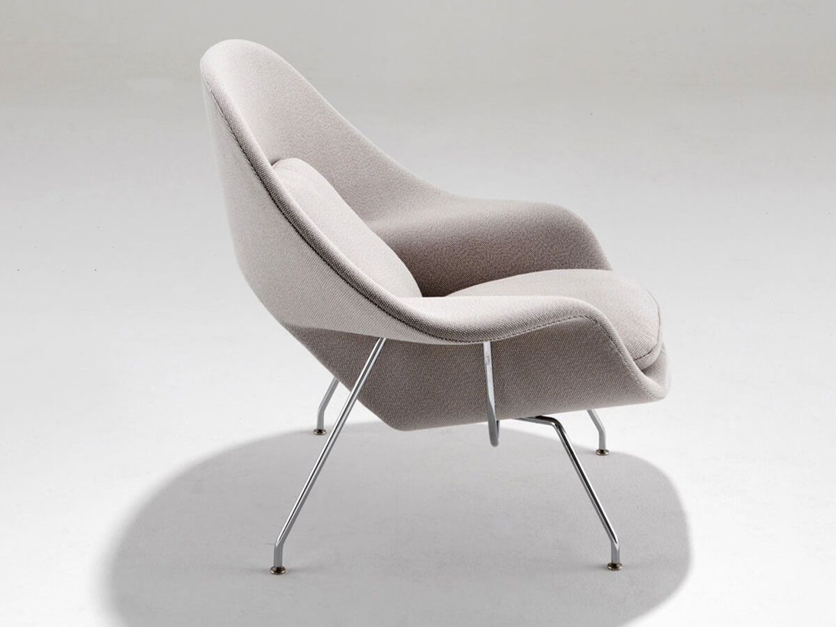 The Womb Chair represents one the most ionic example of comfort and modernity of Knoll company, merged into a model that since 1948, the year in which production began, continues to dictate the style of our time. Eero Saarinen designed this armchair with a special consideration for rounded and naturally enveloping shapes, capable of inducing the eye to a comfort confirmed by the materials and finishes used. The resulting design is incredibly detailed, divided between an extremely light steel support structure and the complex seat that includes poufs and cushions. Available in three sizes, small, medium and standard, Womb Chair can be correlated with an accompanying ottoman, ideal for ensuring even greater comfort.