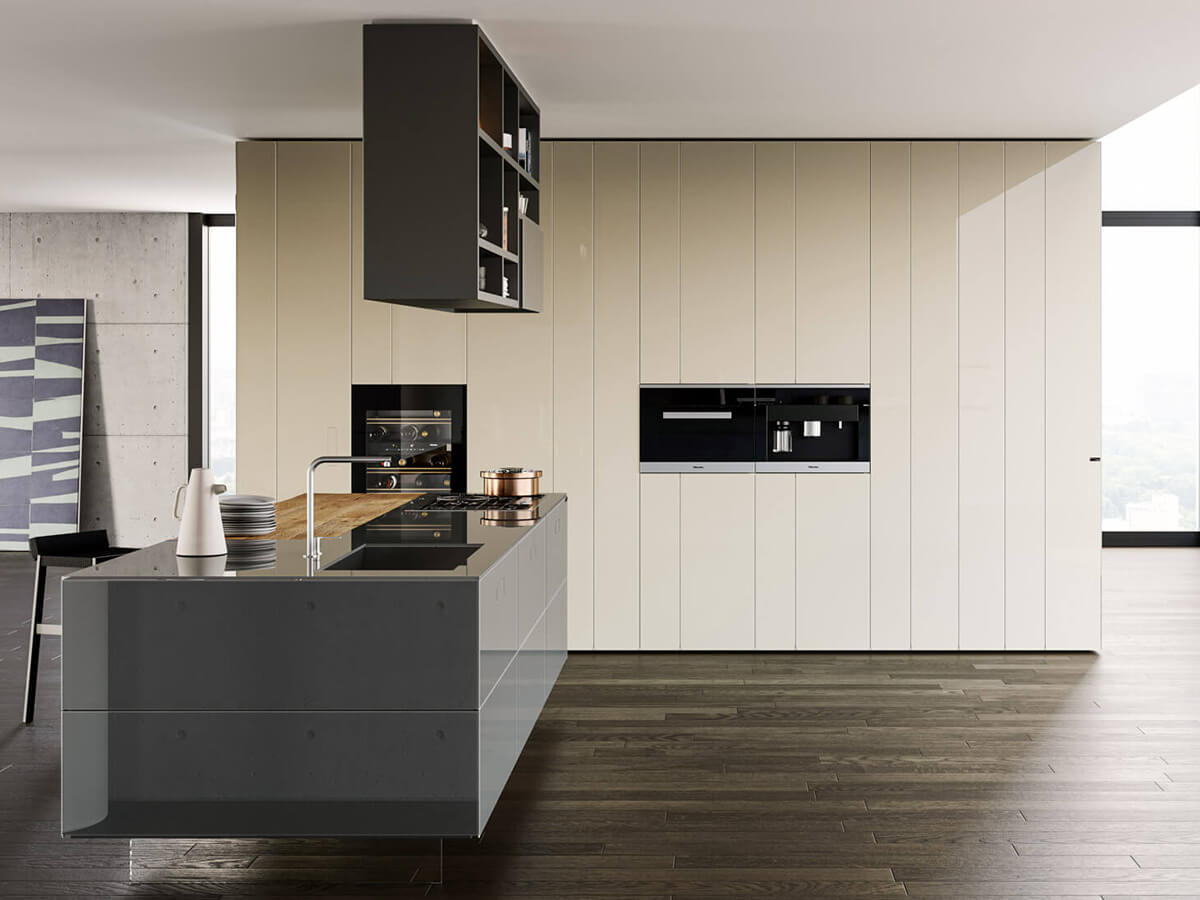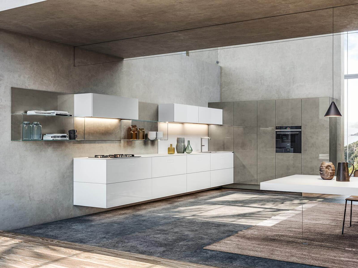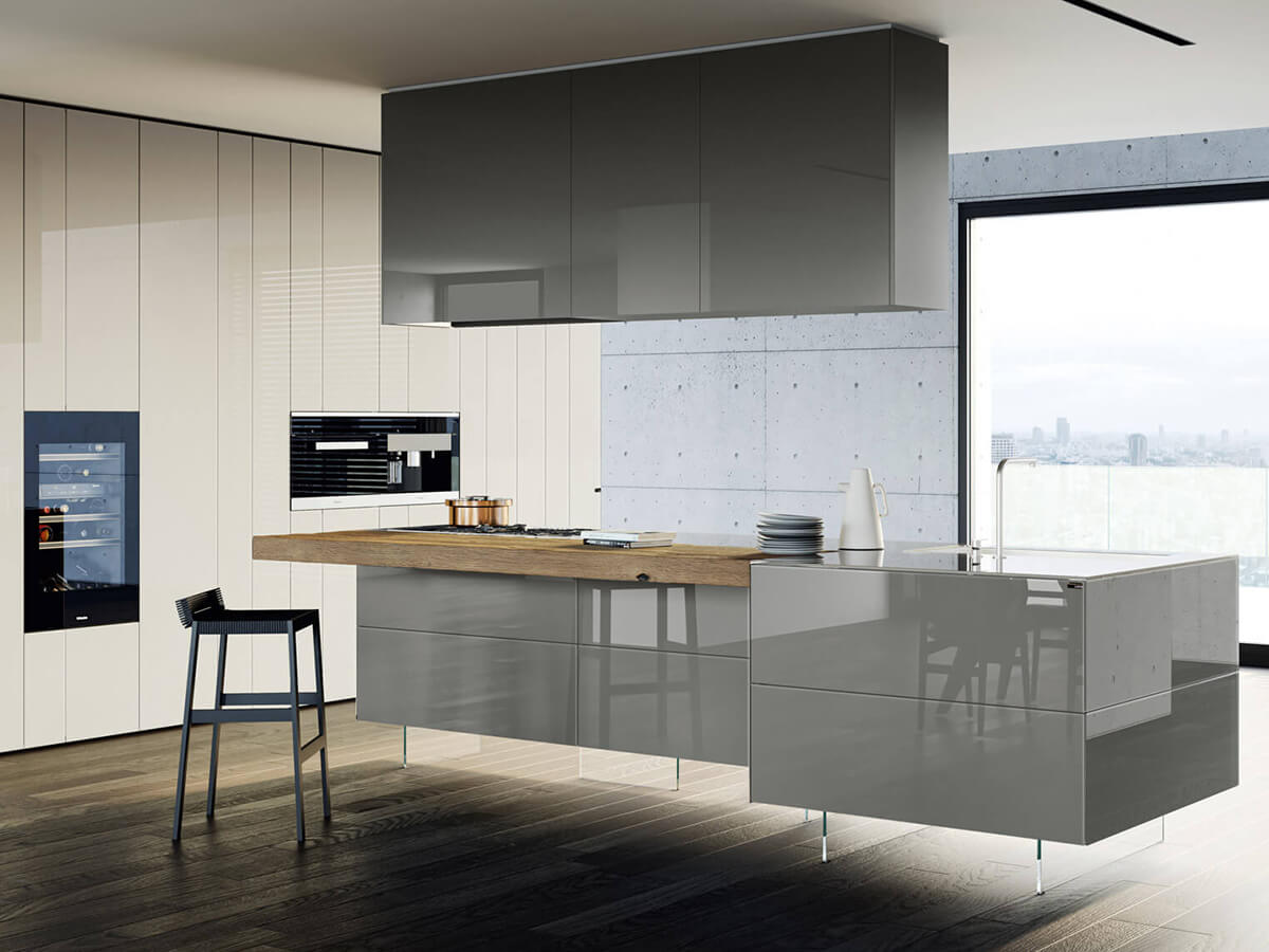 The 36e8 Glass kitchen by Lago uses colored parallelepipeds suspended and covered in glass to create an environment with a clean and airy design. The chromatic reflections of the glass capture the light and give more depth to the colors, giving the whole kitchen a fresh and bright, empathetic and welcoming tone.Like many other Lago creations, the impression of extreme lightness creates compositions that seem to float, with the wall units fixed to the wall at a distance of several centimeters from the floor and the island modules suspended on invisible sheets of transparent glass.But 36e8 Glass does not find its strengths in the visual rendering alone: it is also a highly functional kitchen, hygienic and easy to clean, very resistant to bumps and scratches. The laminate top is an exclusive patent with a glass effect edge, resistant and practical.