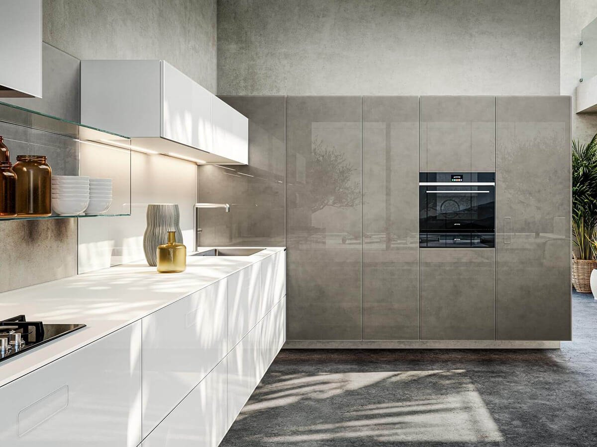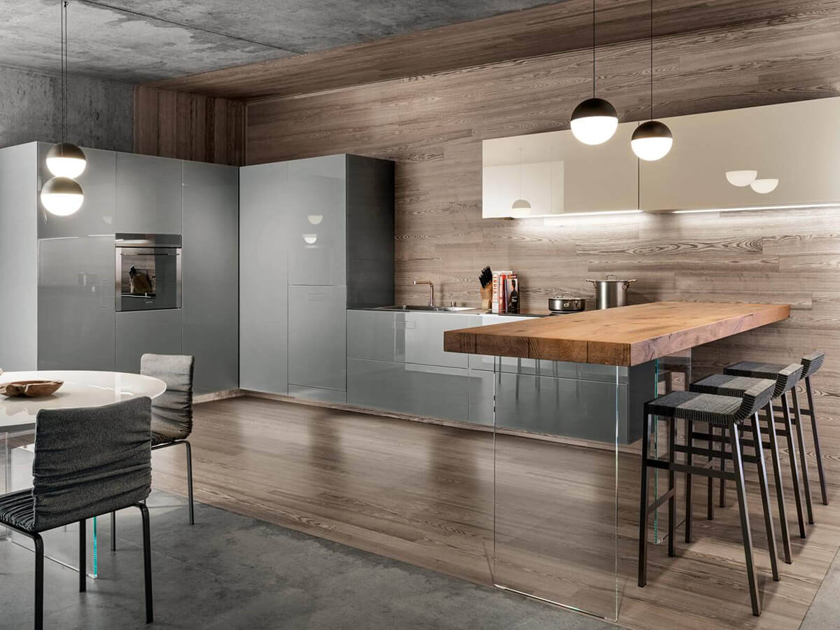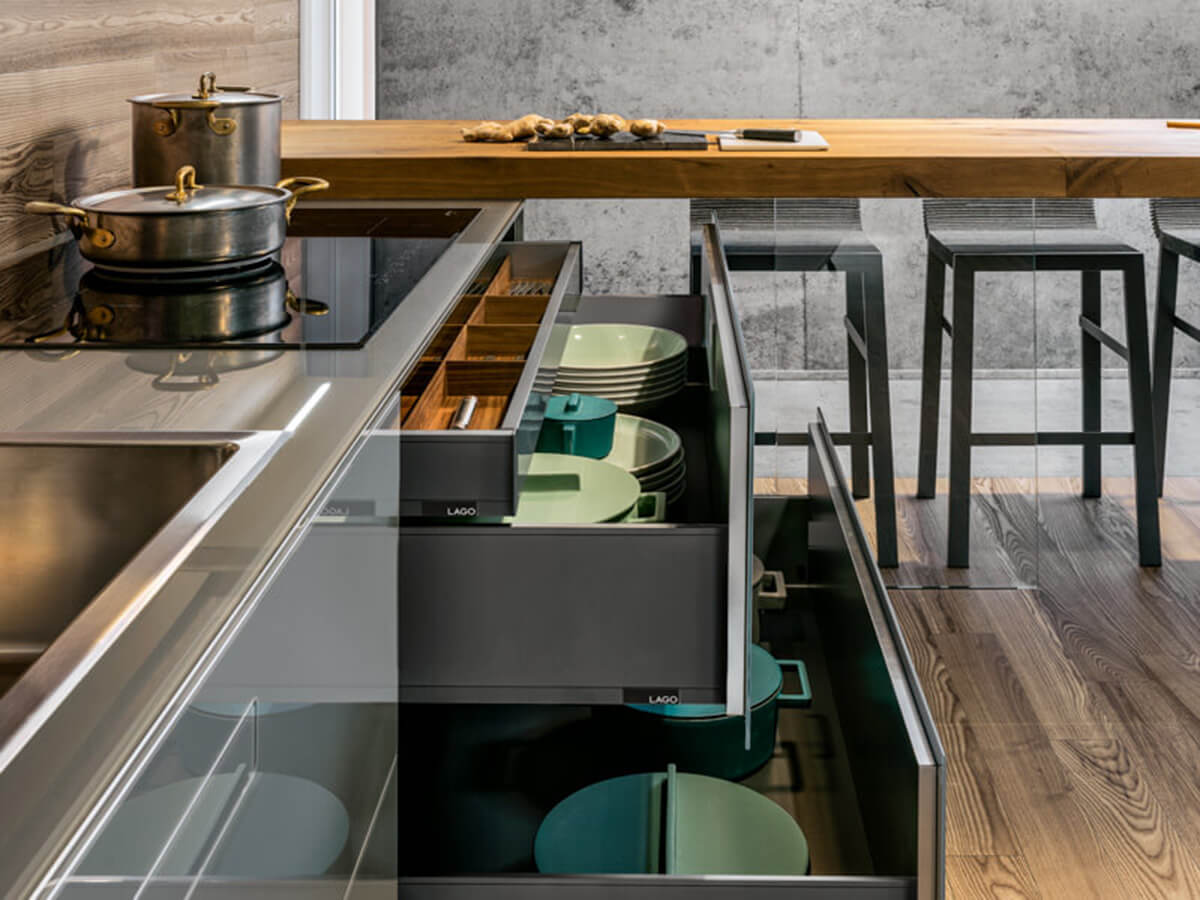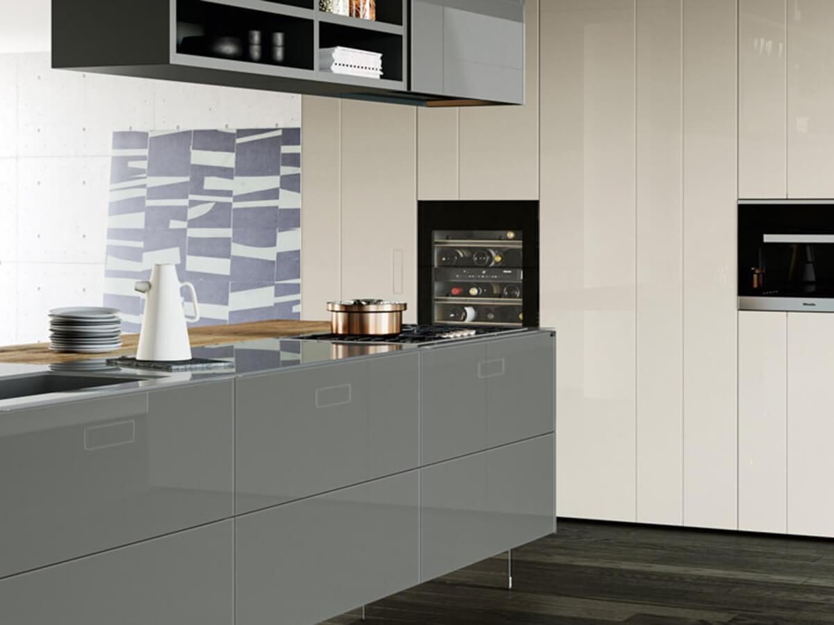 The 36e8 Glass kitchen by Lago uses colored parallelepipeds suspended and covered in glass to create an environment with a clean and airy design. The chromatic reflections of the glass capture the light and give more depth to the colors, giving the whole kitchen a fresh and bright, empathetic and welcoming tone.Like many other Lago creations, the impression of extreme lightness creates compositions that seem to float, with the wall units fixed to the wall at a distance of several centimeters from the floor and the island modules suspended on invisible sheets of transparent glass.But 36e8 Glass does not find its strengths in the visual rendering alone: it is also a highly functional kitchen, hygienic and easy to clean, very resistant to bumps and scratches. The laminate top is an exclusive patent with a glass effect edge, resistant and practical.