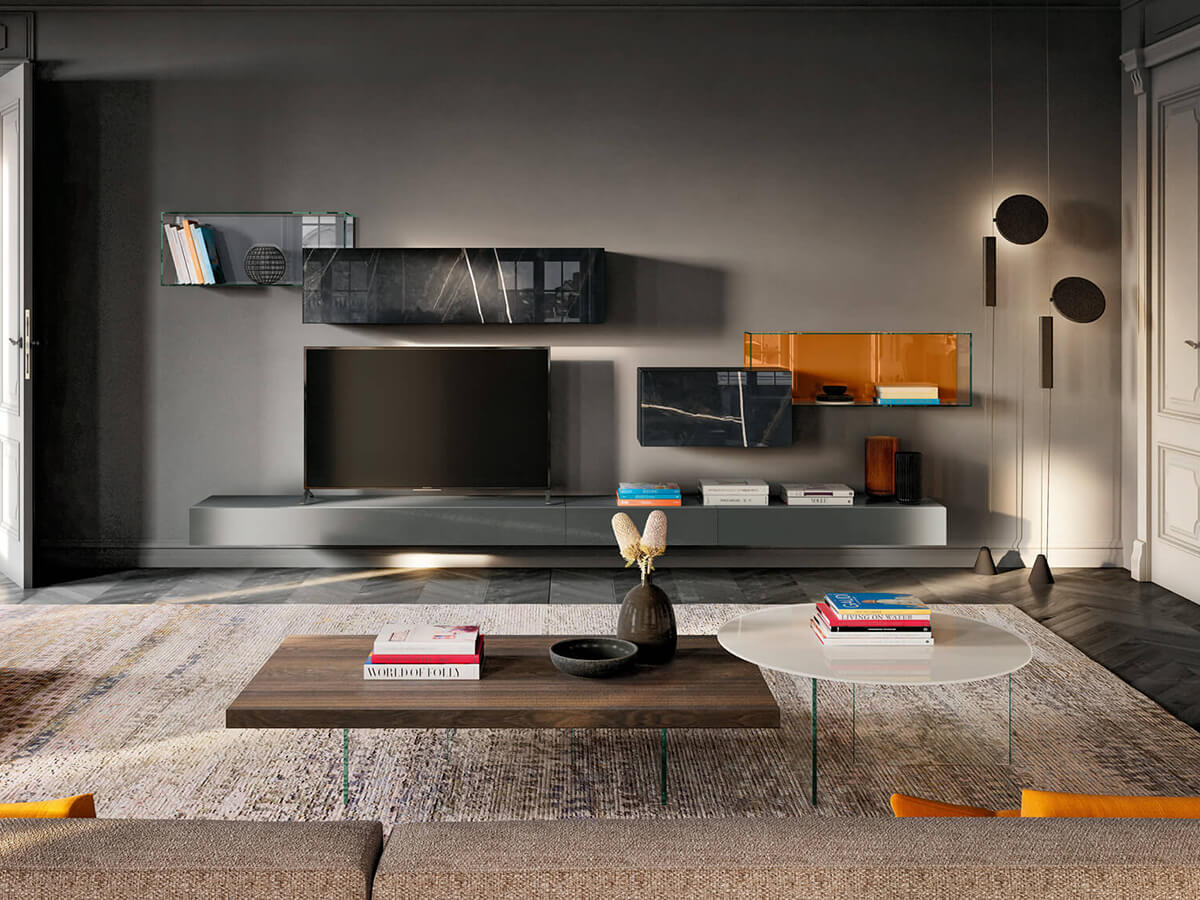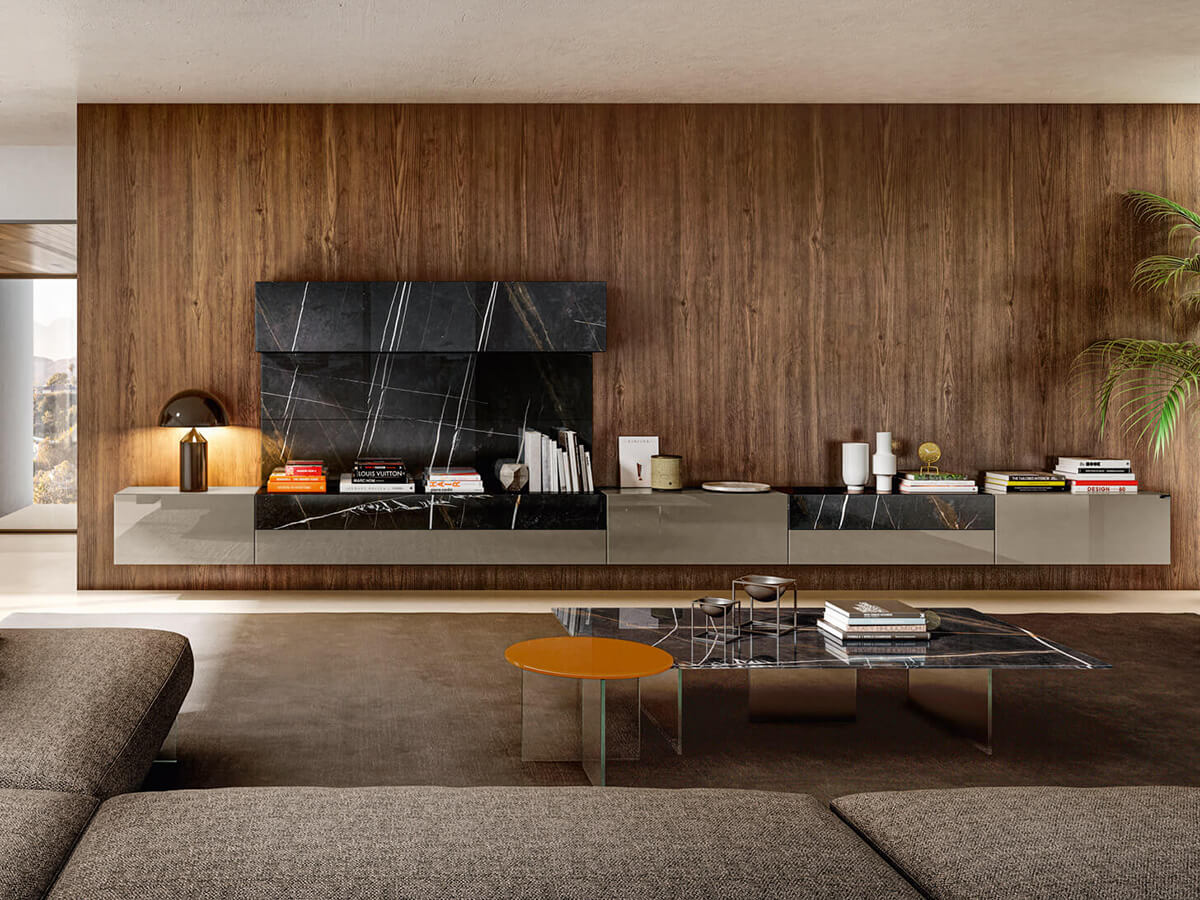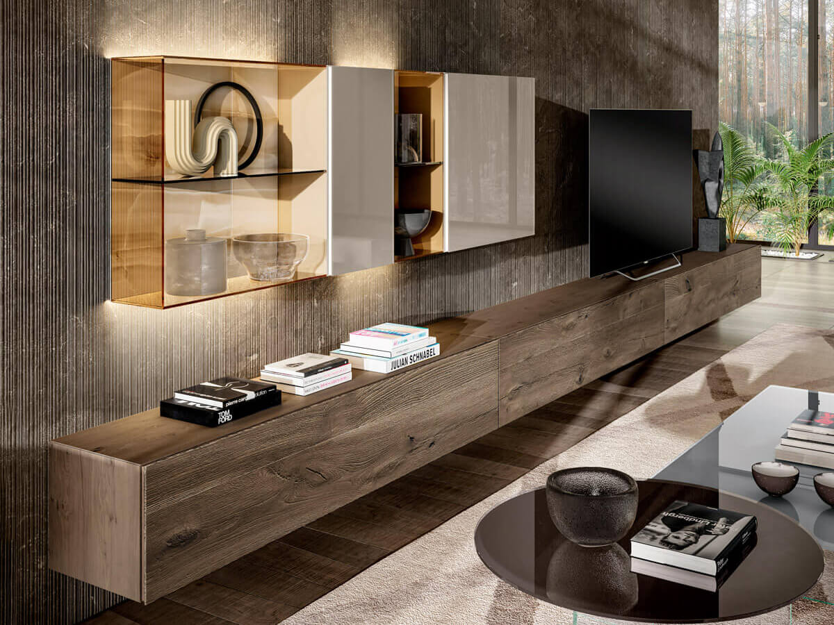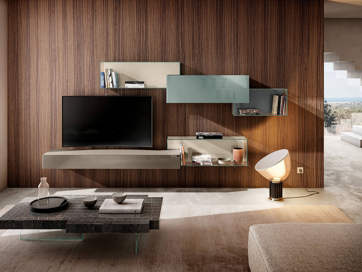Lago's 36e8 TV unit takes its name from the measurements of its basic module: a 36.8 x 36.8 cm square which, in combination with its multiples and submultiples, is able to create tailor-made compositions that are perfect for every need. 36e8 can thus give life to light systems with suspended storage units, wall units and display cabinets. The simplicity of the concept finds its exaltation in the quality of the details, from the internal lacquering to the 45 ° bevel of the corners, and in the possibility of opting for special finishes those of the Lago X Glass system, which allows you to create prints on glass that recreate in practical way the effect of precious materials such as wood or metal, or like Wildwood, a centenary oak with majestic veins.