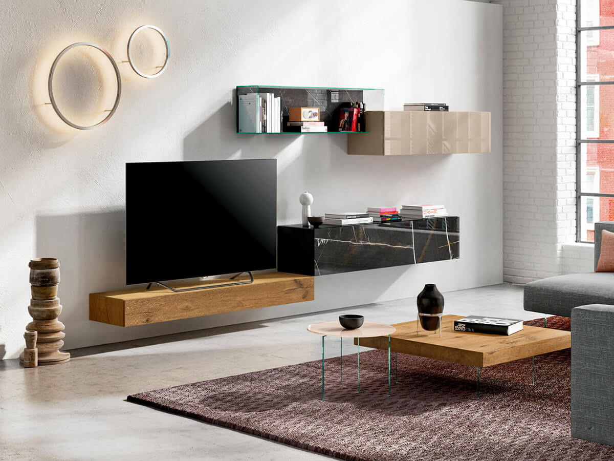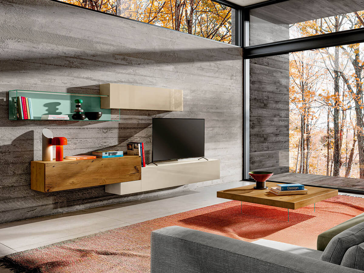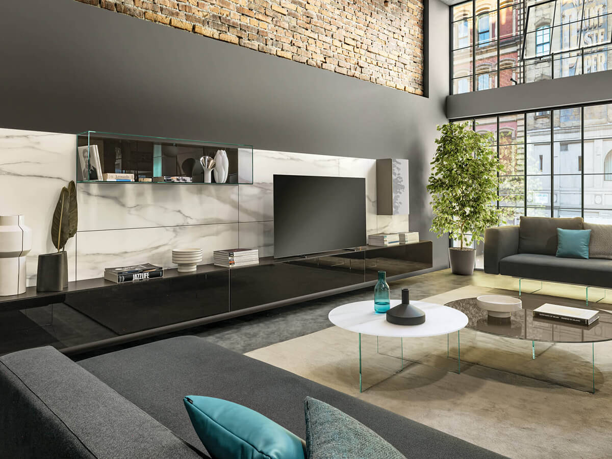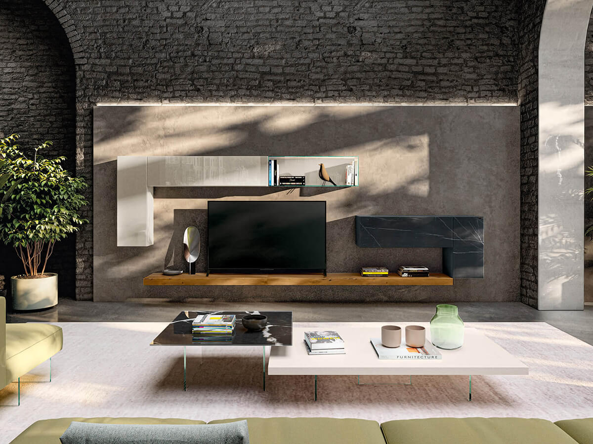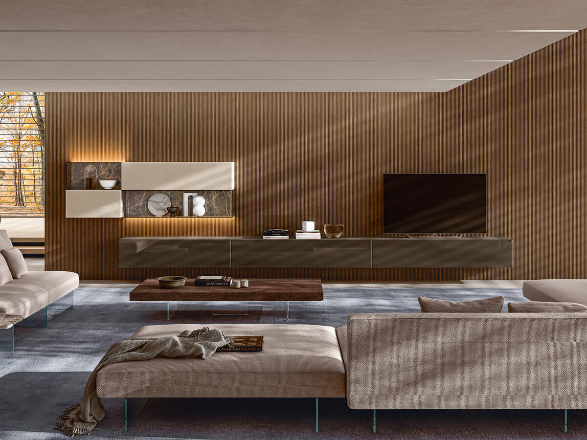 Lago's 36e8 TV unit takes its name from the measurements of its basic module: a 36.8 x 36.8 cm square which, in combination with its multiples and submultiples, is able to create tailor-made compositions that are perfect for every need. 36e8 can thus give life to light systems with suspended storage units, wall units and display cabinets. The simplicity of the concept finds its exaltation in the quality of the details, from the internal lacquering to the 45 ° bevel of the corners, and in the possibility of opting for special finishes those of the Lago X Glass system, which allows you to create prints on glass that recreate in practical way the effect of precious materials such as wood or metal, or like Wildwood, a centenary oak with majestic veins.