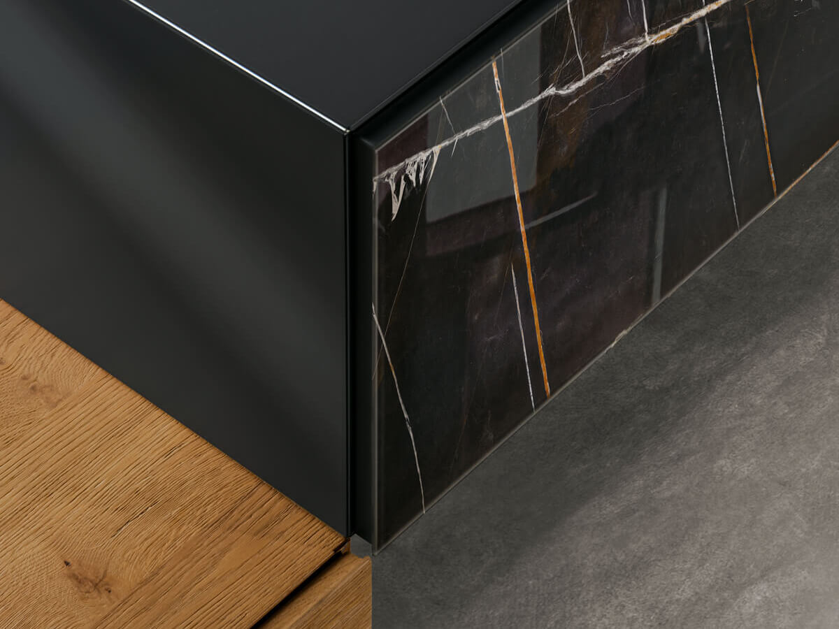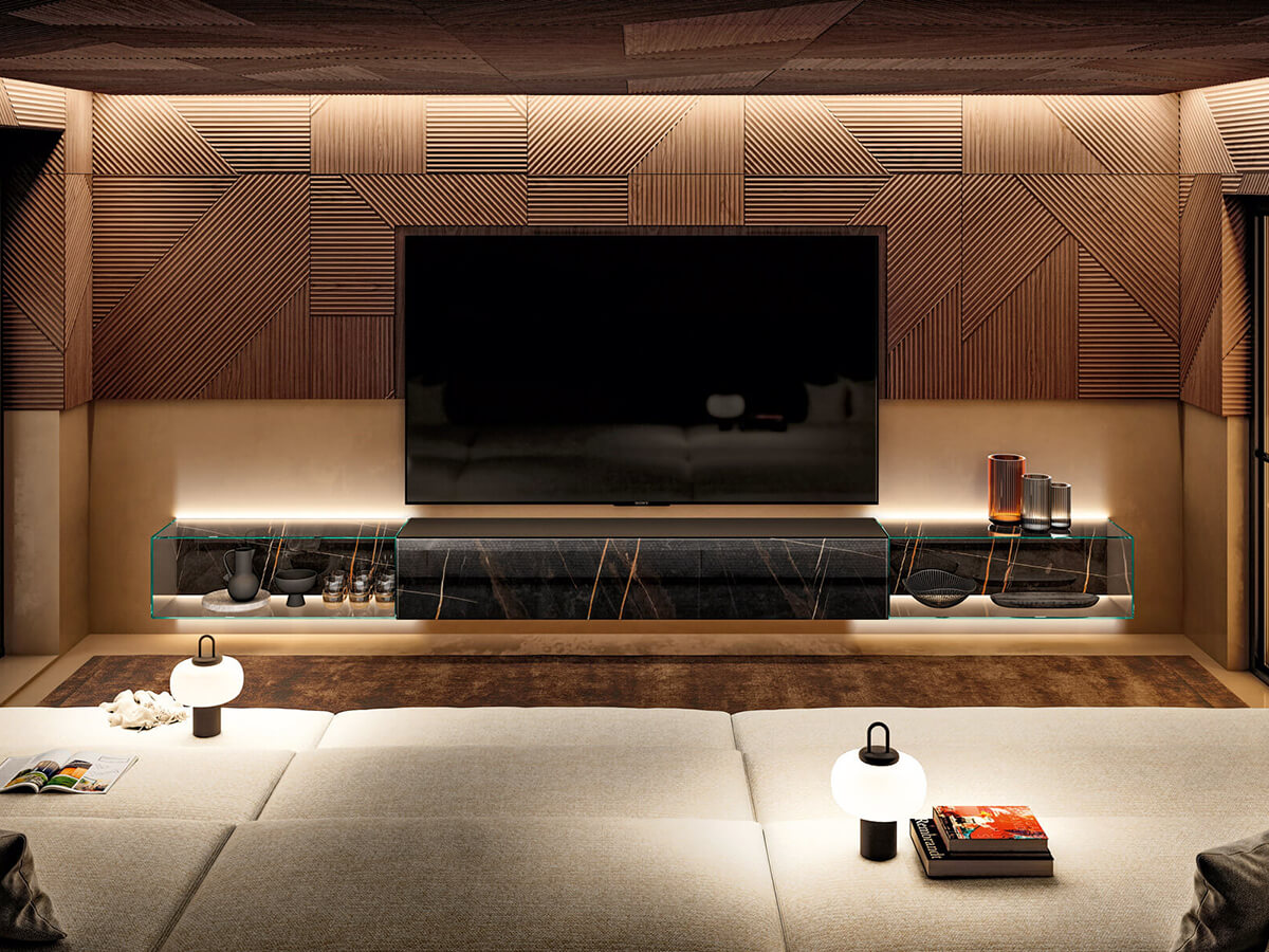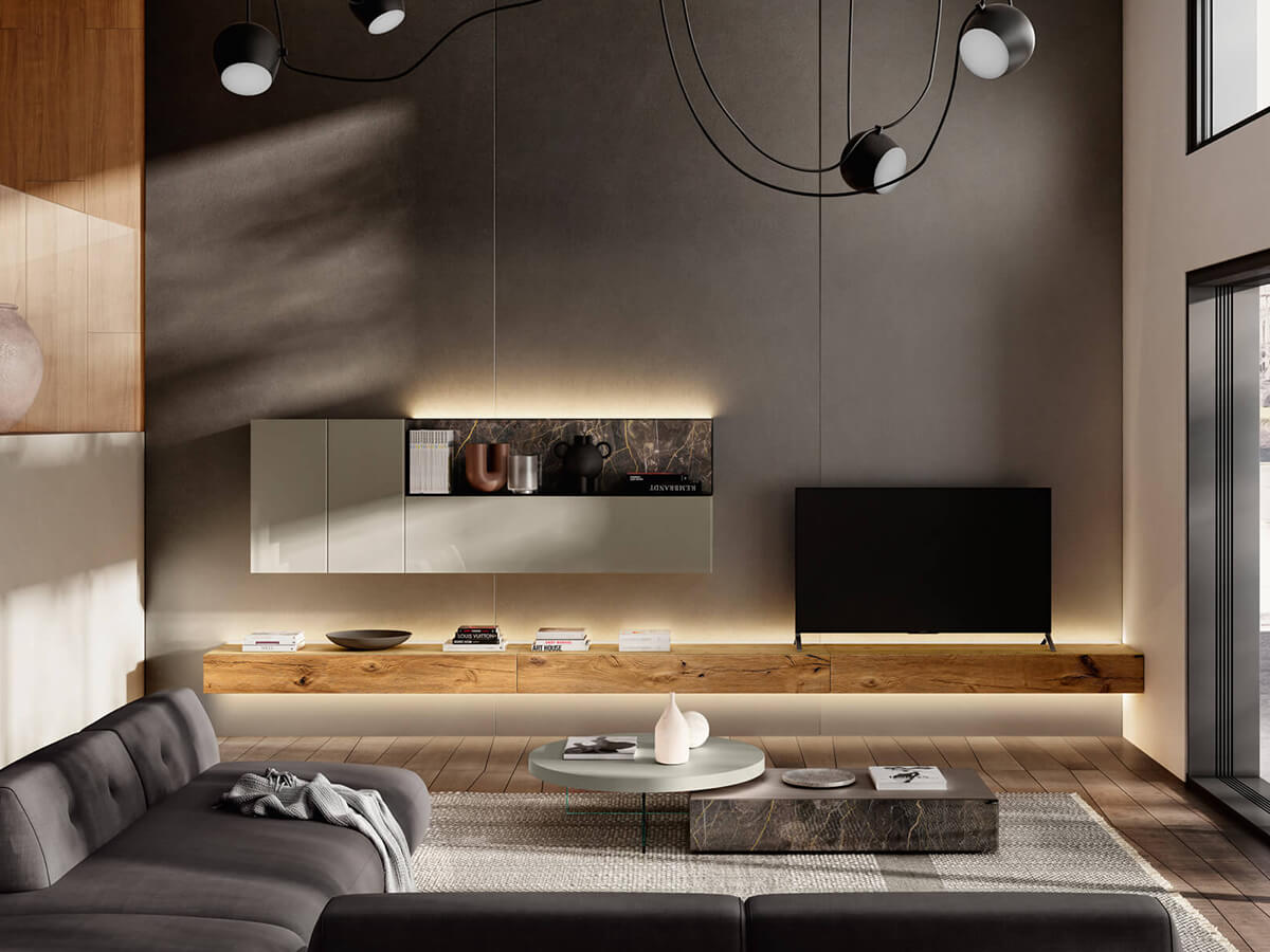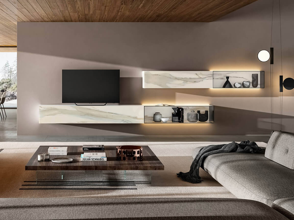 Lago's 36e8 TV unit takes its name from the measurements of its basic module: a 36.8 x 36.8 cm square which, in combination with its multiples and submultiples, is able to create tailor-made compositions that are perfect for every need. 36e8 can thus give life to light systems with suspended storage units, wall units and display cabinets. The simplicity of the concept finds its exaltation in the quality of the details, from the internal lacquering to the 45 ° bevel of the corners, and in the possibility of opting for special finishes those of the Lago X Glass system, which allows you to create prints on glass that recreate in practical way the effect of precious materials such as wood or metal, or like Wildwood, a centenary oak with majestic veins.