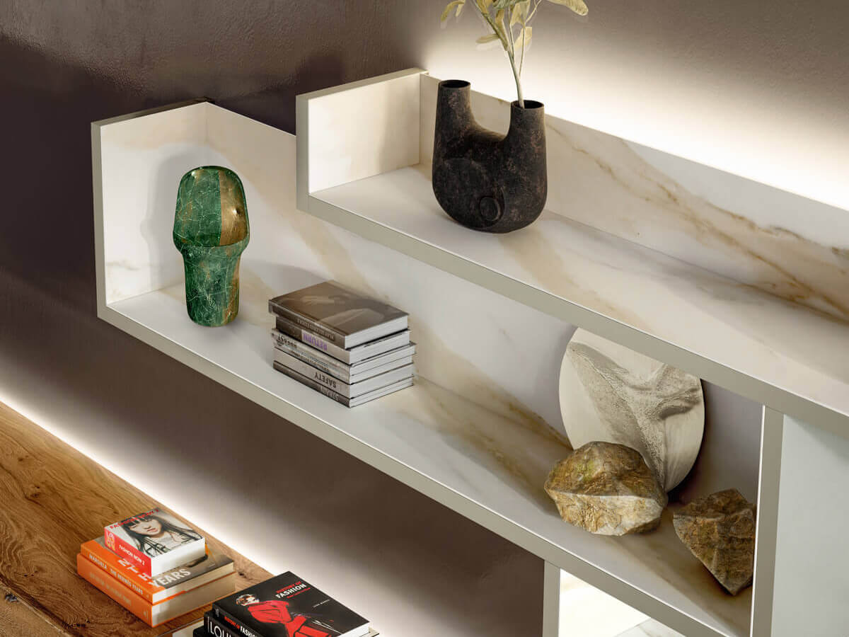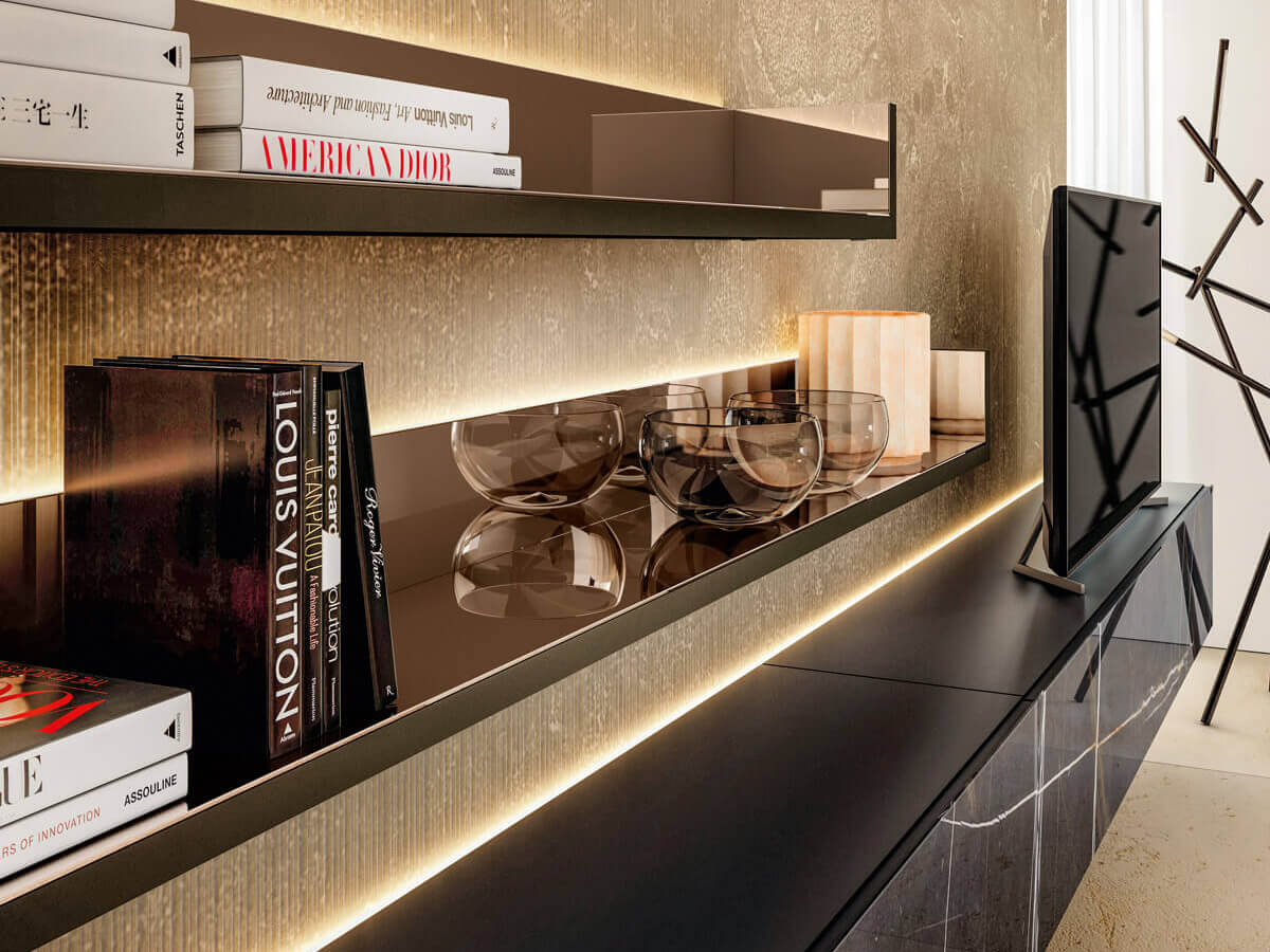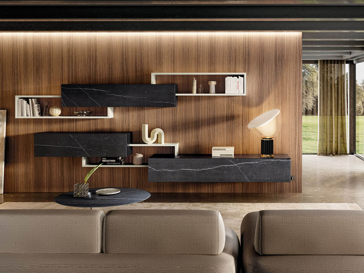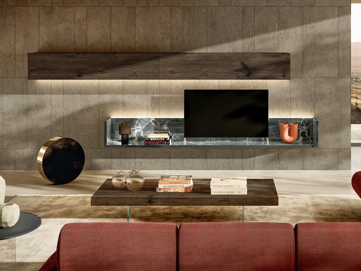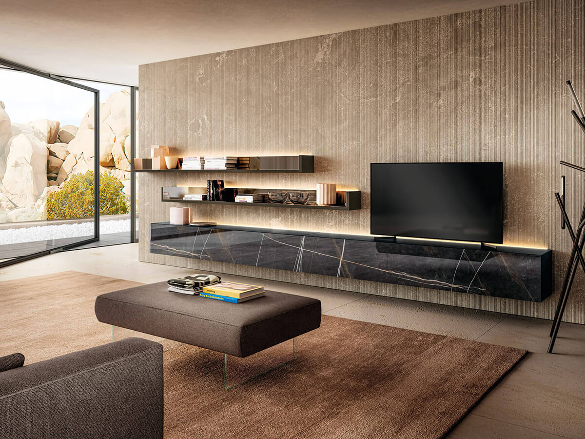 The Lagolinea system is based on an innovative patented suspension mechanism, hidden in the thickness of the side, which allows the creation of elaborate compositions free from any constraint. It is therefore perfect for creating customized, agile and elegant TV parts, totally customizable in shapes, colors and materials. In this capacity it can be proposed alone or in composition with the containers of the 36e8 line, allowing the alternation of open spaces and closed volumes and giving life to always different compositions for each project.