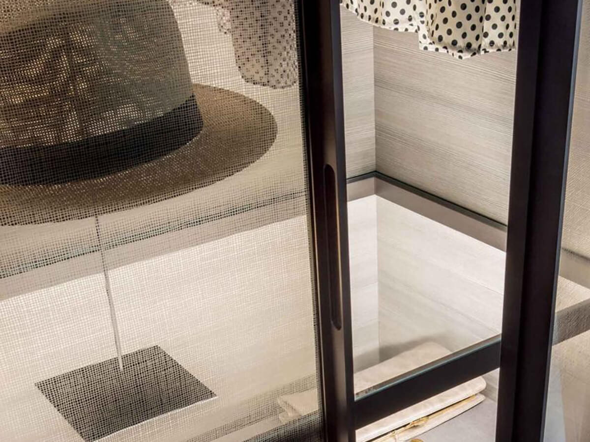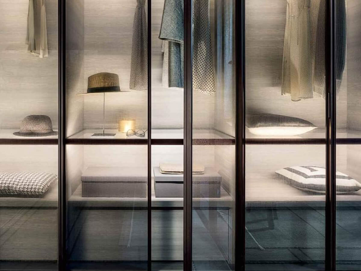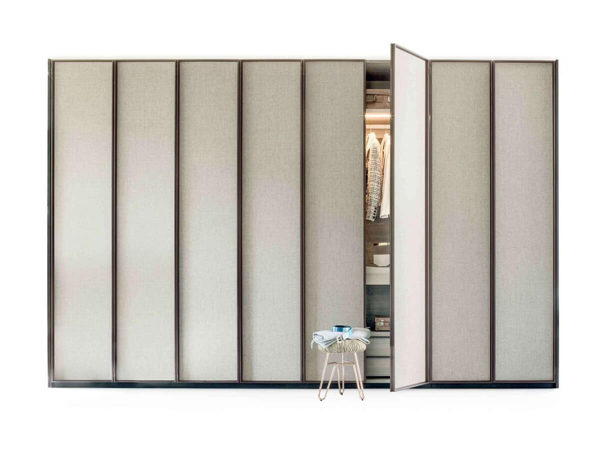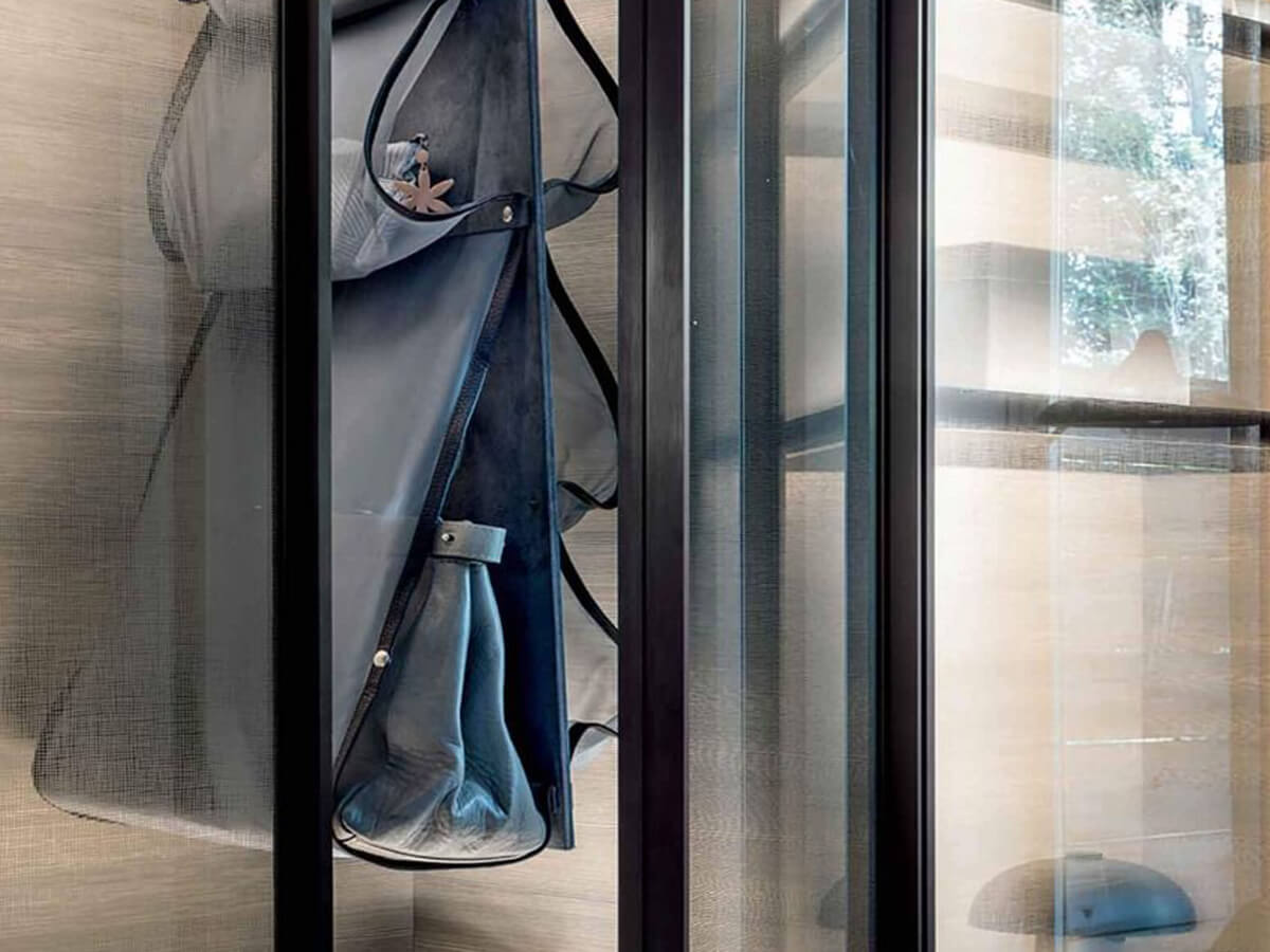 The Dandy wardrobe is part of the famous Lema Armadio al Centimetro collection, of which it best embodies the philosophy of extreme design flexibility. The Dandy door is characterized by the presence of a metal perimeter frame that frames a glass panel, available in different treatments - from transparent glass to bronzed or smoked glass, or mirrored and lacquered glass. A completely different but equally luxurious effect is obtained instead with the textile or leather finishes of the central panel, which recall suggestions of an oriental style.Dandy can only be used for compositions with hinged doors and can be customized with the wide range of exclusive internal equipment from the “Armadio al Centimetro” collection.