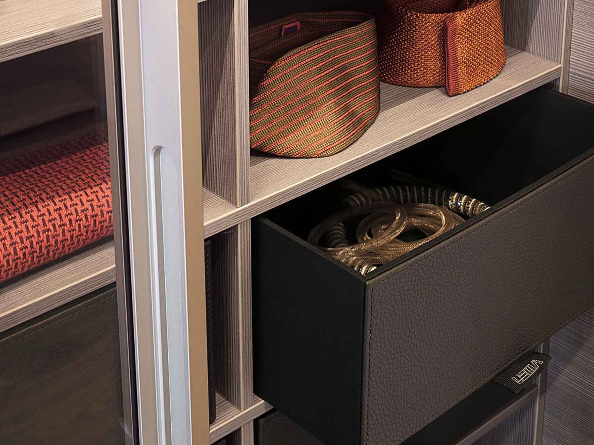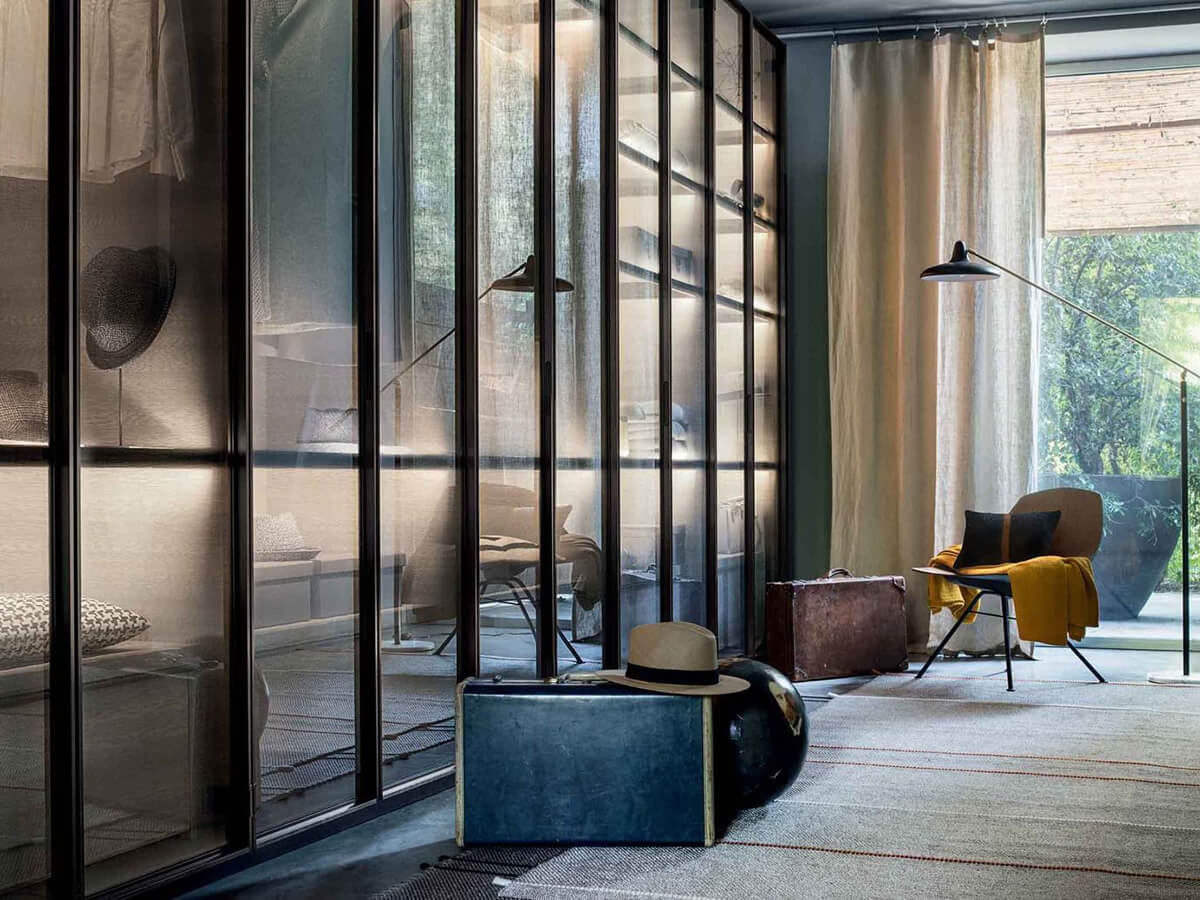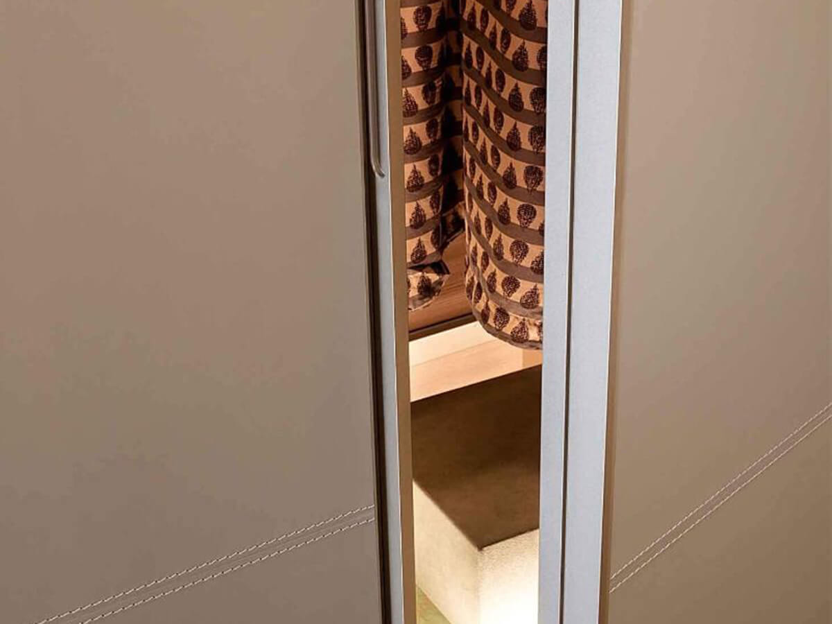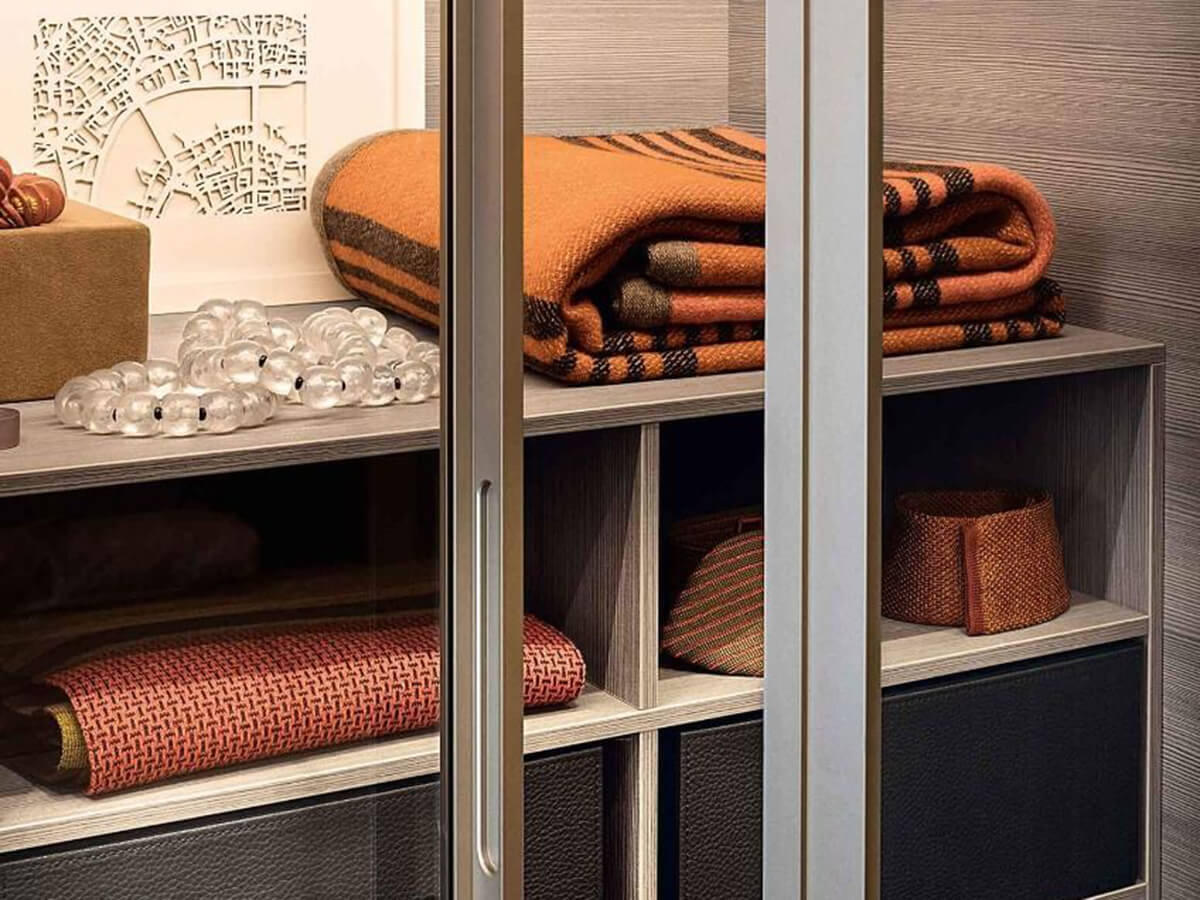 The Dandy wardrobe is part of the famous Lema Armadio al Centimetro collection, of which it best embodies the philosophy of extreme design flexibility. The Dandy door is characterized by the presence of a metal perimeter frame that frames a glass panel, available in different treatments - from transparent glass to bronzed or smoked glass, or mirrored and lacquered glass. A completely different but equally luxurious effect is obtained instead with the textile or leather finishes of the central panel, which recall suggestions of an oriental style.Dandy can only be used for compositions with hinged doors and can be customized with the wide range of exclusive internal equipment from the “Armadio al Centimetro” collection.