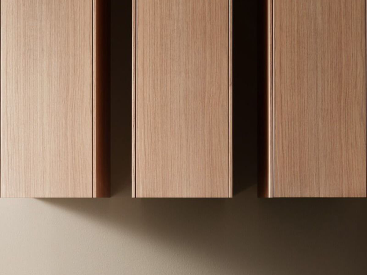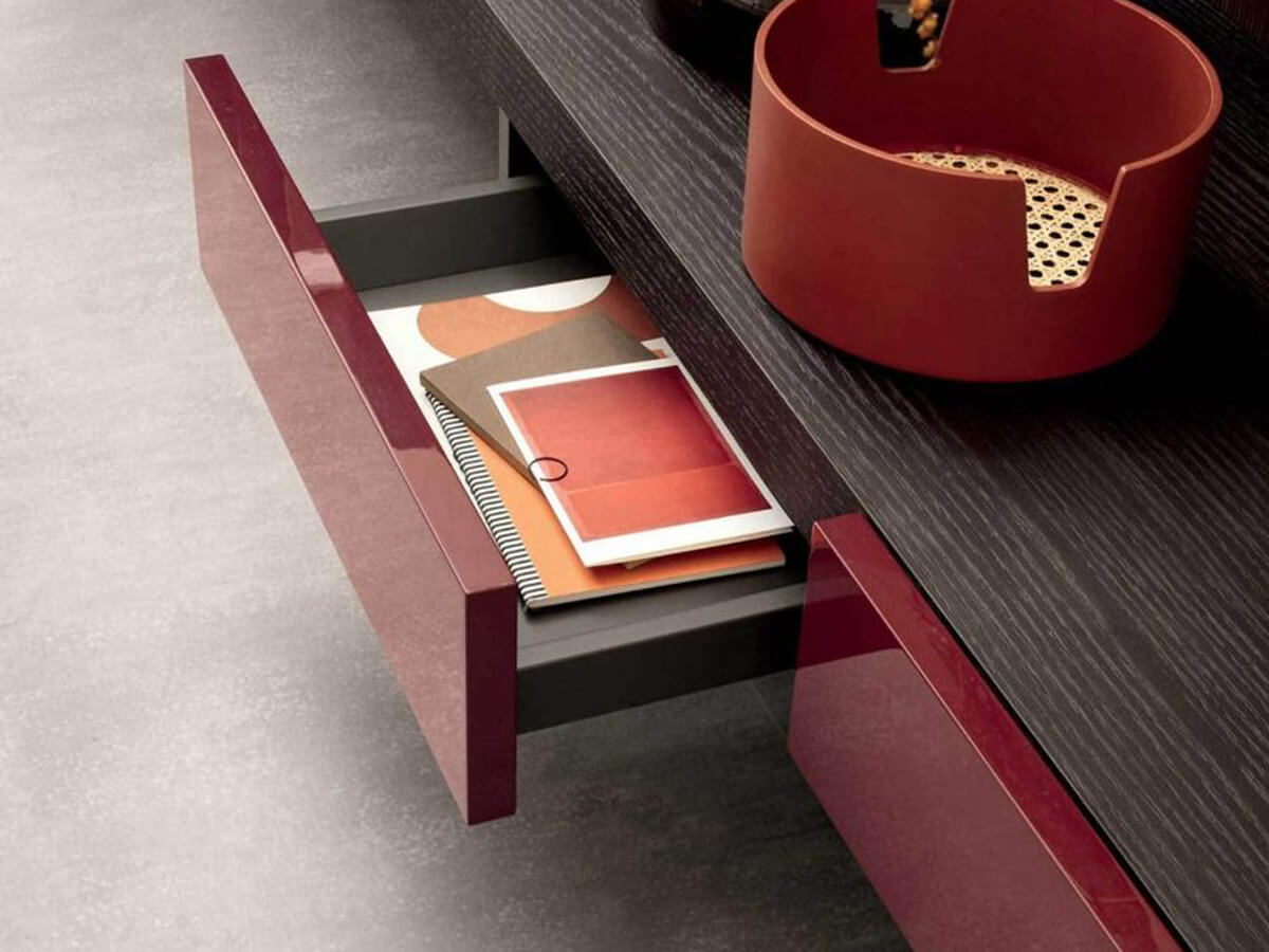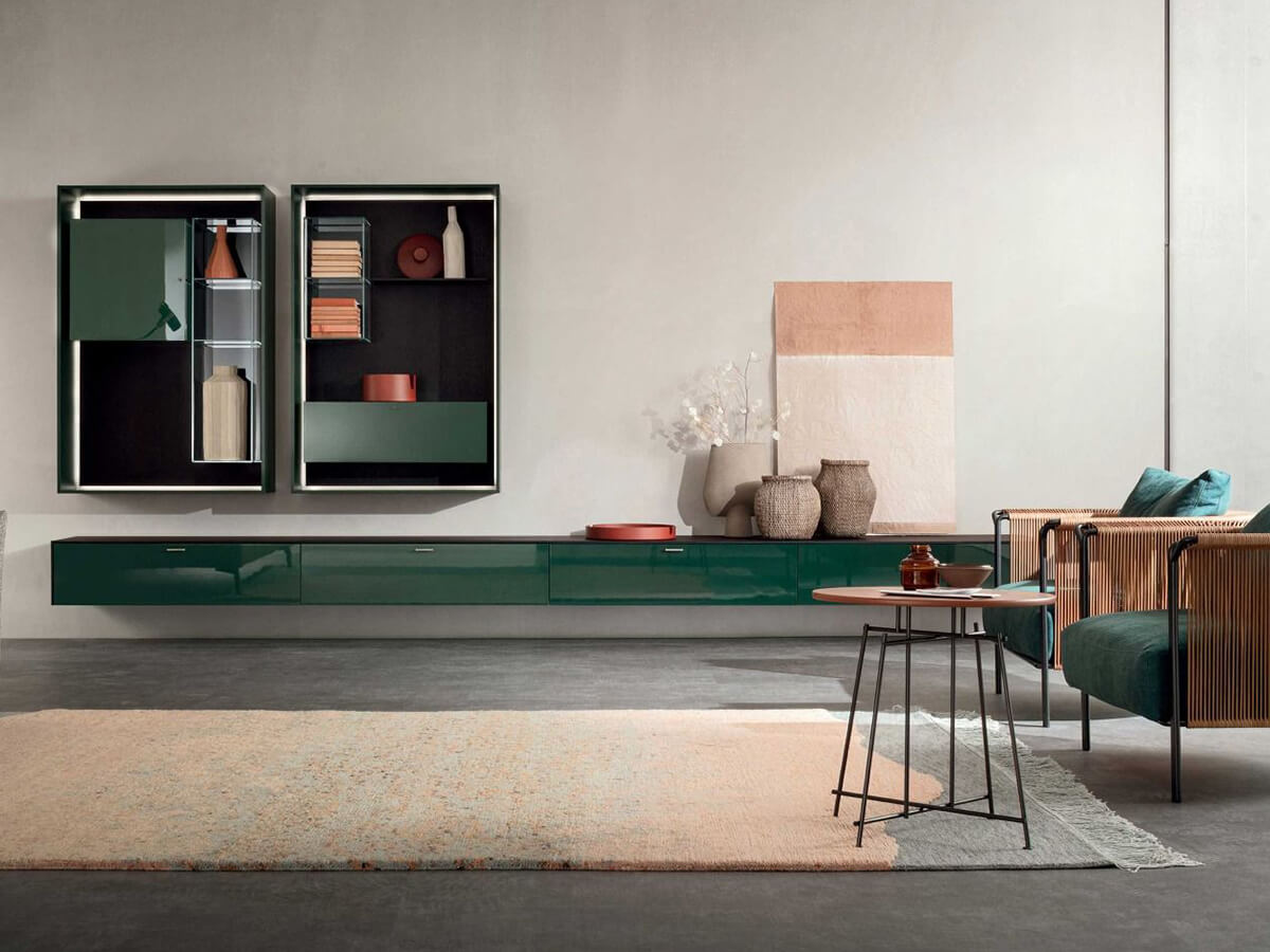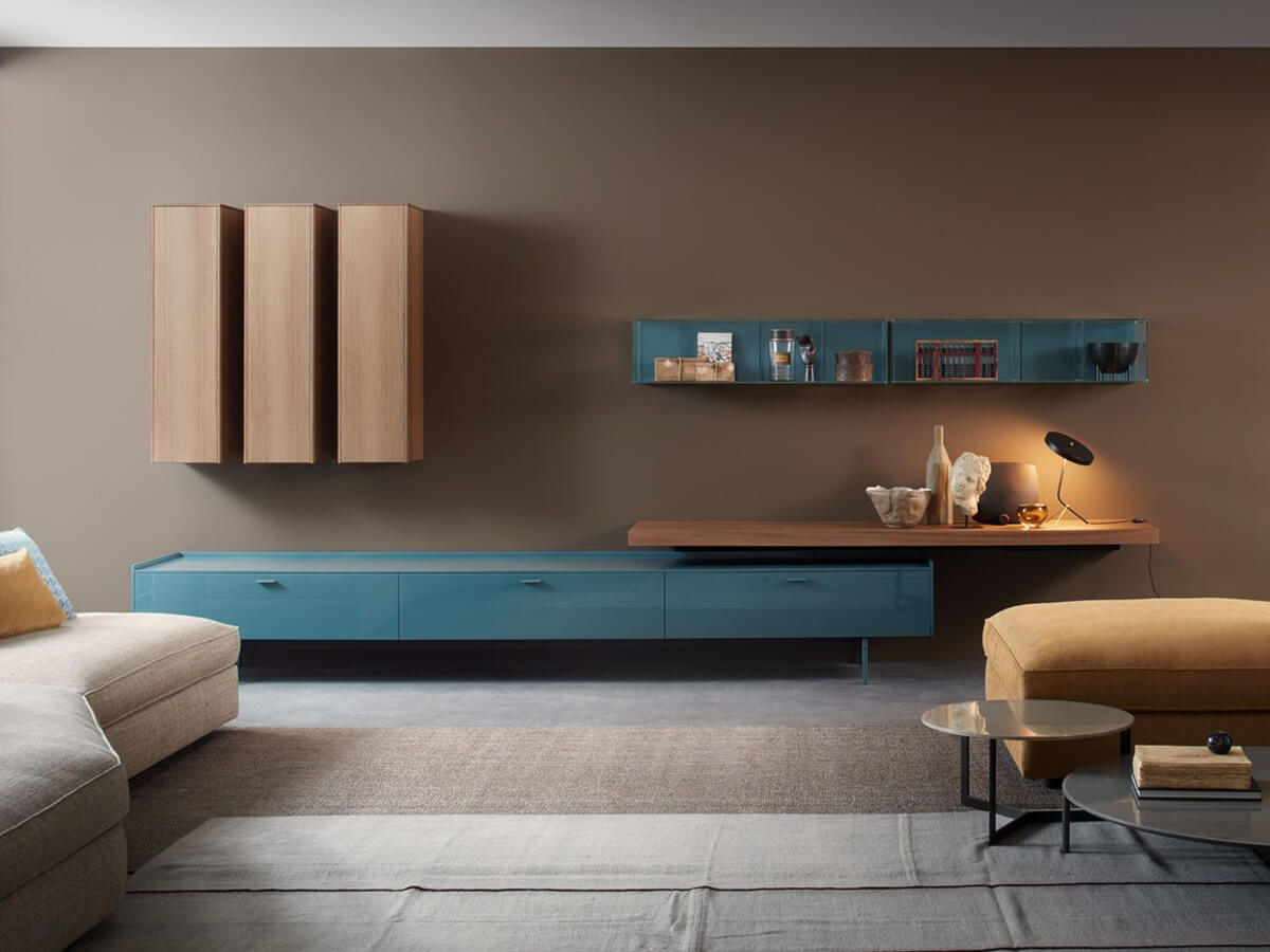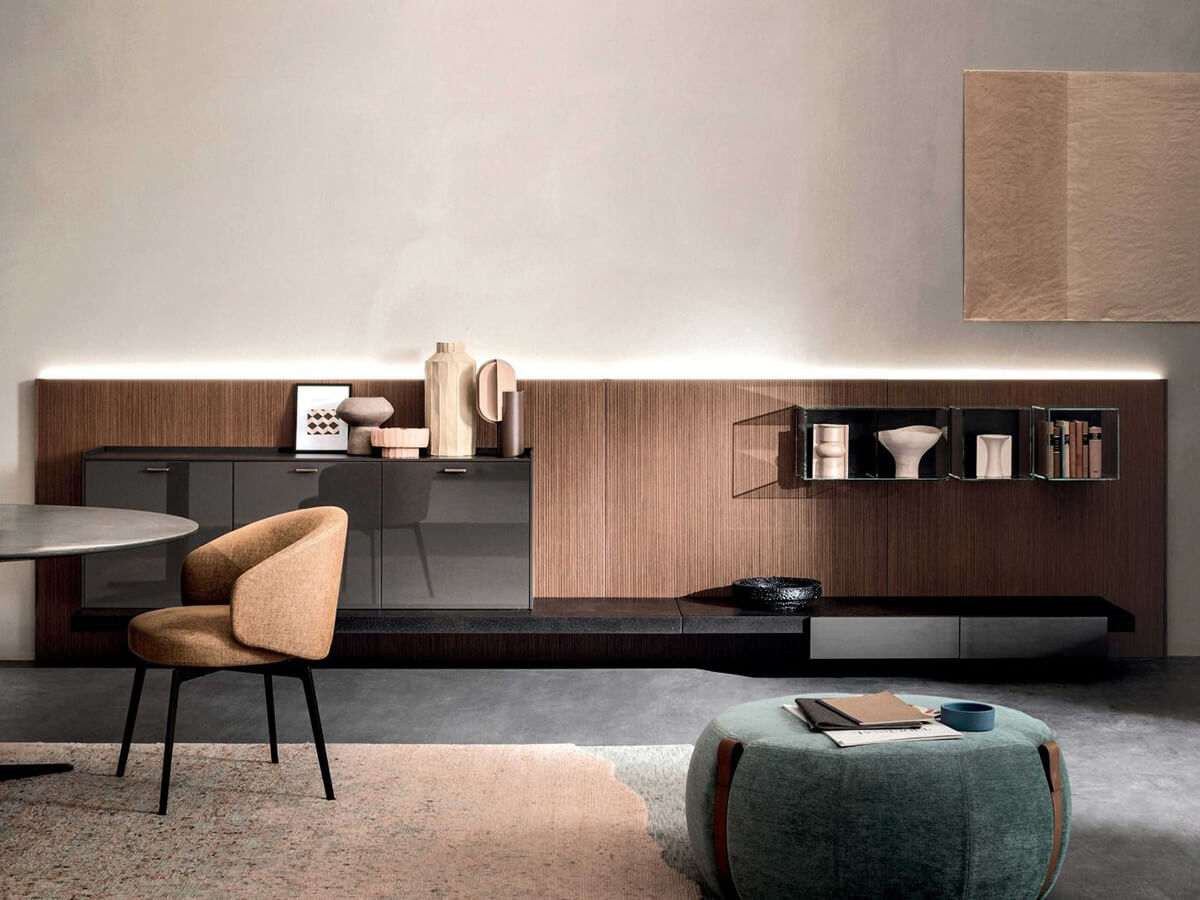 Lema's refined LT40 modular unit is based on a wide range of freely modular storage units and wall elements. Renewed with the delicate touch of designer David Lopez Quincoces, the LT40 system pays great attention to construction details and shades of color, acquiring a highly recognizable identity despite the great variety of compositions it can create. It can take the form of light compositions of suspended containers and display cabinets, enlivened by the slender graphic sign of the handles, as well as that of more clearly characterized TV walls with rear paneling, made for example with the striking ribbed wood of the W-Line finish.