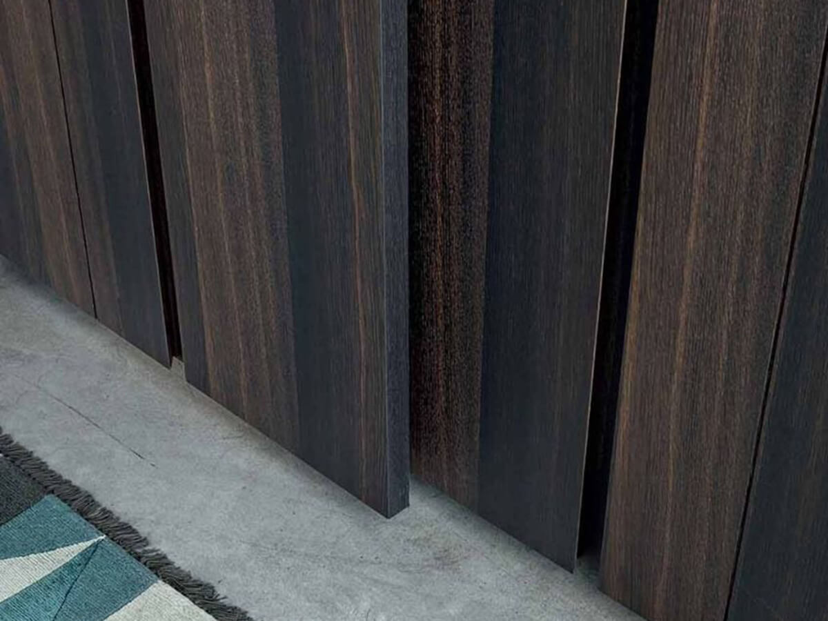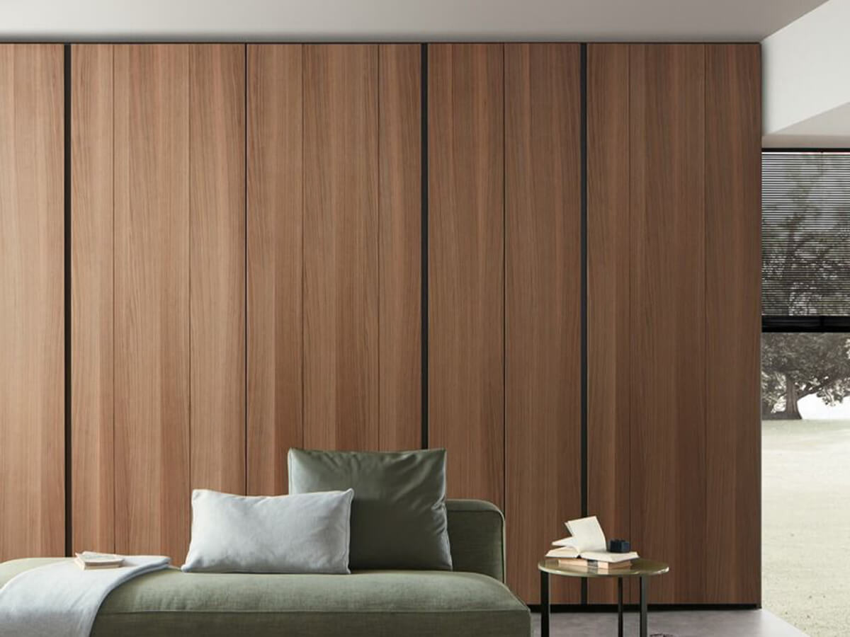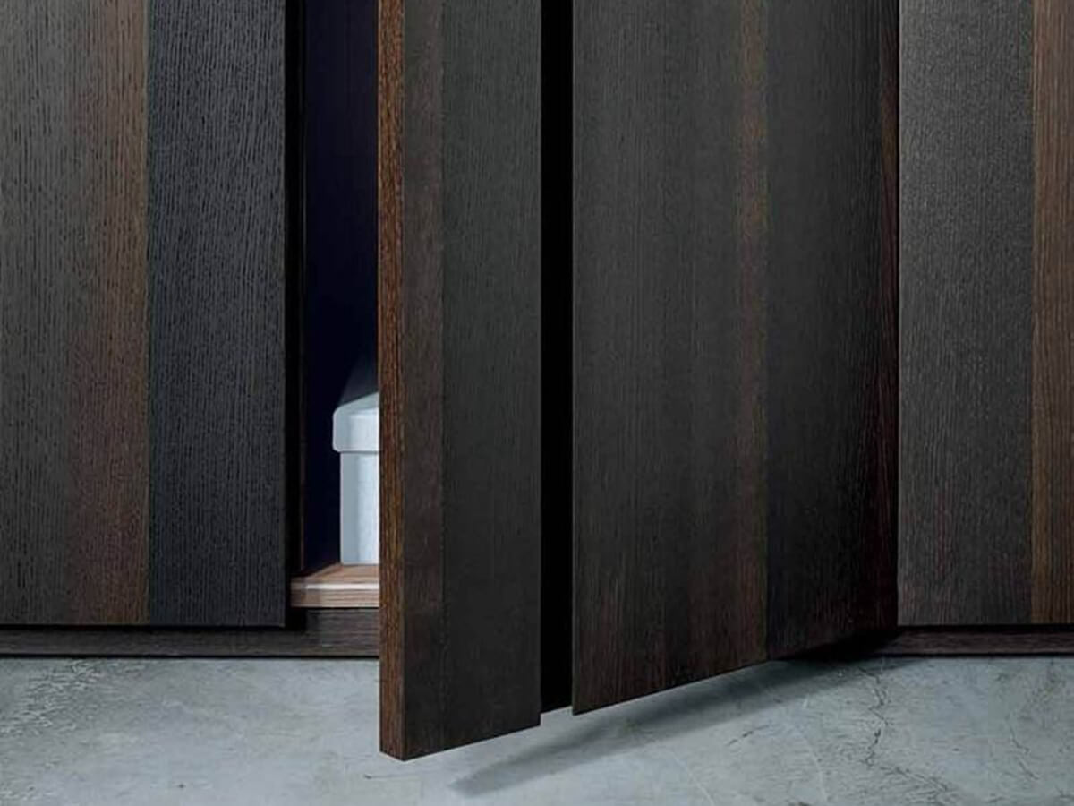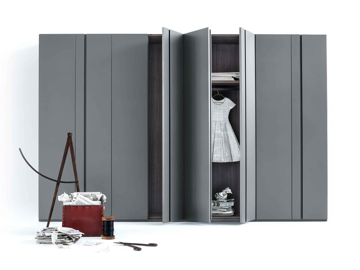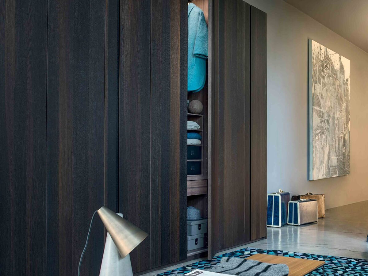 The Naica wardrobe by Lema, designed by the duo Cairoli & Donzelli, is characterized by the strong graphic sign of the grooves that run along the doors along their entire height, giving the composition a three-dimensional effect. Wider and recessed grooves then take on a handle function and contribute to the effect of dynamism, accentuated even more by the elegant wood grain for the wood finishes. The doors are also available in matt lacquered version and are available both for hinged wardrobes and for sliding and coplanar wardrobes: in this case a sophisticated compass opening system is used that allows them to be aligned by placing them on a single plane.Naica is part of the historic Lema Armadio al Centimetro collection, which allows extreme versatility by adapting to the most diverse design needs.