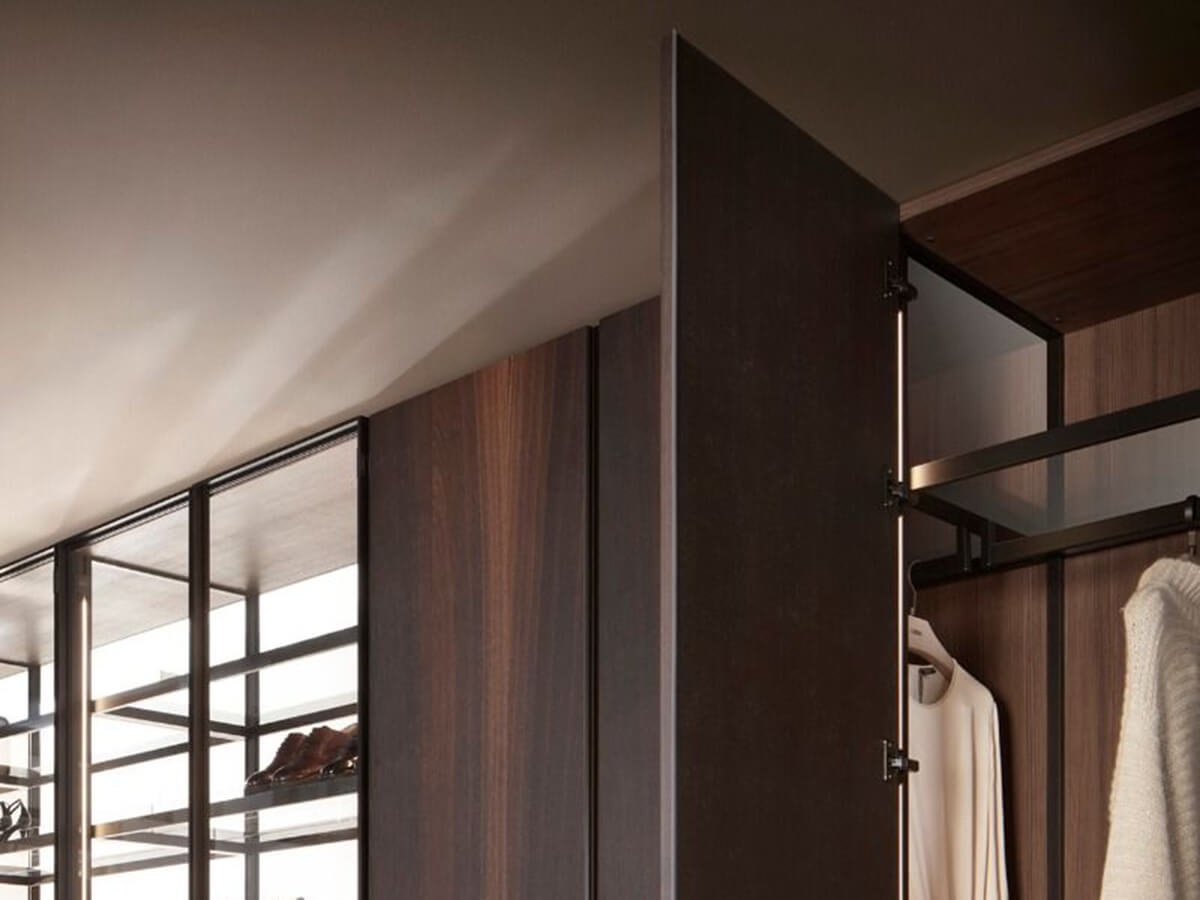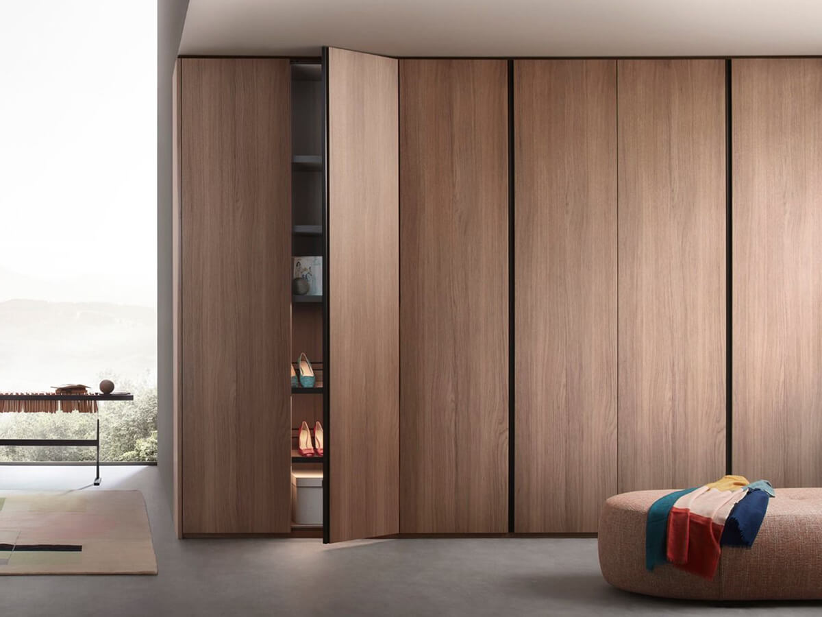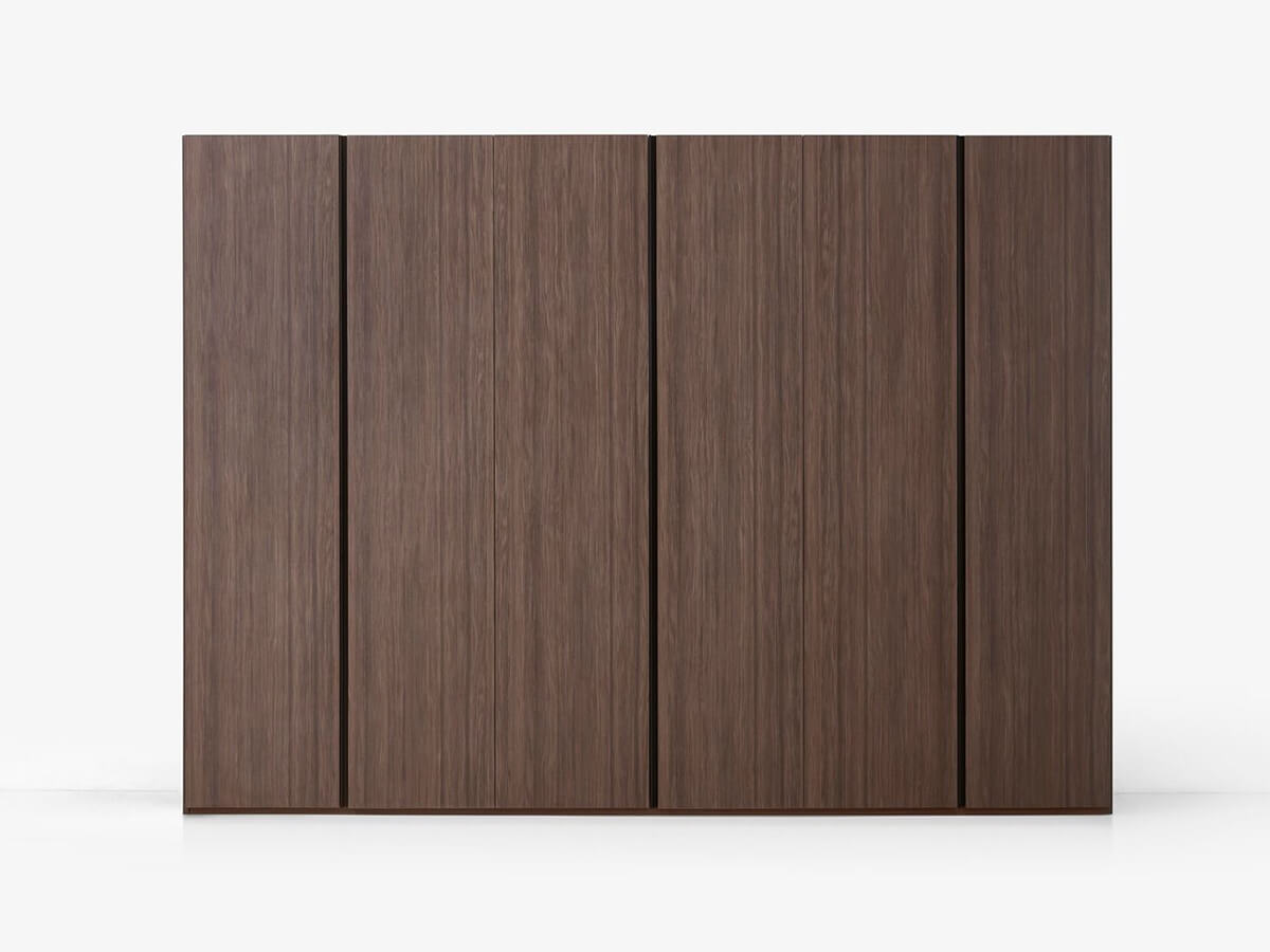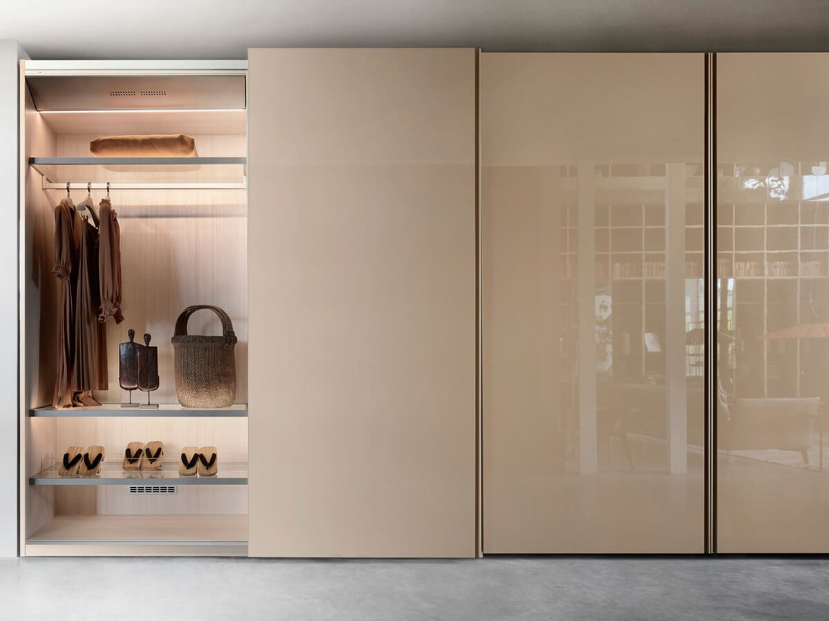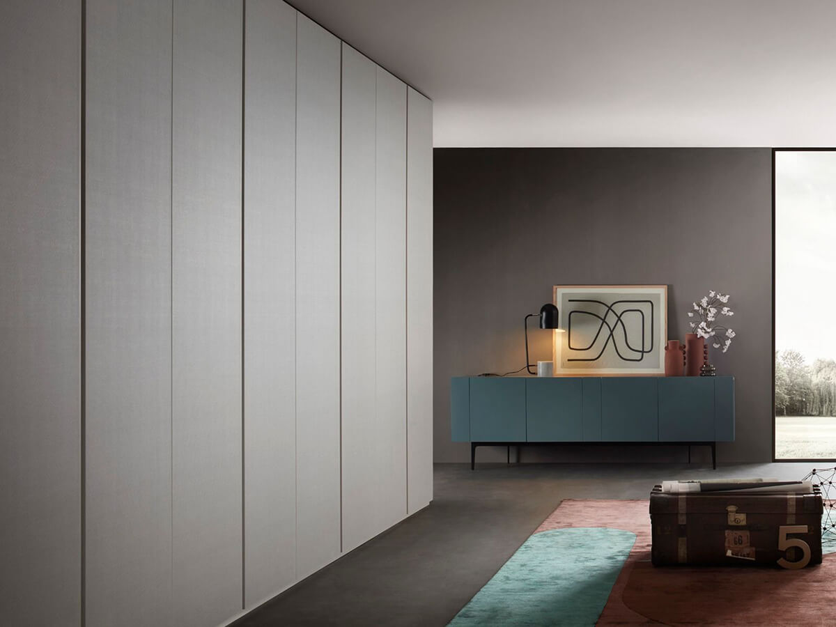 The Text wardrobe by Lema is one of the most famous and versatile variations of the famous "Armadio al Centimetro" collection, which allows the creation of flexible tailor-made projects for the sleeping area capable of meeting all kinds of needs. The same variety of proposals is also available for the internal equipment: from drawers to trouser racks, belt racks and shoe racks, in addition to the classic shelves and clothes hanger bars with integrated light.The Text door is characterized by the thin cut that runs along its entire height and which also acts as a groove handle, a delicate and composed graphic sign. The Text wardrobe can be made in a hinged, sliding or coplanar version and also allows a wide choice of finishes: glossy and matt lacquers, different natural or melamine essences.