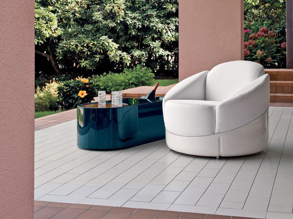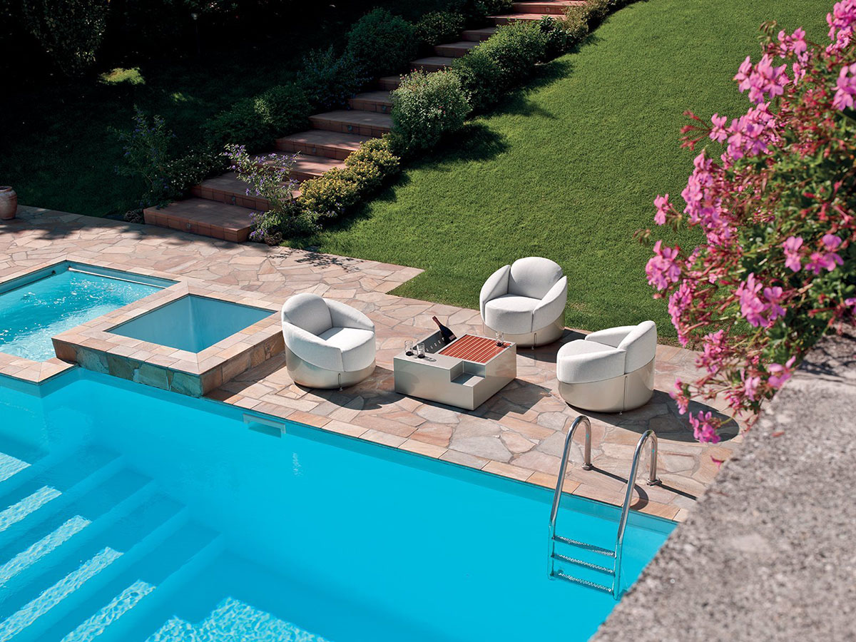 Refined and elegant Astrea is the outdoor armchair designed by the visionary Italian architect Joe Colombo and produced by Longhi. The structure is in fiberglass manually stratified in a mold and finished in Gealcoat, a waterproof resin in glossy white or black, which protects the fiberglass from the action of UV rays, saltiness and humidity. The shell is also available in metallic blue, gray and bronze colors which are applied manually with oven drying. The seat is made up of independent cushions in multi-density polyurethane foam and Dacron, covered in leather or fabric and with completely removable covers. Astrea lends itself to creating corners for poolside conversation but also convivial and relaxation areas on patios and verandas.