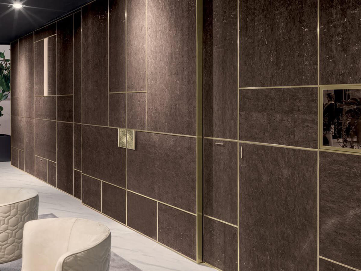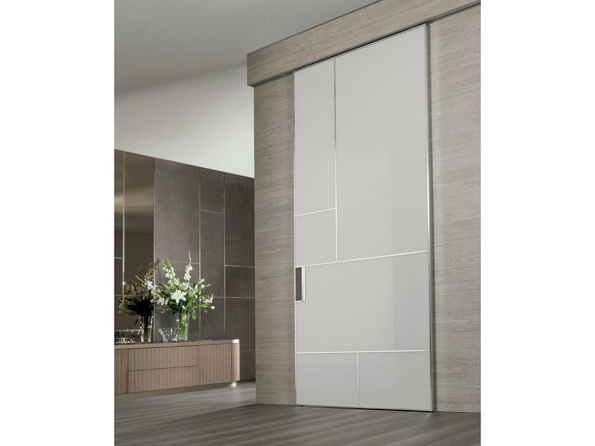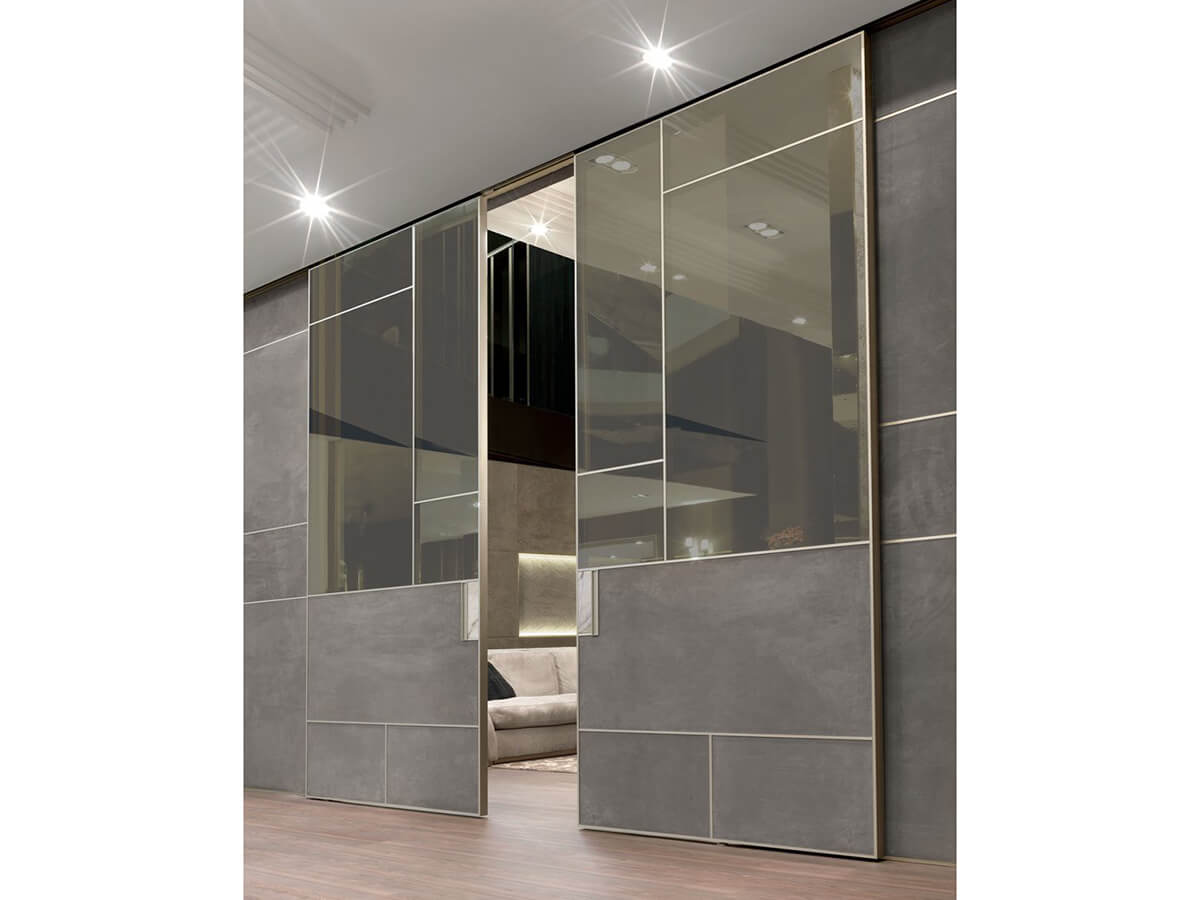 Signed by Alessandro La Spada, a well-known designer specializing in luxury projects, the design of the Land sliding door is based on a series of panels whose surface is divided into irregular square geometries that give it an elegant and luxurious effect. The subdivision lines of the panel reflect the finish of the frame and can also be made in very precious golden finishes. Land is conceived as a real overall architectural system: in addition to the sliding door, the series also consists of swing doors and boiserie that can thus give life to precious coordinated environments.
