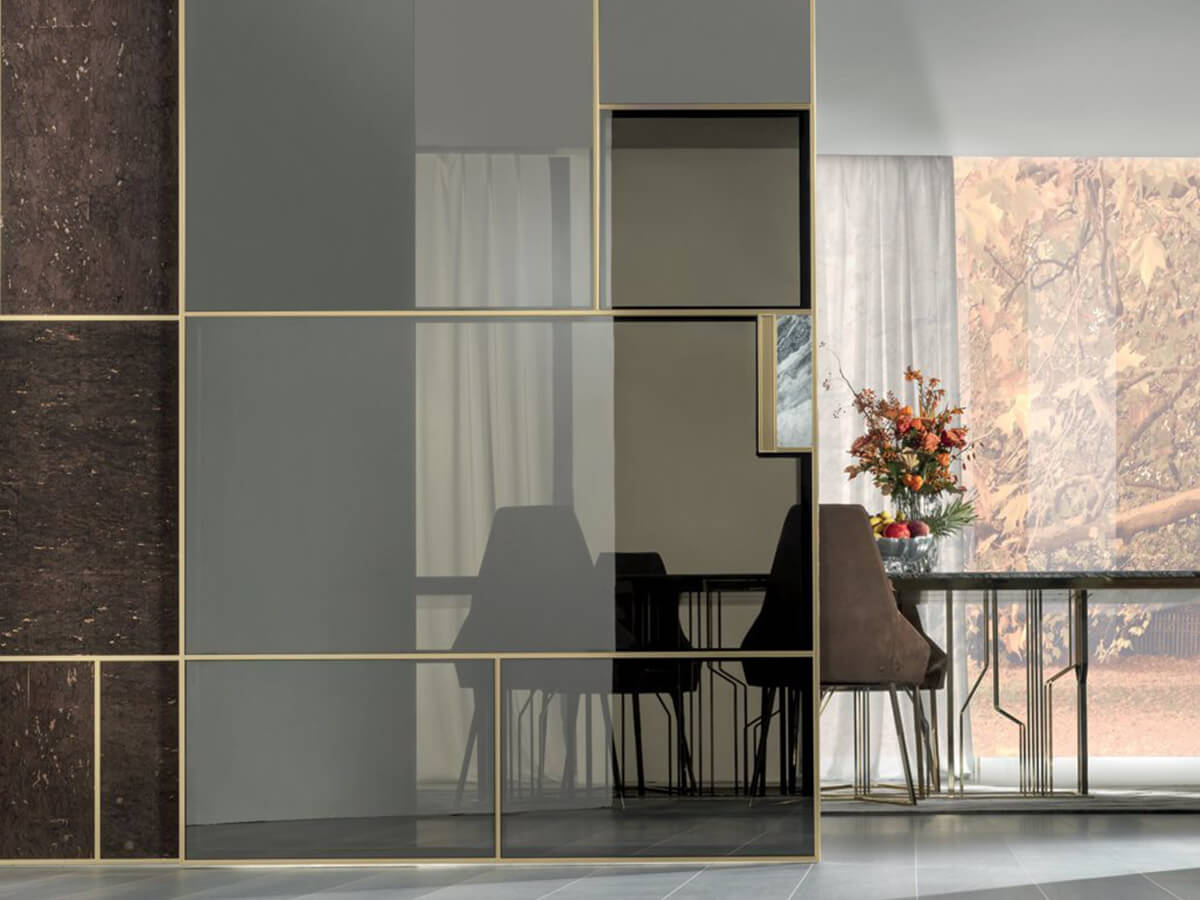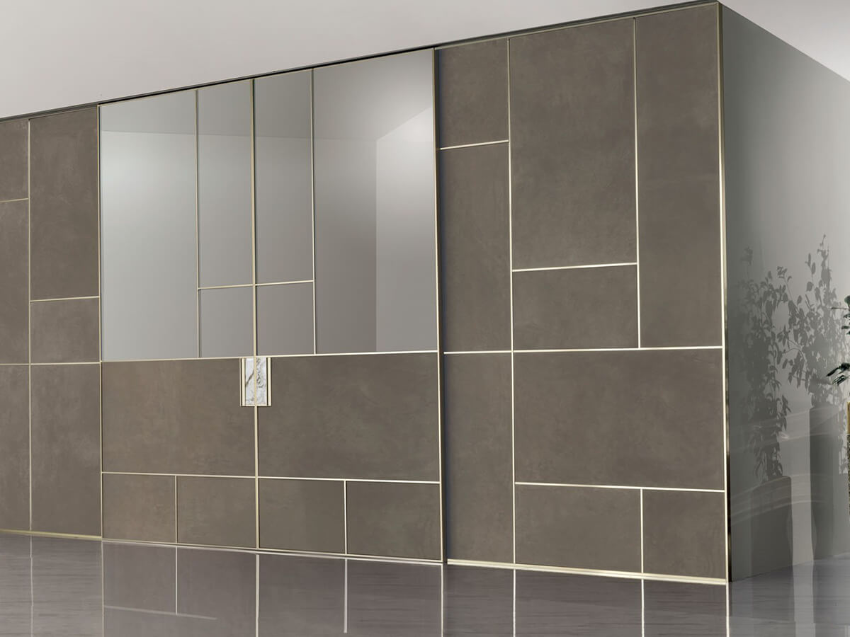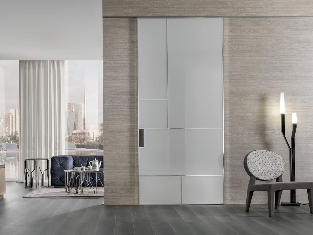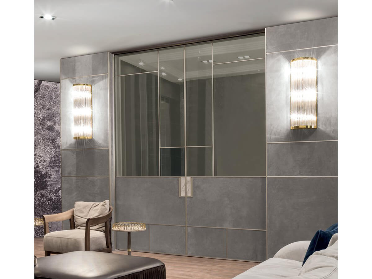 Signed by Alessandro La Spada, a well-known designer specializing in luxury projects, the design of the Land sliding door is based on a series of panels whose surface is divided into irregular square geometries that give it an elegant and luxurious effect. The subdivision lines of the panel reflect the finish of the frame and can also be made in very precious golden finishes. Land is conceived as a real overall architectural system: in addition to the sliding door, the series also consists of swing doors and boiserie that can thus give life to precious coordinated environments.