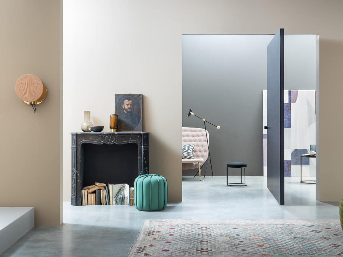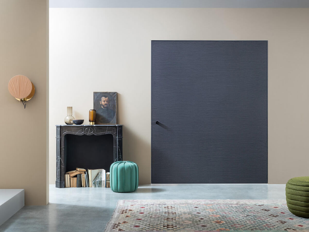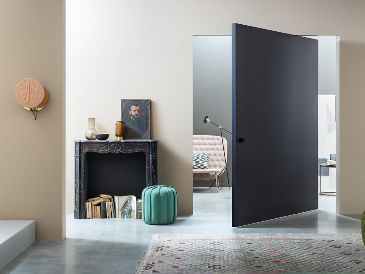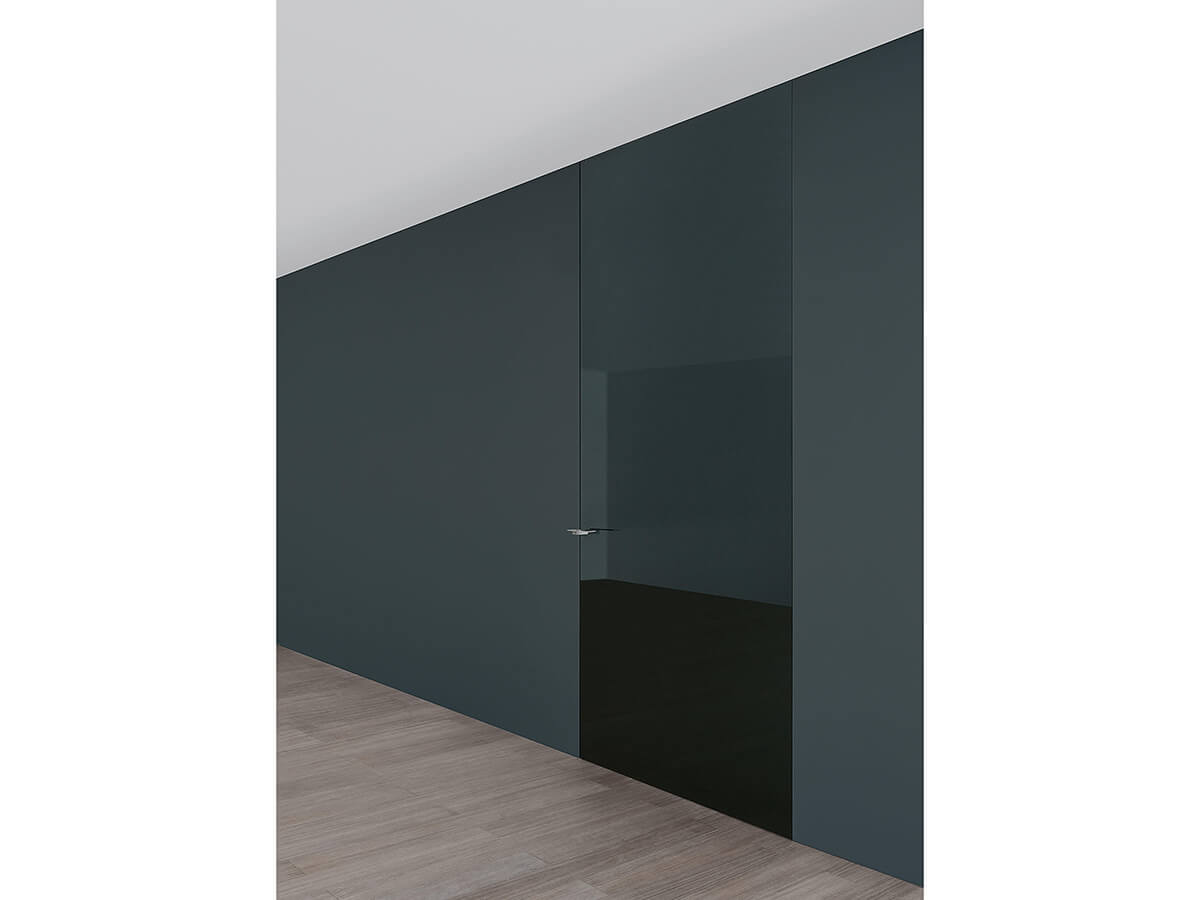 The Compass 55 model is a design pivot door that can count on the expertise of a premium brand like Lualdi, known throughout the world. Perfectly coplanar, when closed Compass 55 aligns itself with the wall in a discreet manner, revealing itself at the opening as a large and scenographic backdrop capable of connecting two spaces. The 55 mm thick door has a honeycomb structure and can be customized with a wide choice of finishes ranging from matt or glossy lacquers in various colors to different essences and woods. It is mounted on an anodized aluminum frame to be mounted on the wall and the opening is pivotal. Several options are available for closing: only one handle (to be chosen from the wide Lualdi range), handle and key, handle and latch or handle and safety cylinder.