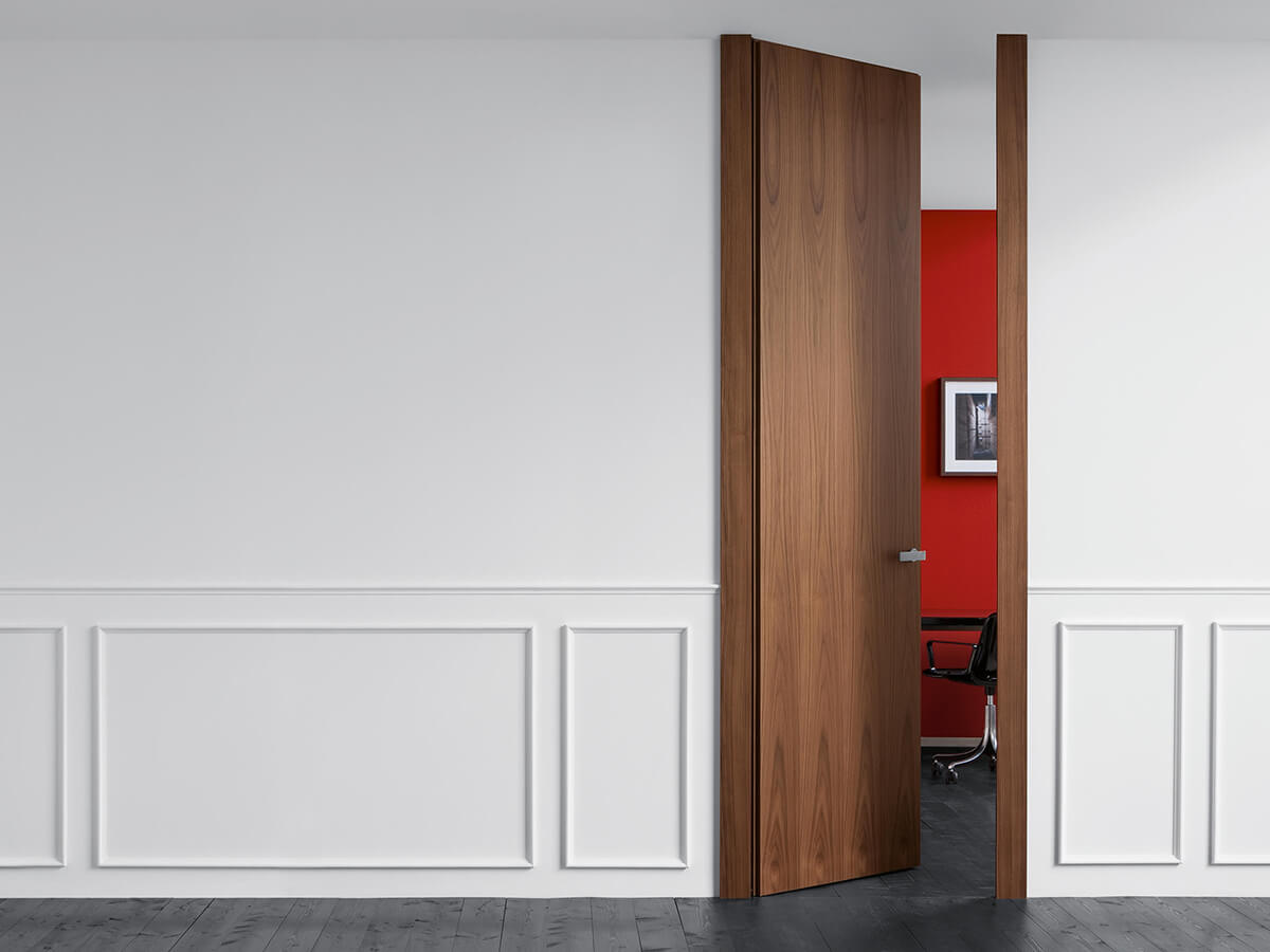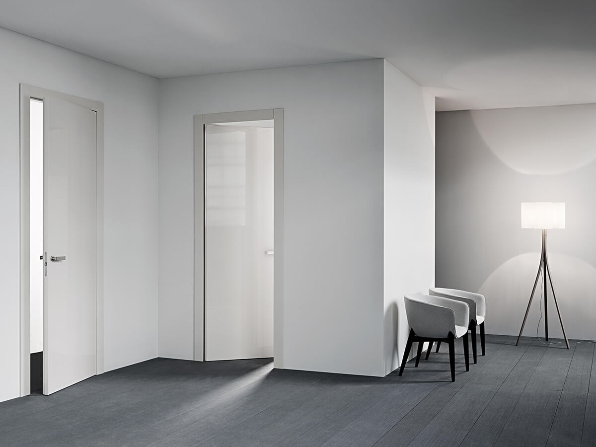 The Filo 55s / t model by Lualdi is a design swing door with a minimalist and contemporary look. Slender and essential, Filo 55s / t looks like a perfectly coplanar door to the jamb and the wall, perfect for coordinated use in large rooms where, thanks to its minimally invasive shapes, it guarantees an effect of continuity along the entire corridor. The door, with a large thickness of 55 mm, is made of wood with a honeycomb structure and is equipped with a magnetic lock, concealed hinges and anti-noise seals. Filo 55s / t is a highly versatile door, easily adaptable to both masonry and plasterboard projects.