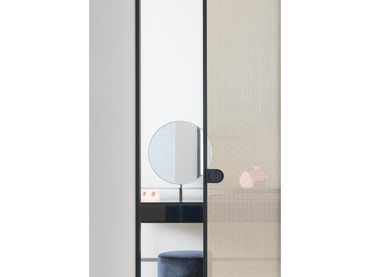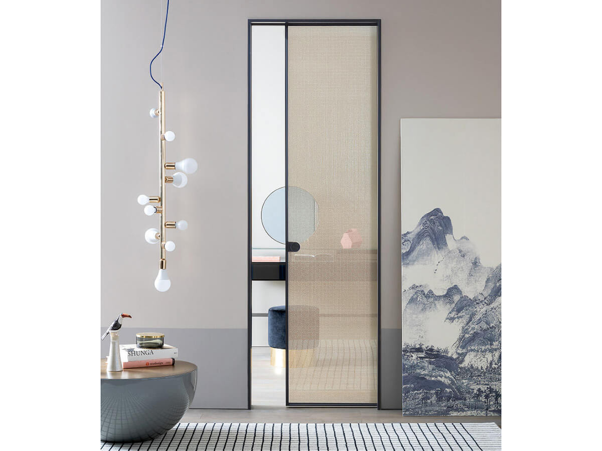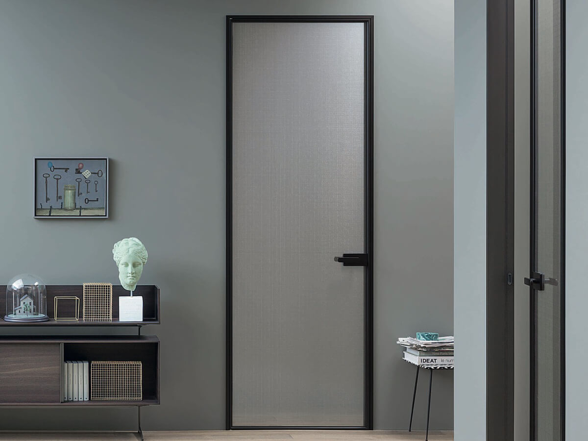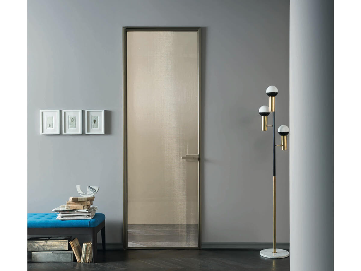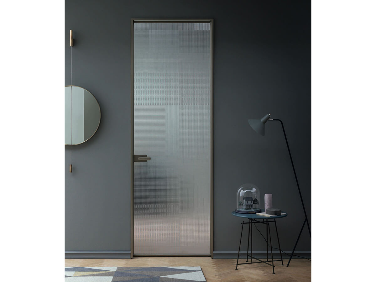 The L7 door by Lualdi, designed by Piero Lissoni, is proposed as a light and essential model, of refined minimalism. The glass door of L7 is enhanced by the outline of the aluminum metal profile, in a combination of materials that has always been a great classic in door design. In L7, however, this mix is enriched by a very wide selection of glass available: from the classic extra-clear transparent to a wide choice of colored dyes or more vivid retro lacquered dyes, but also real "special effects" such as glass with retina or the canneté processing of the Flutes glass, and much more. L7 is also available in the L7 Large version, with larger proportions.