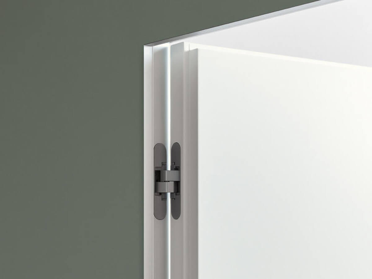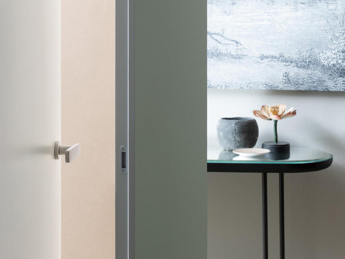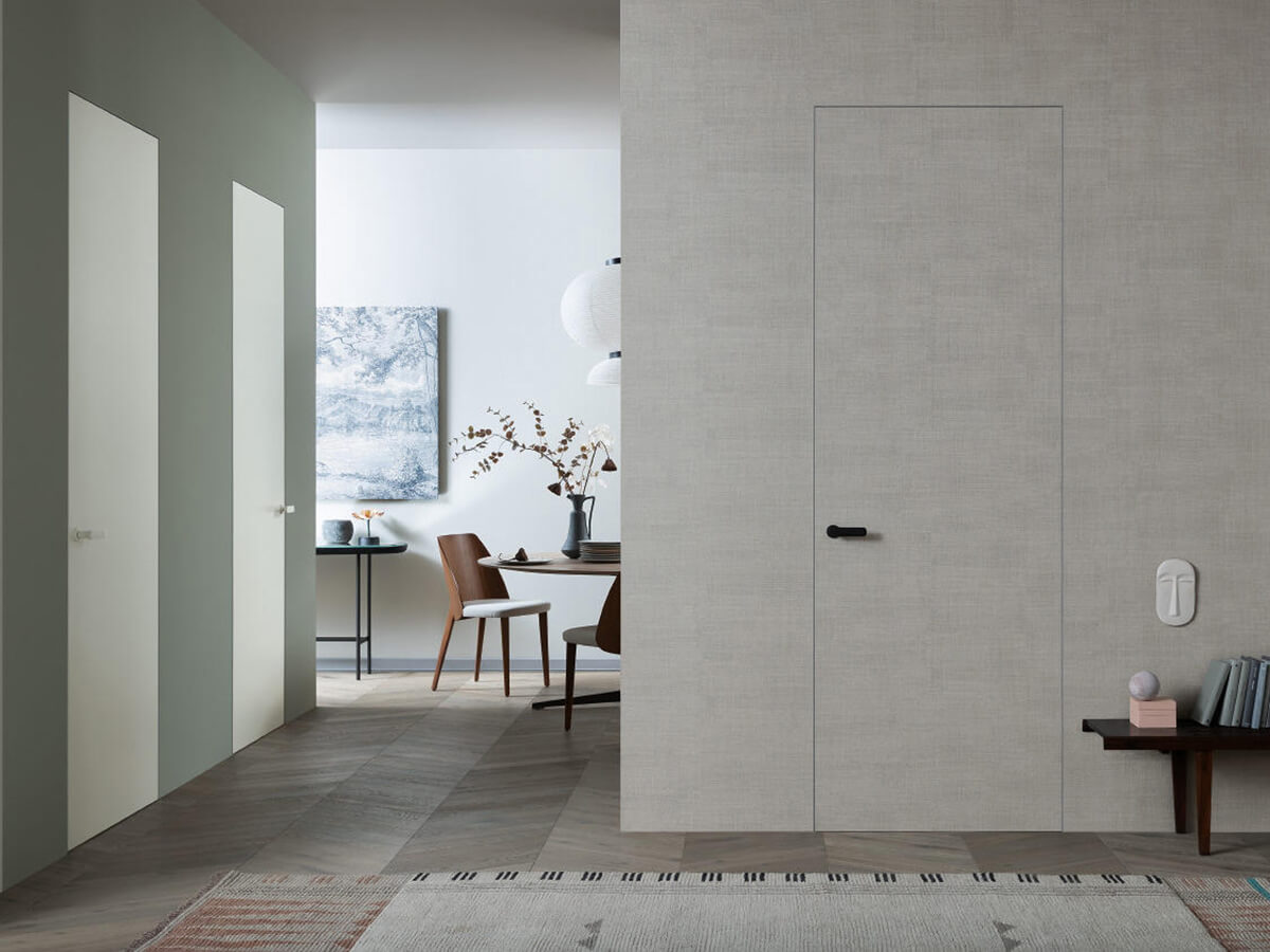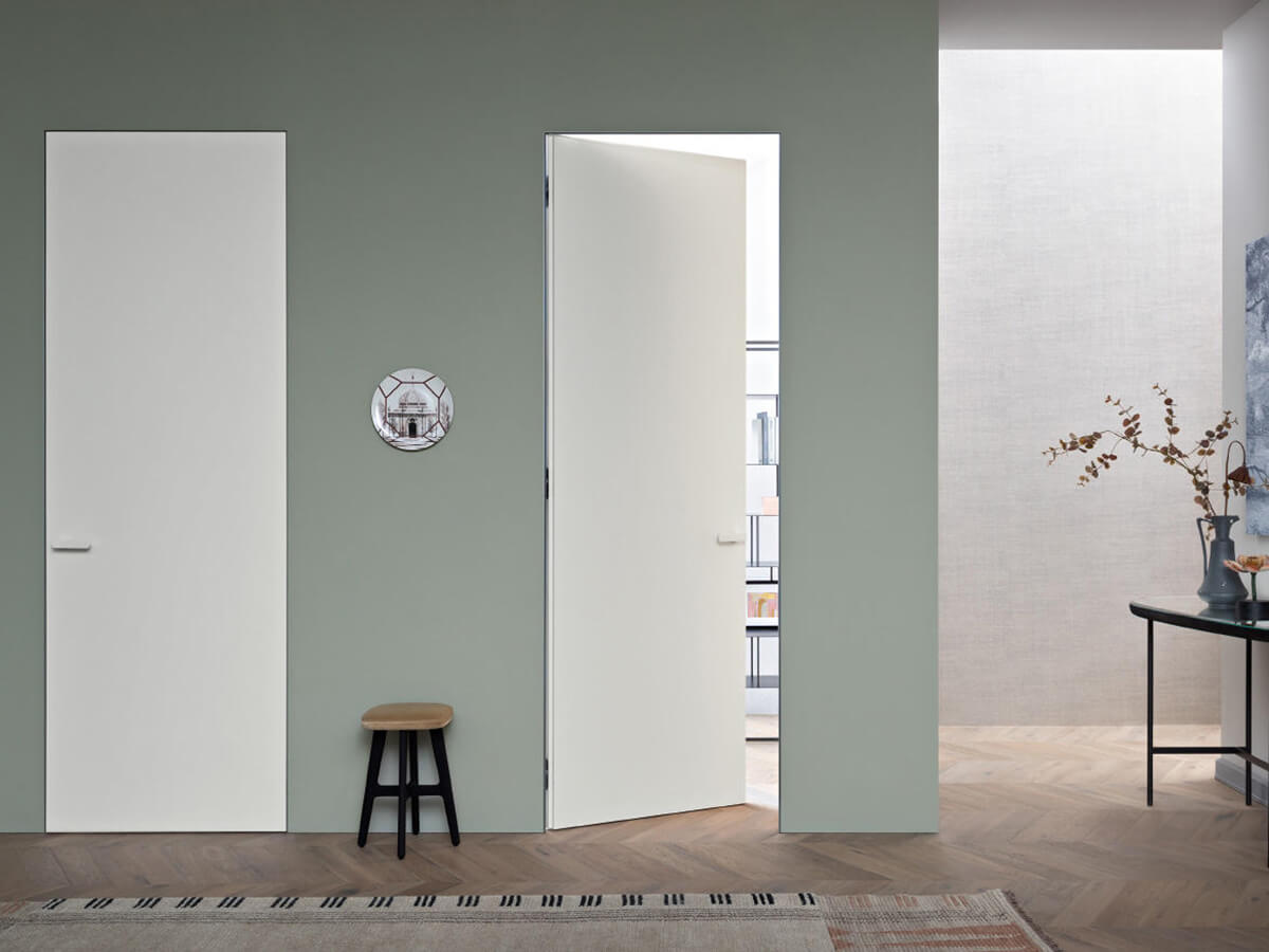 The Rasomuro 55s swing door is one of the great classics of the Lualdi catalog. This is the evolution of a historical model, made even more performing by the completely concealed hinges and the strong thickness of 55 mm. Rasomuro 55s aligns itself perfectly with the wall, blending effectively with it and thus allowing to create a great variety of always surprising design solutions. With strong architectural values, the Rasomuro 55s door can be customized through the choice of a wide range of different finishes and handles. The door is made of wood with a honeycomb structure, the frame is made of anodized aluminum and must be mounted in walls without a false frame.