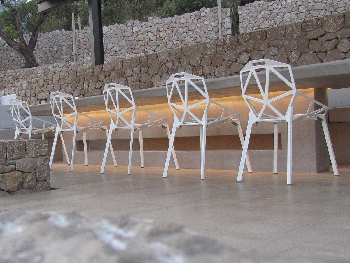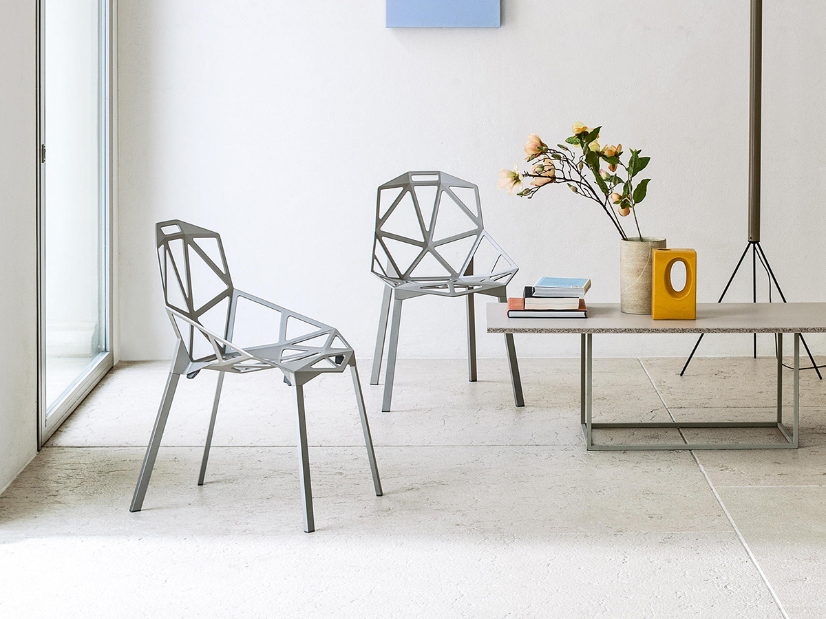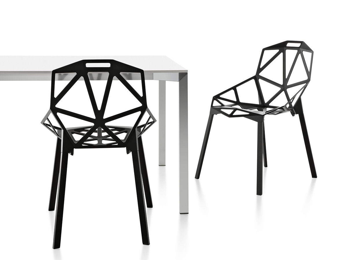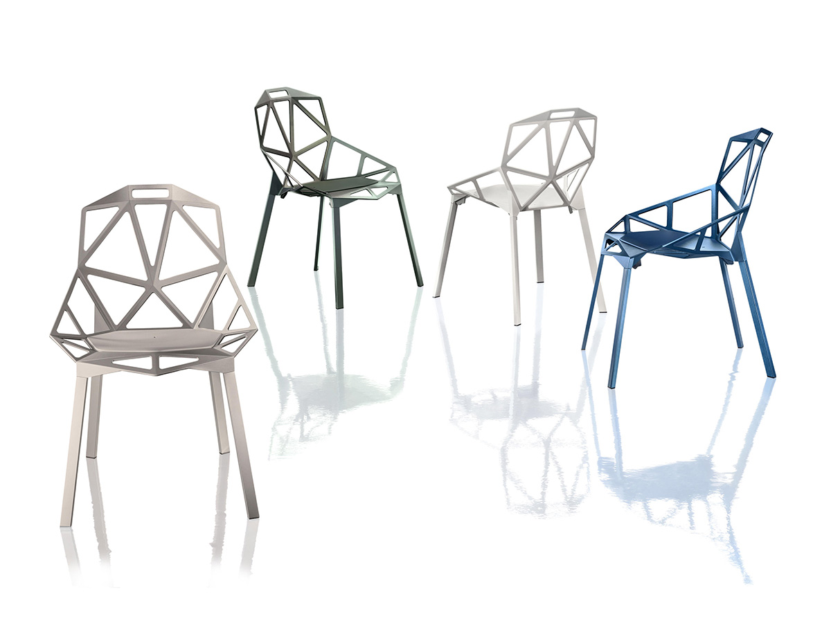 A seat with an almost impalpable flavor, capable of combining geometry, design and style in a single incredible summary that is well suited to the most extravagant tastes of those who love beautiful and well-made things. The work by Magis is characterized by the legs in anodized or painted aluminum profile and the seat in die-cast aluminum with a polyester painted fluo-titan treatment. Chair_One is suitable for both indoors and outdoors, an example of how furniture can be used regardless of conventions and rules. To improve comfort, Magis offers cushions in fabric or leather.