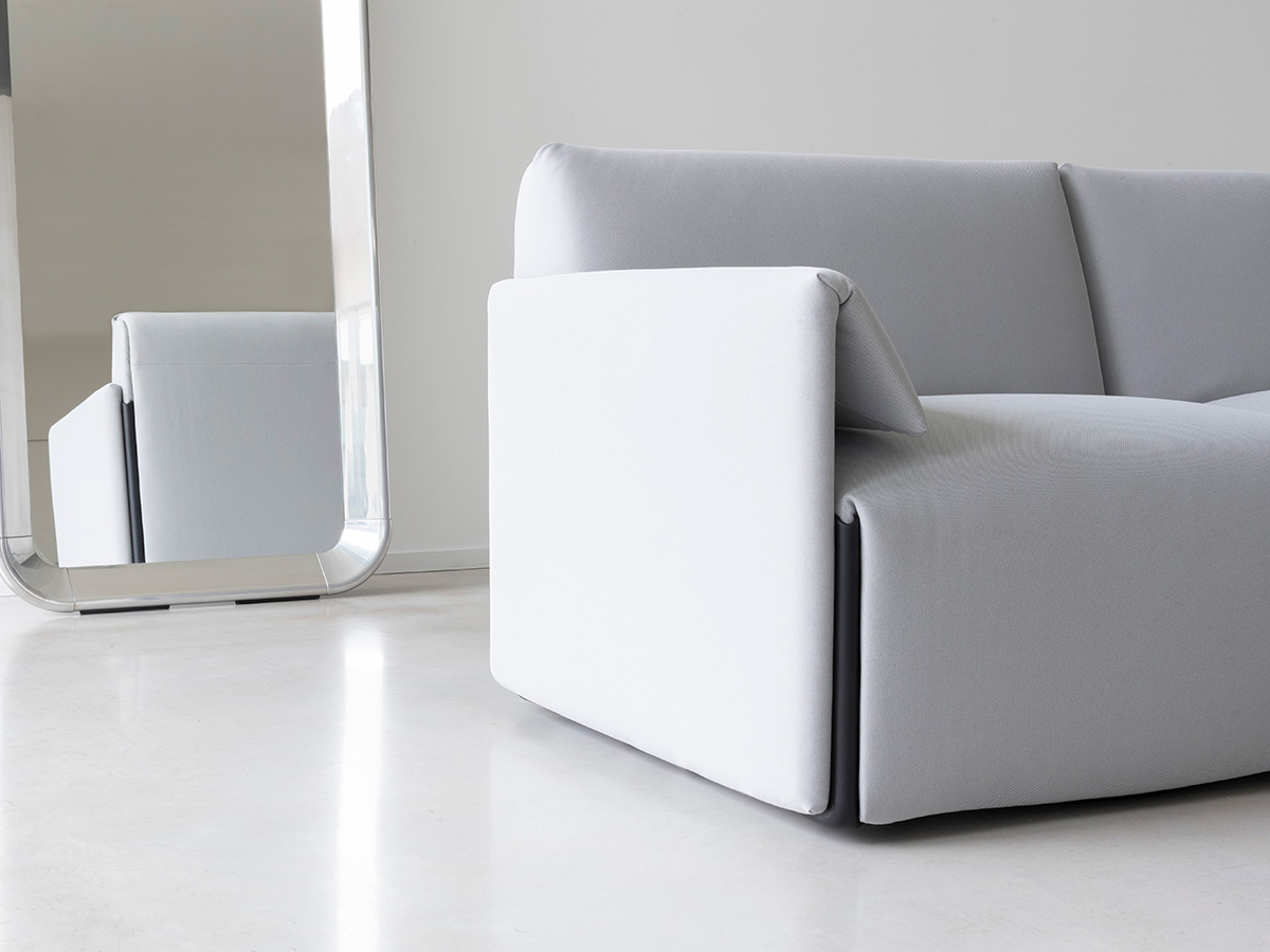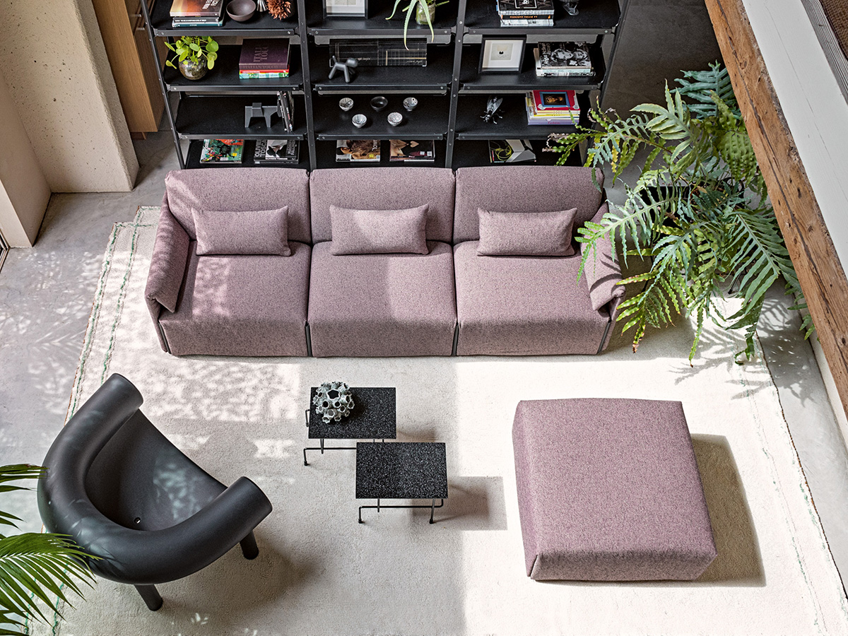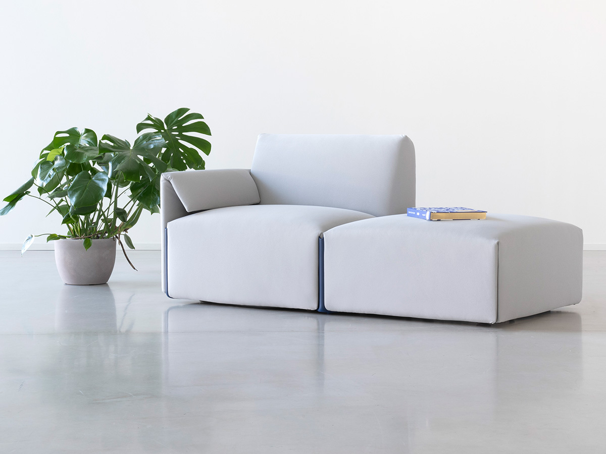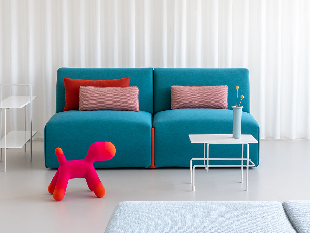 A modular sofa with essential and clear shapes, which fit well with contemporary taste and the typically modern home of the city. Costume has a structure made of recycled and recyclable polyethylene with a thickness of 4mm. The covering is available in different types of fabric to guarantee maximum compositional choice. Thanks to the elastic rings attached to the base, the sofa can be removed if necessary for washing or replaced over time. The modular system is made up of different units that can be freely positioned so as to create multifaceted and always new elements, perfect for any type of living or non-living context. The softness of the lines merges with a certain geometric rigor which instills security and makes possible the maximum freedom of expression.