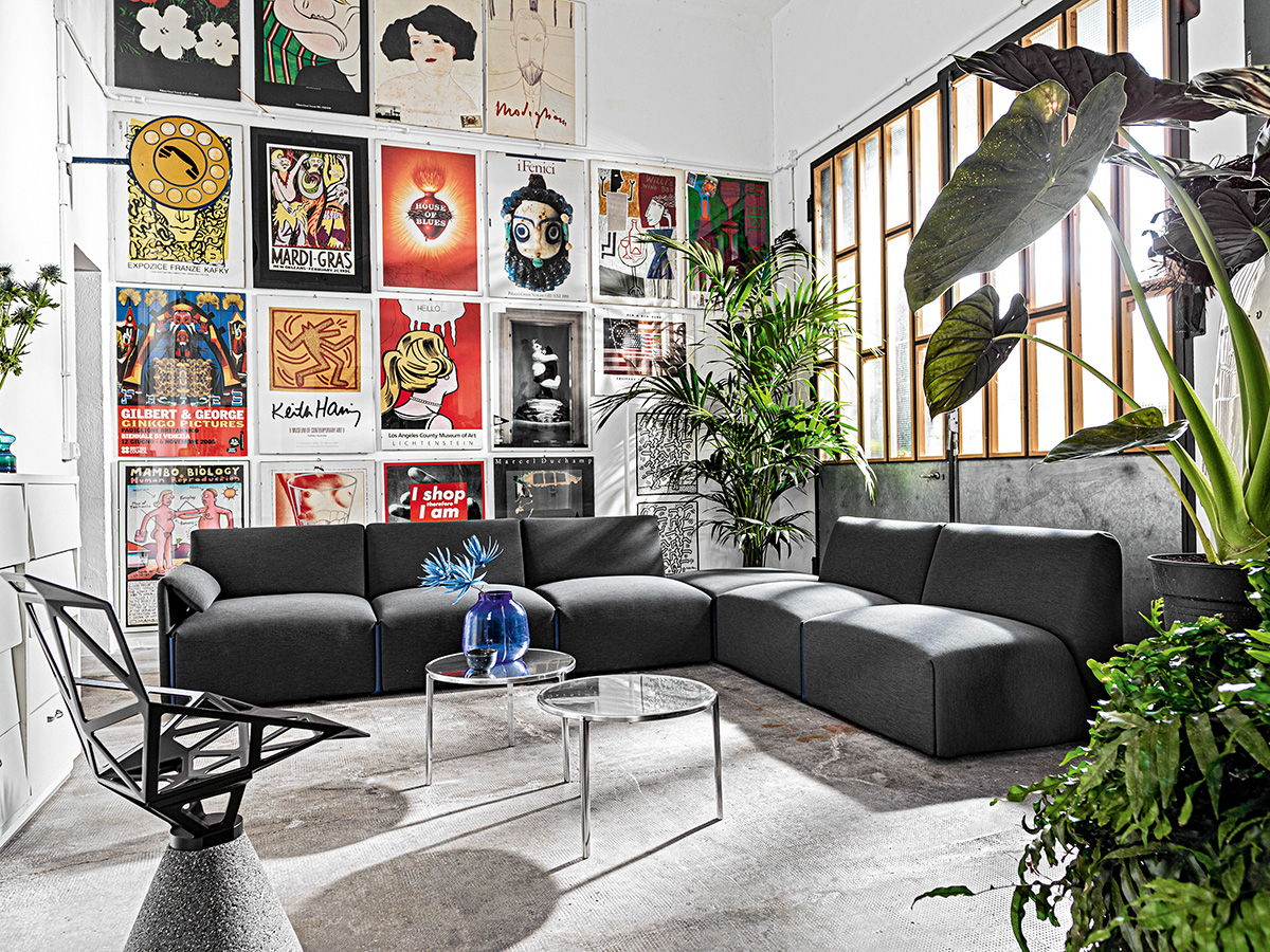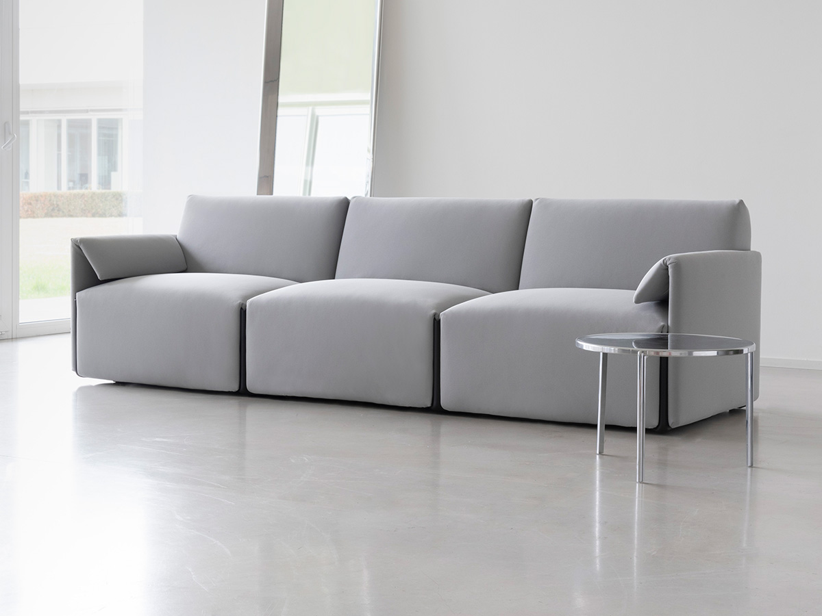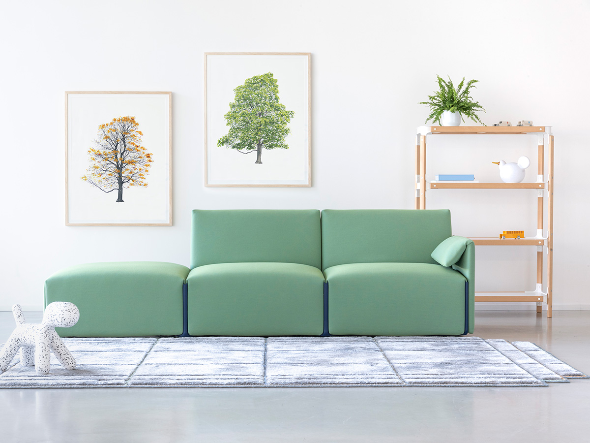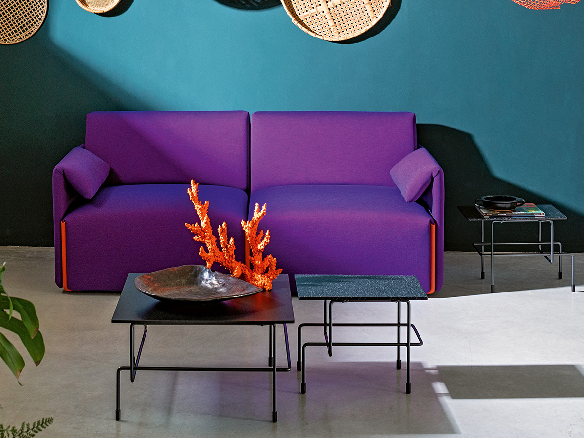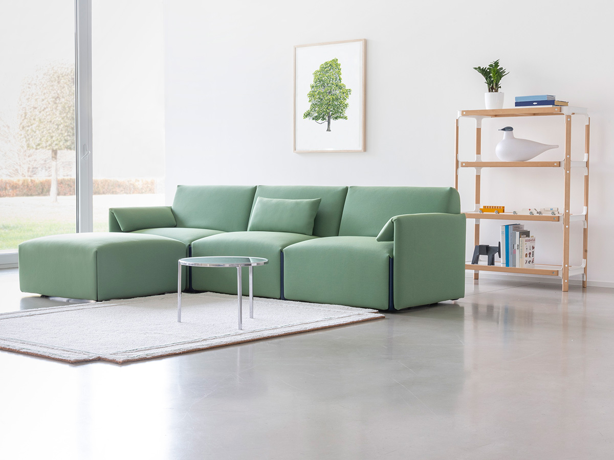 A modular sofa with essential and clear shapes, which fit well with contemporary taste and the typically modern home of the city. Costume has a structure made of recycled and recyclable polyethylene with a thickness of 4mm. The covering is available in different types of fabric to guarantee maximum compositional choice. Thanks to the elastic rings attached to the base, the sofa can be removed if necessary for washing or replaced over time. The modular system is made up of different units that can be freely positioned so as to create multifaceted and always new elements, perfect for any type of living or non-living context. The softness of the lines merges with a certain geometric rigor which instills security and makes possible the maximum freedom of expression.
