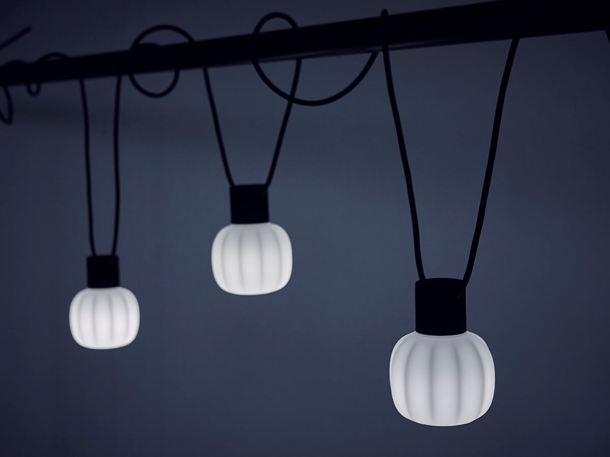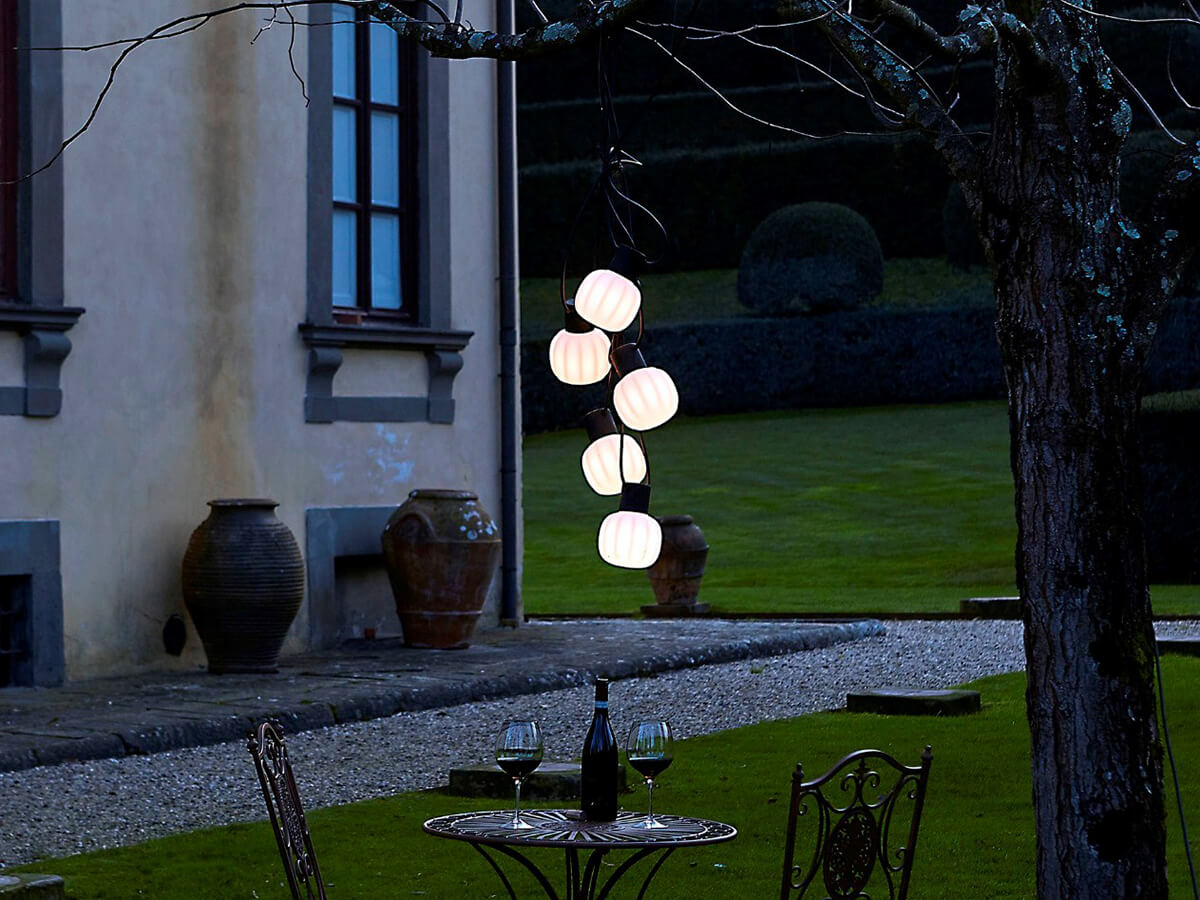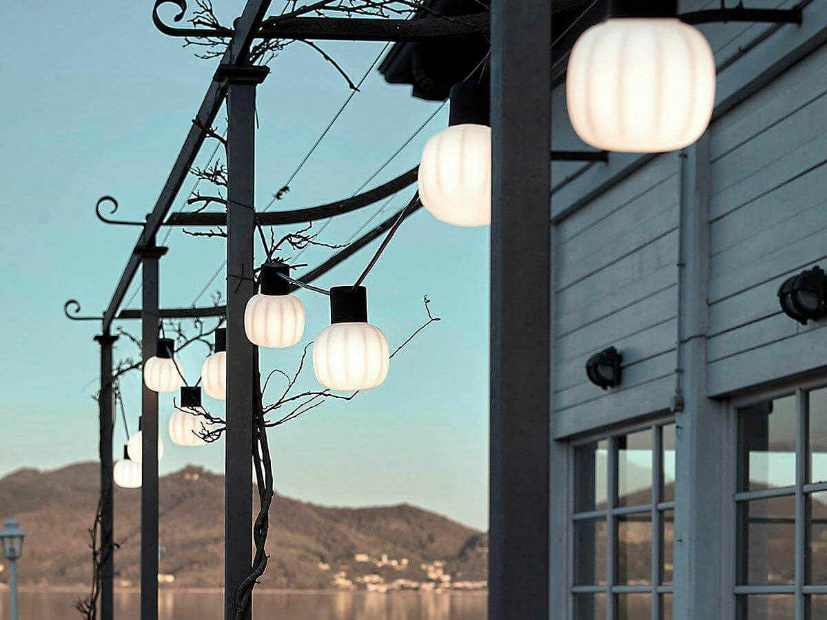 An incredibly inspired lamp, which from the imagination of Paola Navone has been able to enrich the imagination of the whole world, fully entering the homes of design enthusiasts and beyond. Kiki was born as a suspended lamp for outdoor use, made up of a minimum of three up to ten light points fixed at a distance of 100 centimeters from each other on a single electric cable. Kiki is available in three versions, with variable length to be able to better configure an ad hoc arrangement, adapting to the spaces in which you want to place it. The contained luminosity and the aesthetic beauty make it an ideal object for all types of exteriors such as gardens, terraces and much more.