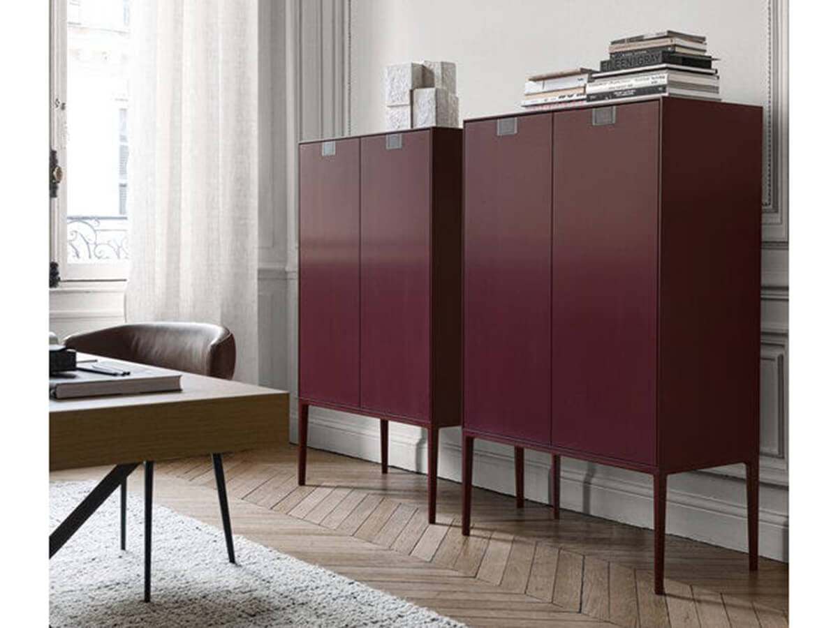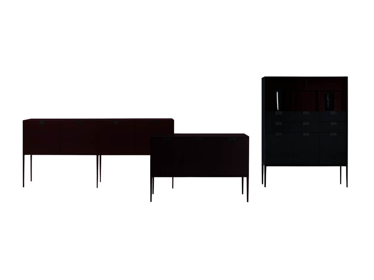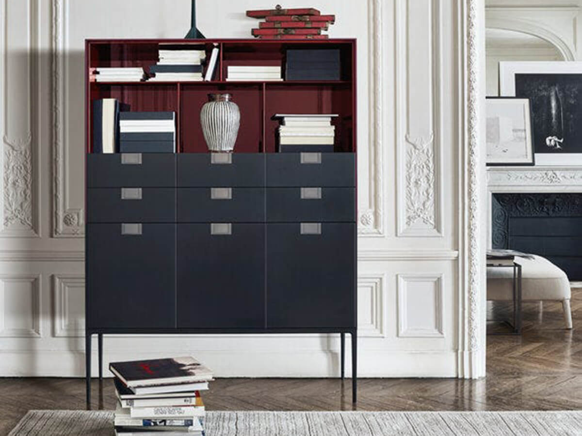 A sideboard with a rigorous and strongly geometric design, capable of enriching luxurious spaces with its rigor, careful to preserve a beauty free of smudges and frills. Alcor is a sideboard designed by Antonio Citterio for Maxalto and belongs to the family of sideboards and consoles of the Lux collection. Here it is possible to admire highly rigorous shapes combined with precious surfaces in lacquered and varnished with shellac with a wood effect. The precious physiognomy of Alcor makes it a perfect complement for studies, offices, classy living rooms and crossing spaces where you feel the need to add an element of rigor. Technical features: classic version internal structure in glossy red with bronzed nickel painted handles; damier version with fronts with an inlaid checkerboard decoration